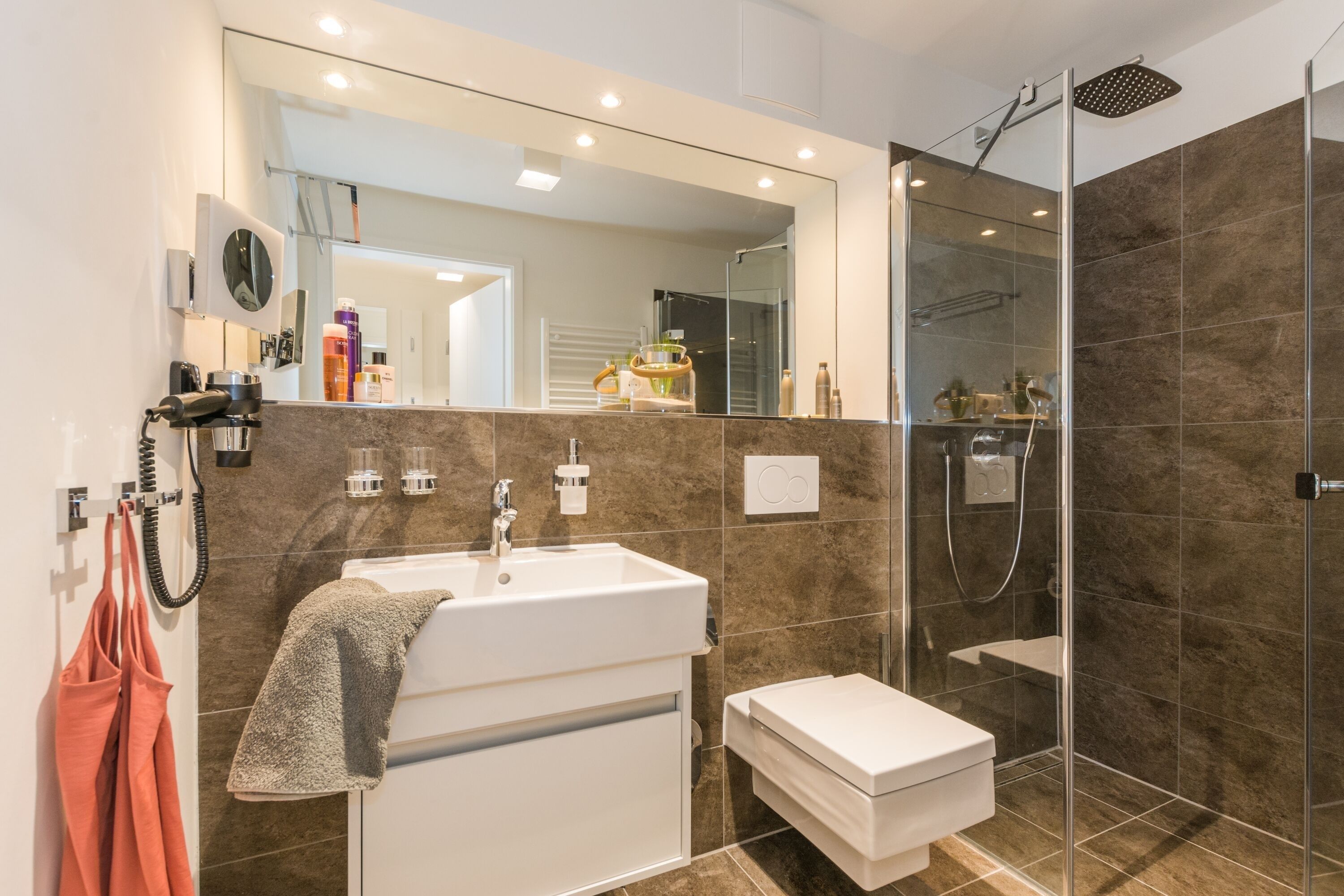 Das moderne Badezimmer mit ebenerdiger Dusche überzeugt durch zeitgemäßen Komfort. Die Wohnung ist eine Nichtraucher-Unterkunft und durchgehend stilvoll eingerichtet.