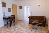 Das Wohnzimmer ist mit einer modernen Schlafcouch (Aufbettung für 2 Personen), TV, einem Esstisch und einer Küchenzeile mit Backofen und Kühlschrank eingerichtet. Im Schlafzimmer befindet sich ein gemütliches Doppelbett mit Kleiderschrank. Das freundliche Tageslichtbad hat eine Badewanne und ein WC. Zum Entspannen und Sonne tanken lädt die Terrasse direkt vor der Wohnung ein.
