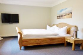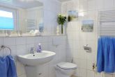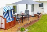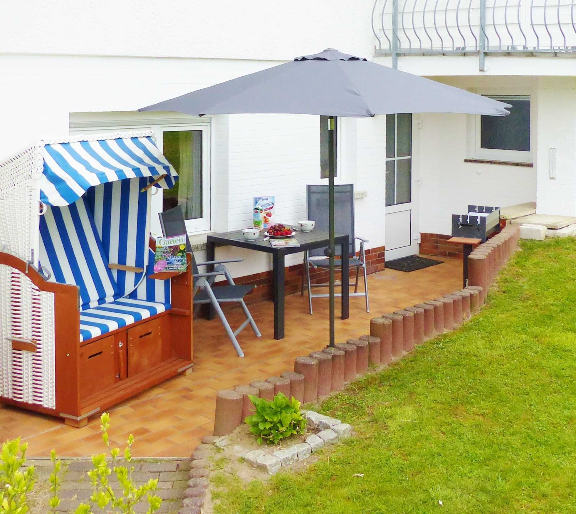 Besonders schön ist die windgeschützte Terrasse, die mit Strandkorb, Tisch, Stühlen und Sonnenschirm ausgestattet ist.