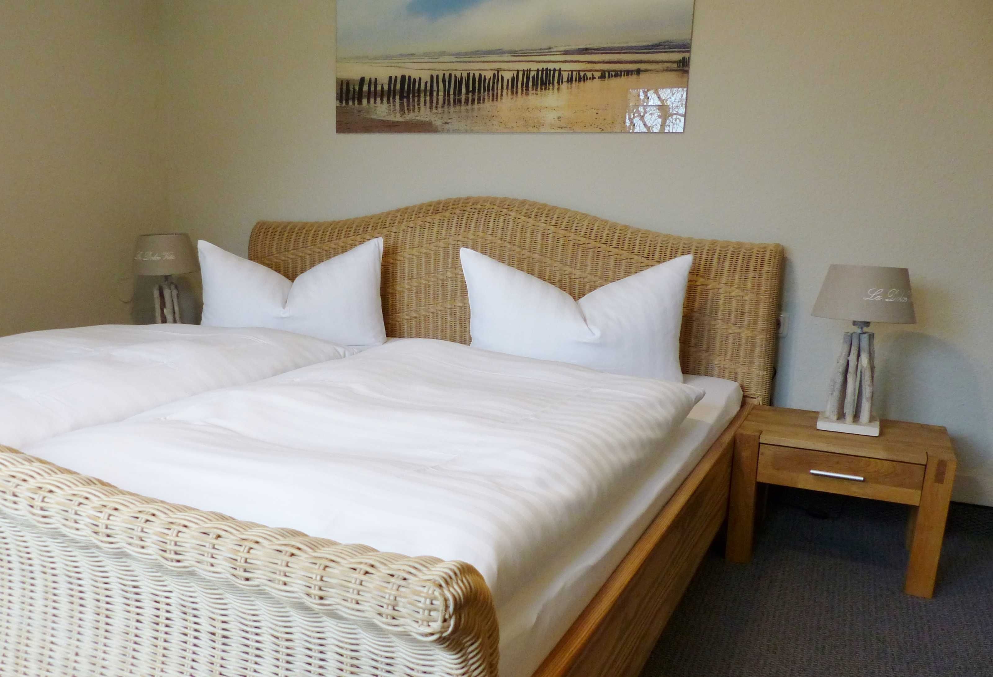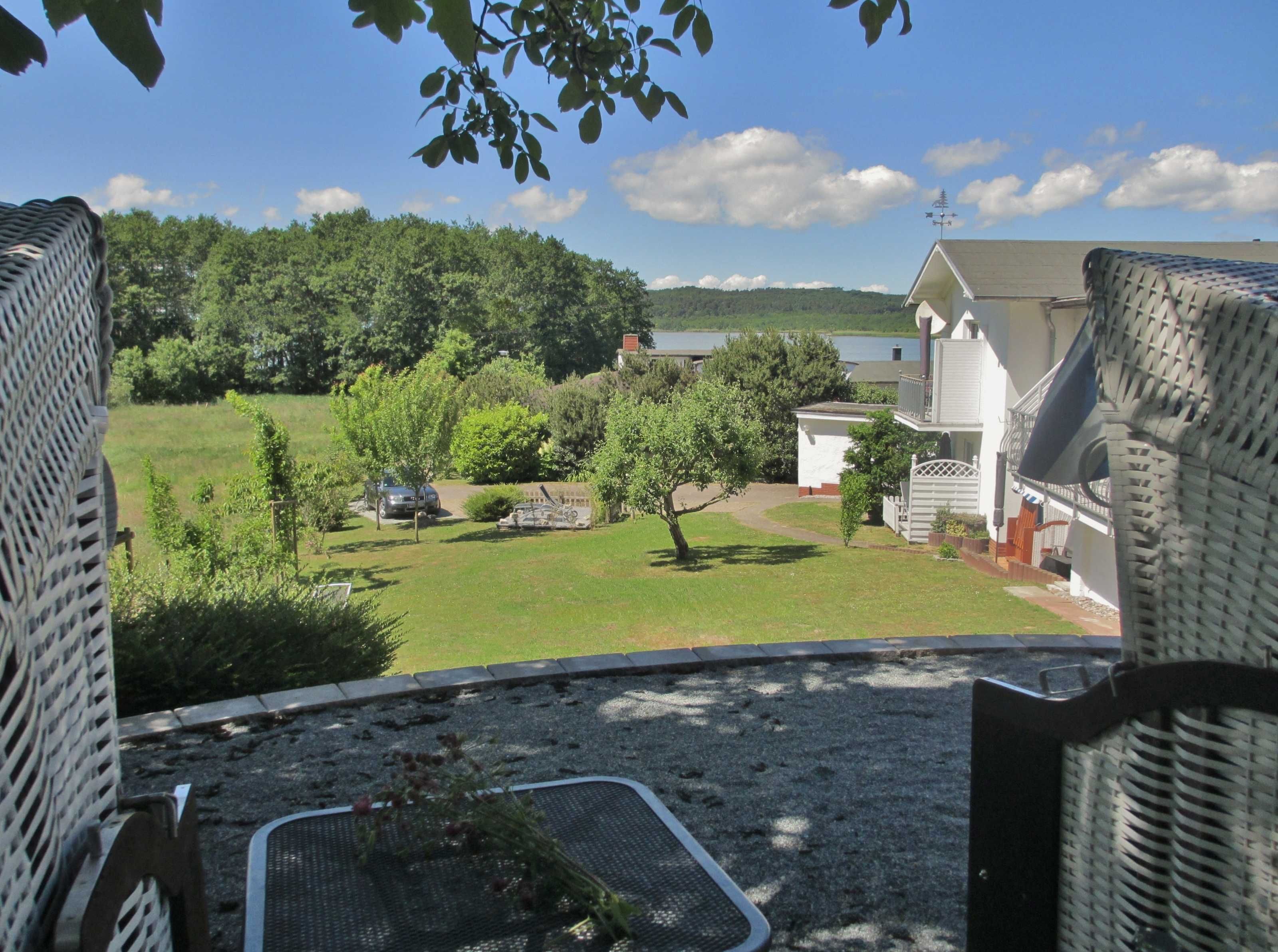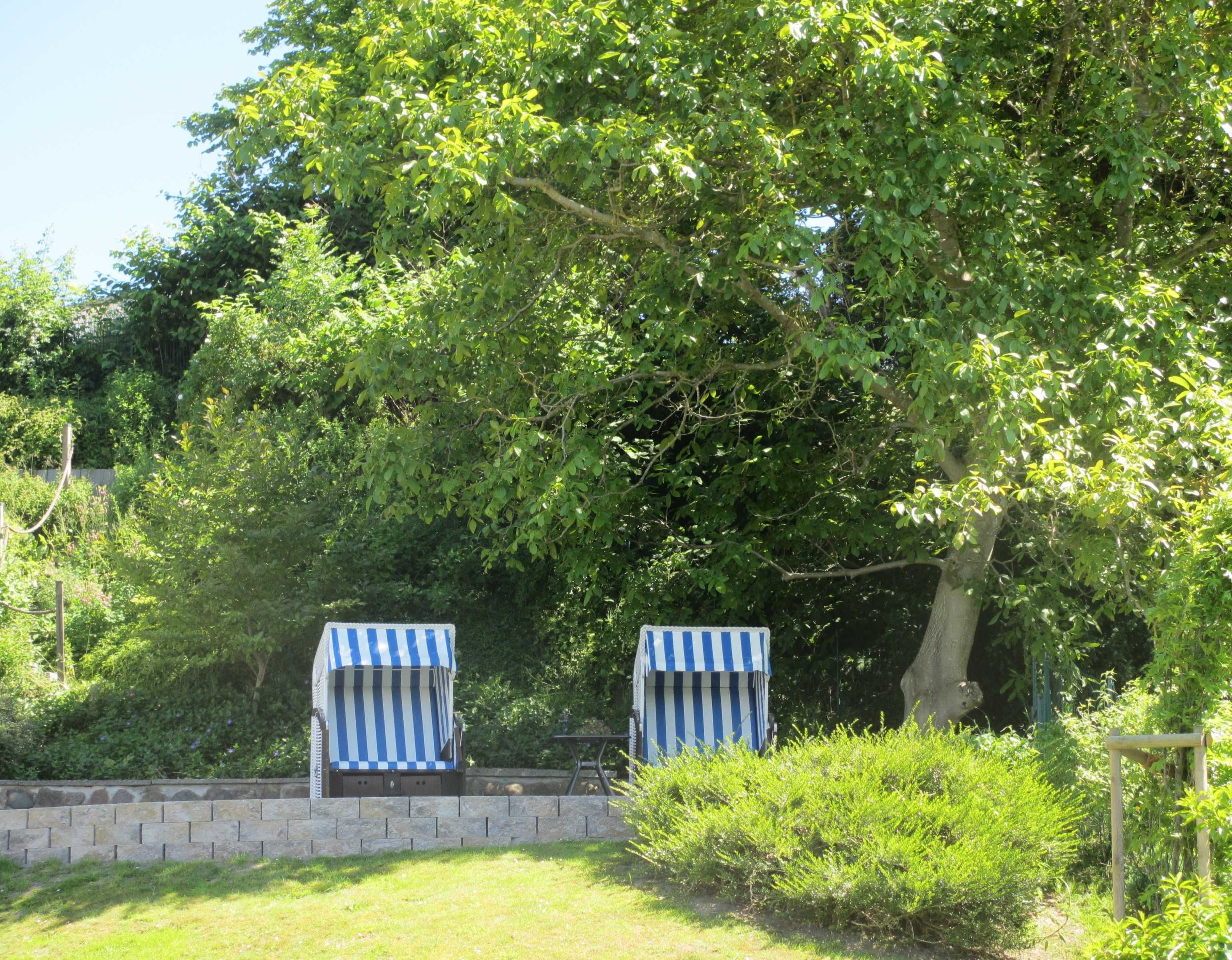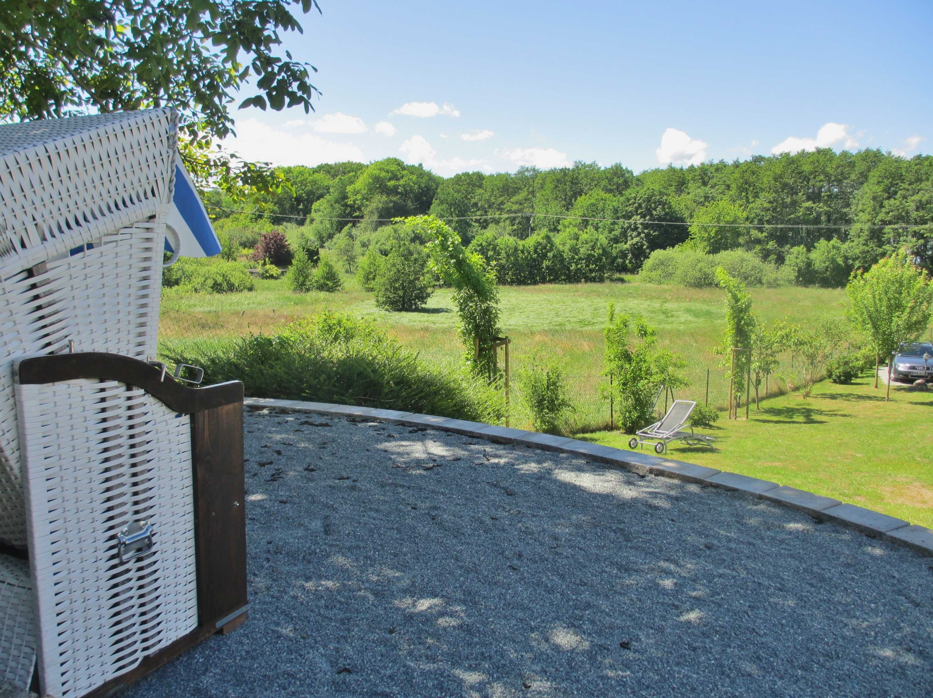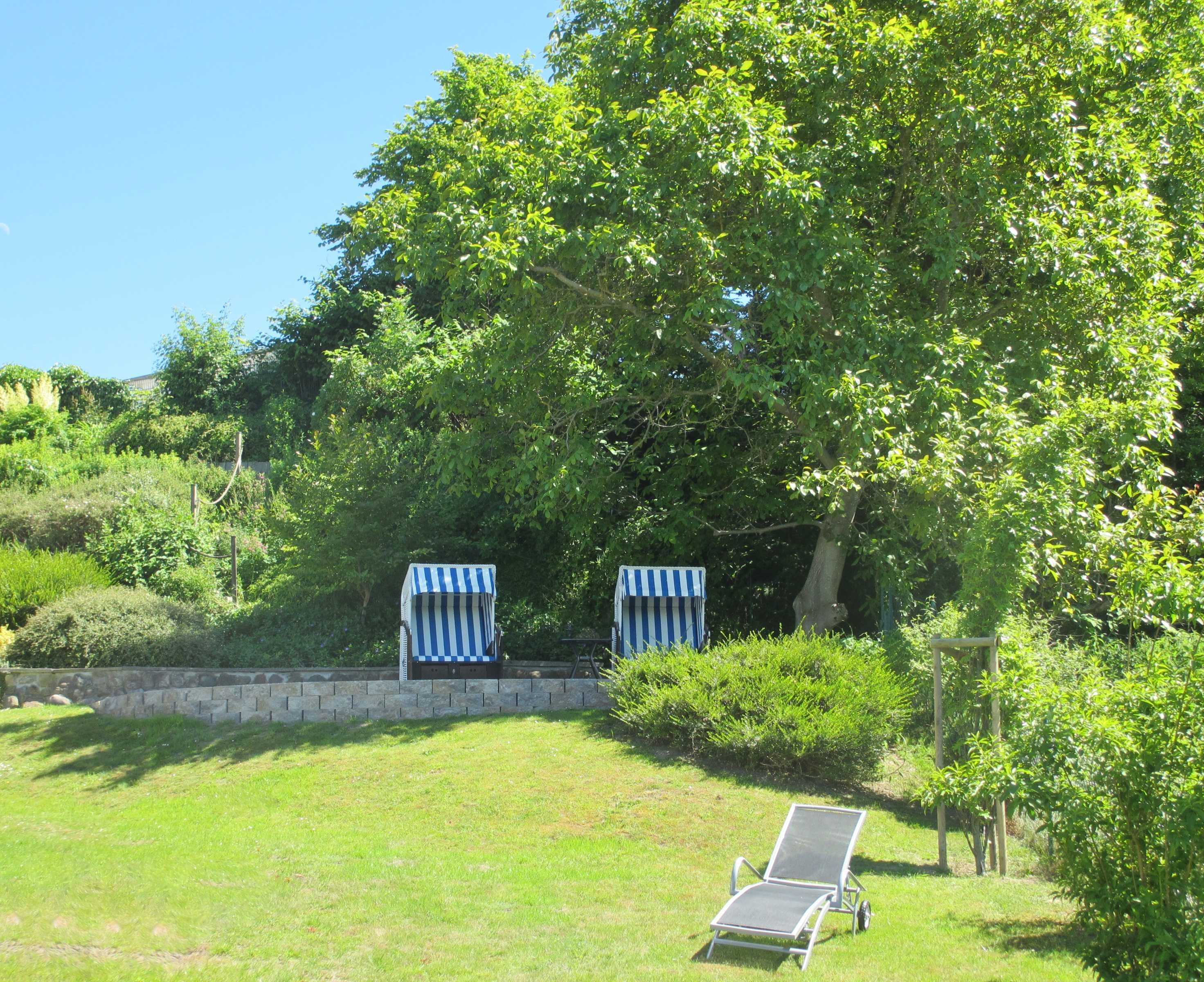 Wir empfehlen unsere separate Strandkorbterrasse im oberen Bereich des Gartens. Hier können Sie den Sonnenuntergang über dem Schmachter See bei einem Glas Wein genießen.