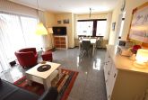 Der Wohnbereich lädt mit einem gemütlichen Sofabereich, einem Esstisch mit Stühlen sowie einem TV mit Kommode zum Entspannen ein.