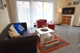 Vom Wohnzimmer aus gelangen Sie auf die große Südterrasse - der perfekte Ort für ein Frühstück in der Sonne oder einen entspannten Abend nach einem Strandtag.