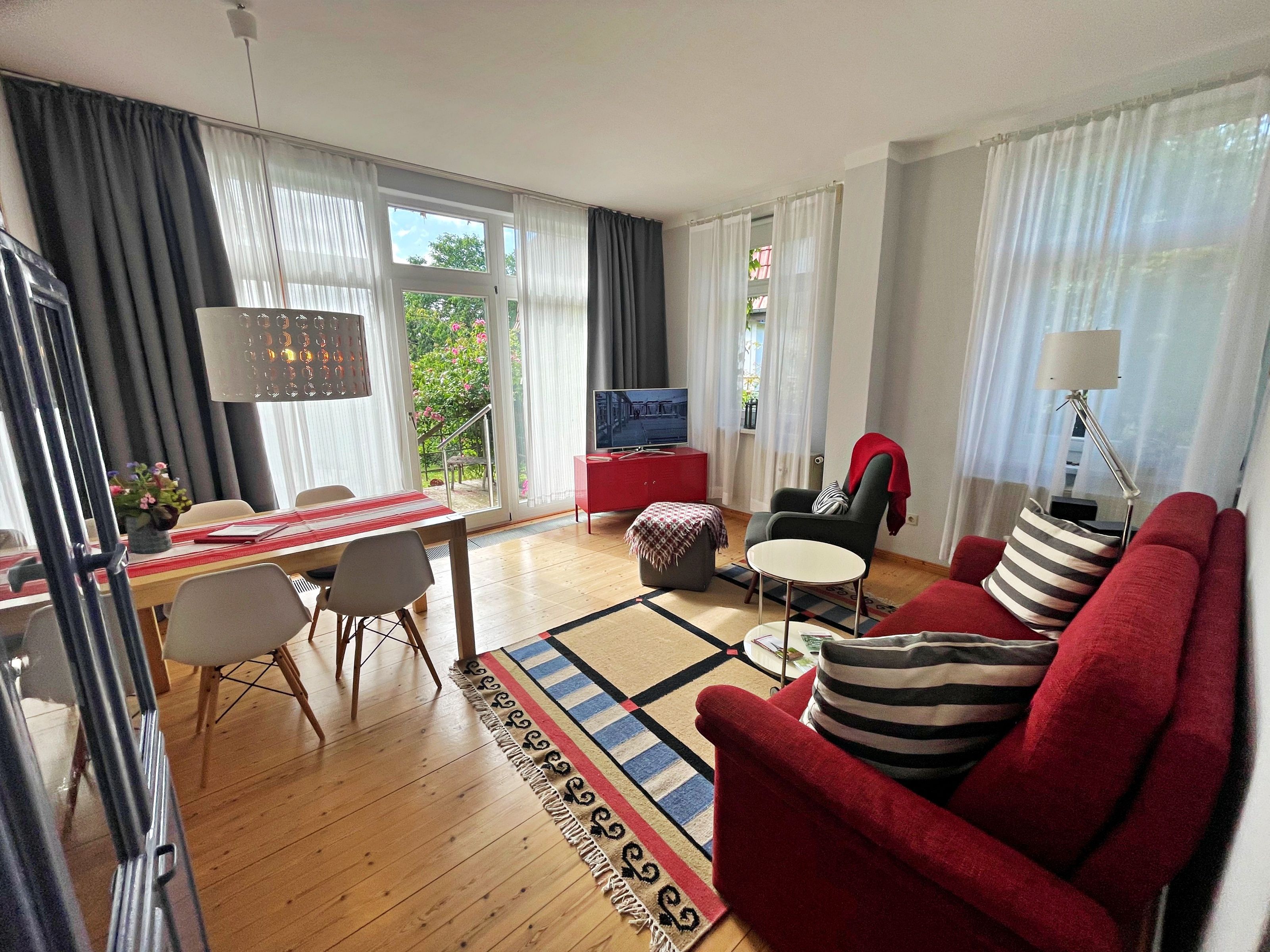 Herzlich willkommen in dieser hellen und modernen Nichtraucher-Ferienwohnung in Bansin! Mit einer großzügigen Fläche von 69 m² im Erdgeschoss bietet sie ausreichend Platz für bis zu 3 Personen. Der hochwertige Dielenboden sorgt für ein angenehmes Raumklima. Die Wohnung verfügt über zwei gemütliche Schlafräume - einen mit einem Doppelbett und einen mit einem Einzelbett - ideal für einen entspannten Urlaub. Die geschmackvolle Ausstattung lässt keine Wünsche offen: In der separaten Küche finden Sie alles, was Sie benötigen, darunter einen E-Herd mit 4 Platten, Backofen, Spülmaschine, Kaffeemaschine, Wasserkocher, Kühlschrank, Toaster und eine Mikrowelle. Für Ihre Unterhaltung sorgen Sat-TV und Radio. Das Tageslicht-Bad ist mit einer Dusche ausgestattet und bietet Ihnen den Komfort, den Sie sich wünschen. Genießen Sie die große Terrasse, die tagsüber viel Sonne bietet - der perfekte Ort, um Ihr Frühstück im Freien zu genießen oder den Abend bei einem Glas Wein ausklingen zu lassen.  Die Erstausstattung mit Bettwäsche und Handtüchern ist bereits im Preis enthalten. Für Ihren Pkw steht Ihnen ein Parkplatz direkt am Haus zur Verfügung und selbstverständlich können Sie auch das kostenfreies WLAN nutzen. Ein Schuppen zum Einschließen der Fahrräder steht Ihnen ebenfalls gern zur Verfügung. Bitte beachten Sie, dass es leider keine Grillmöglichkeit gibt.
