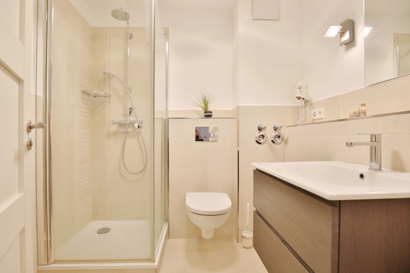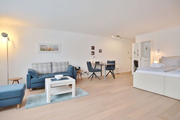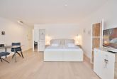 Die Wohnung verfügt über ein Wohn-Schlafzimmer, ein Badezimmer und bietet Schlafmöglichkeiten für 2 Personen. Das Bett ist ein modernes Boxspringbett mit einer Liegefläche von 180x200 cm (getrennte Matratzen). Der Wohn-Schlafraum lässt sich mit elektrischen Rollläden verdunkeln. Ein Balkon mit Gartenmöbeln ergänzt den Wohnbereich und schafft einen angenehmen Platz, um den Tag ruhig ausklingen zu lassen.