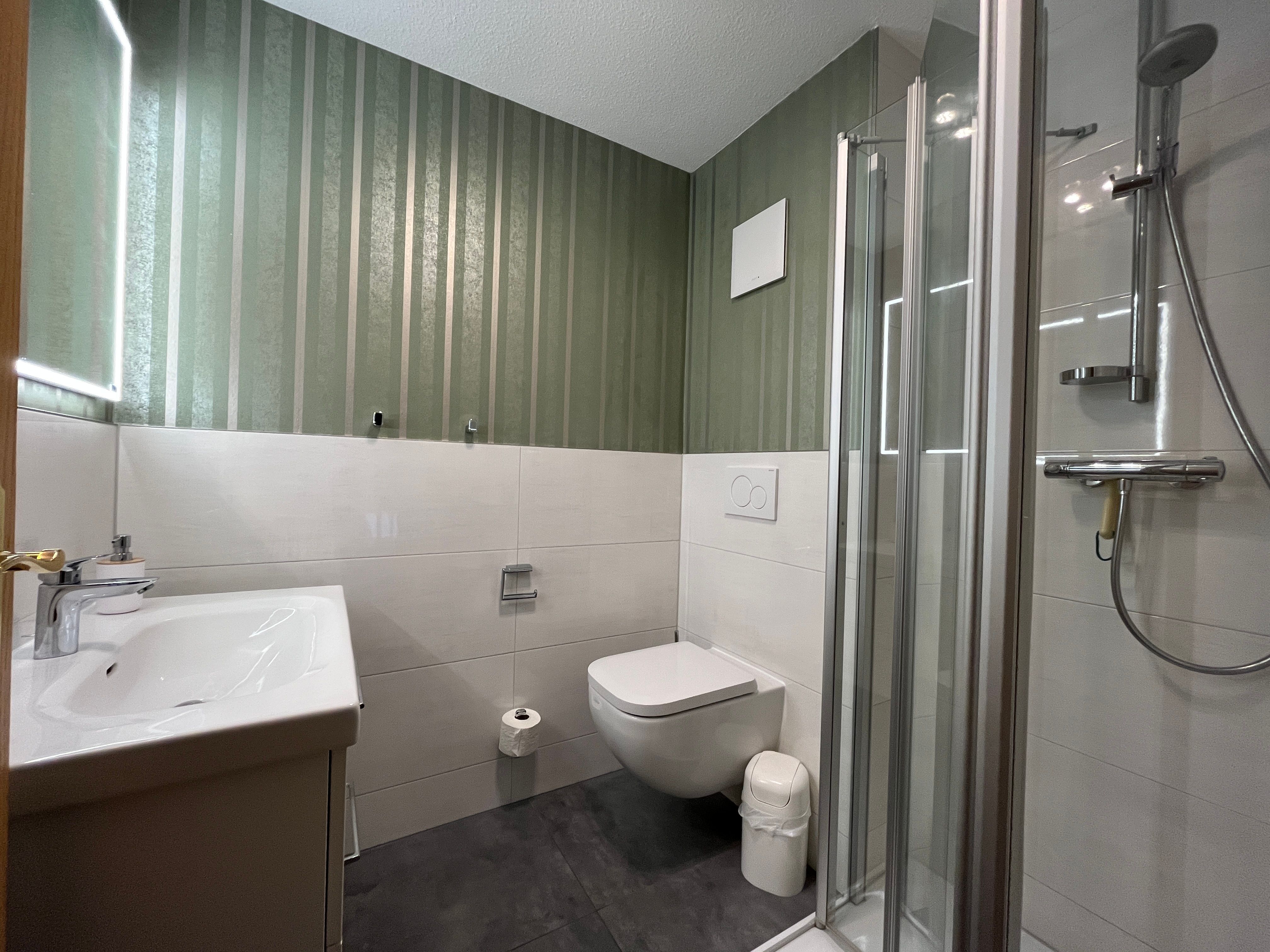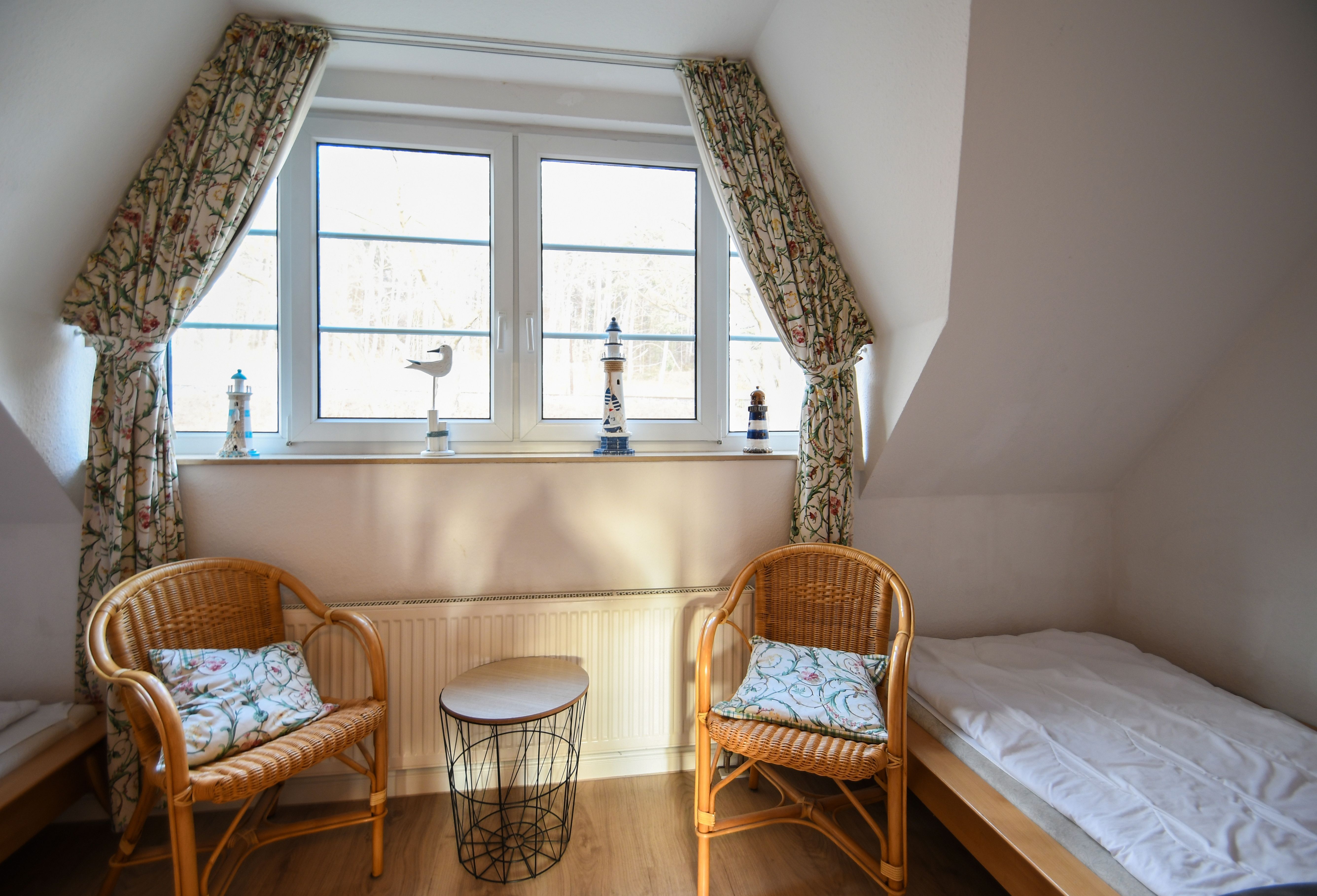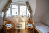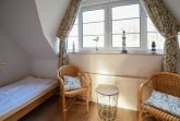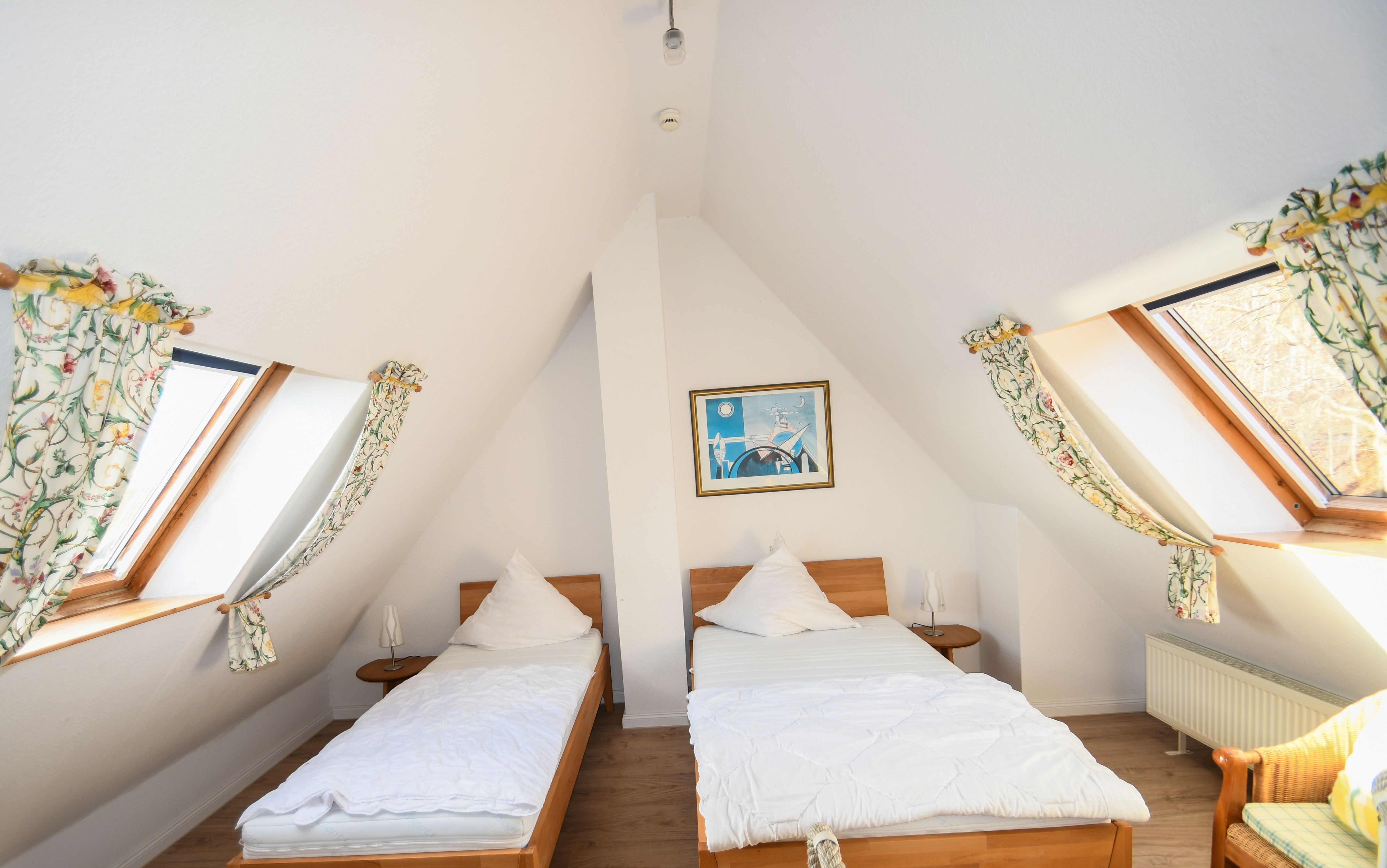 Auf der gleichen Ebene im 1. OG wie der Wohnbereich befinden sich das Badezimmer, separates Schlafzimmer mit 2 Einzelbetten.