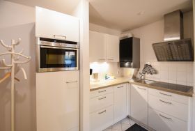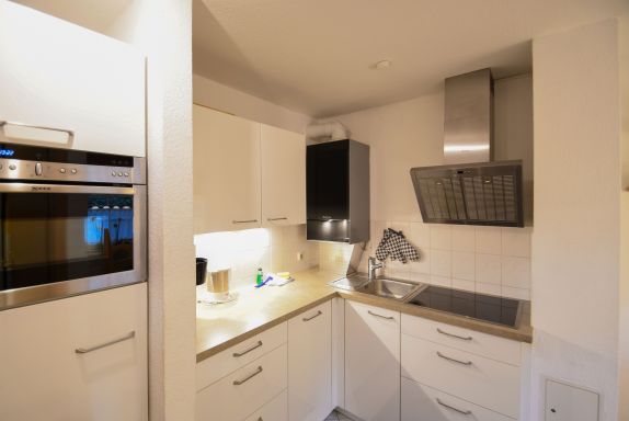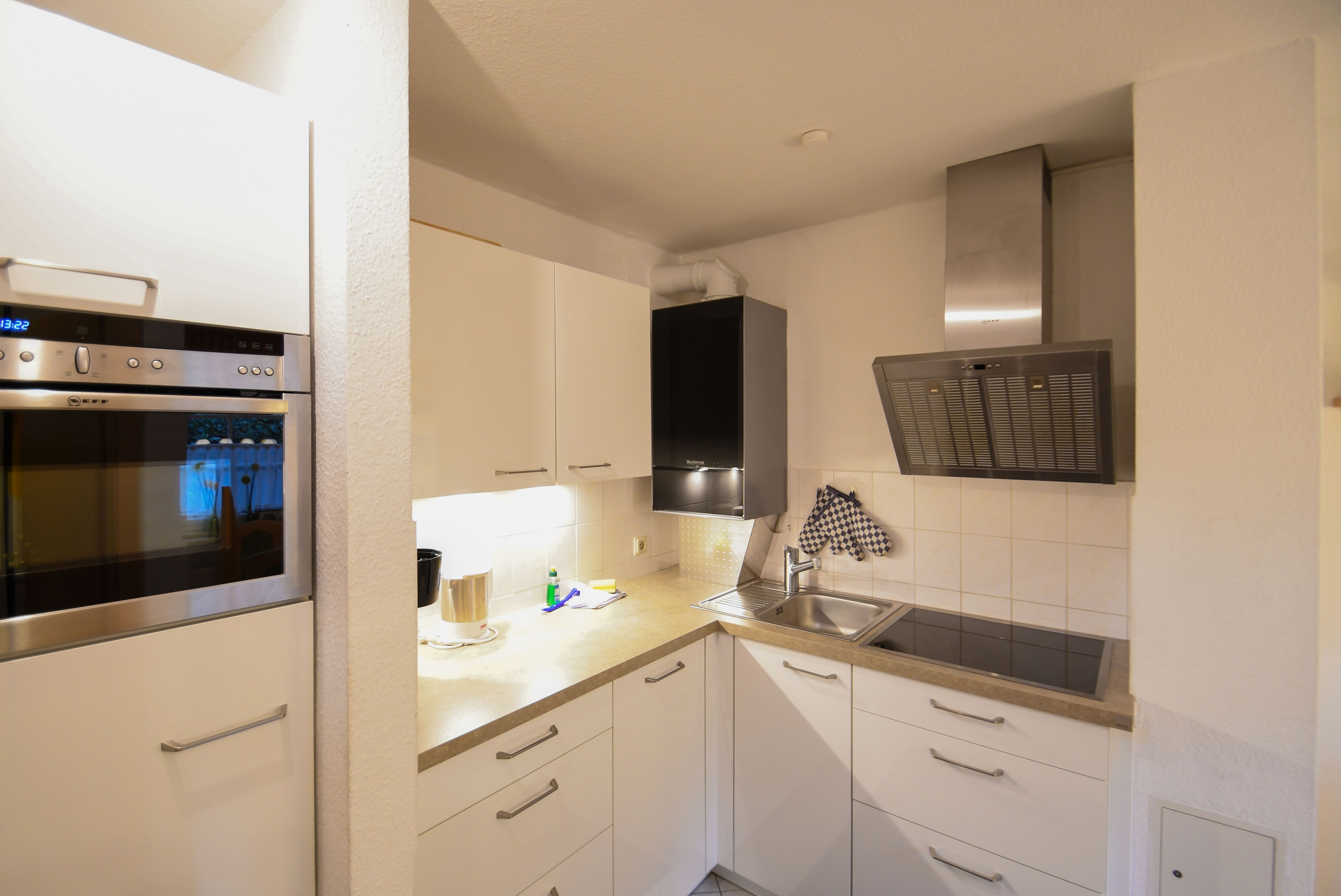 Die Einbauküche ist komfortabel ausgestattet mit Geschirrspüler, Ceran-Kochfeld, Backofen, Mikrowelle und Kühlschrank. Toaster, Wasserkocher und Kaffeemaschine.