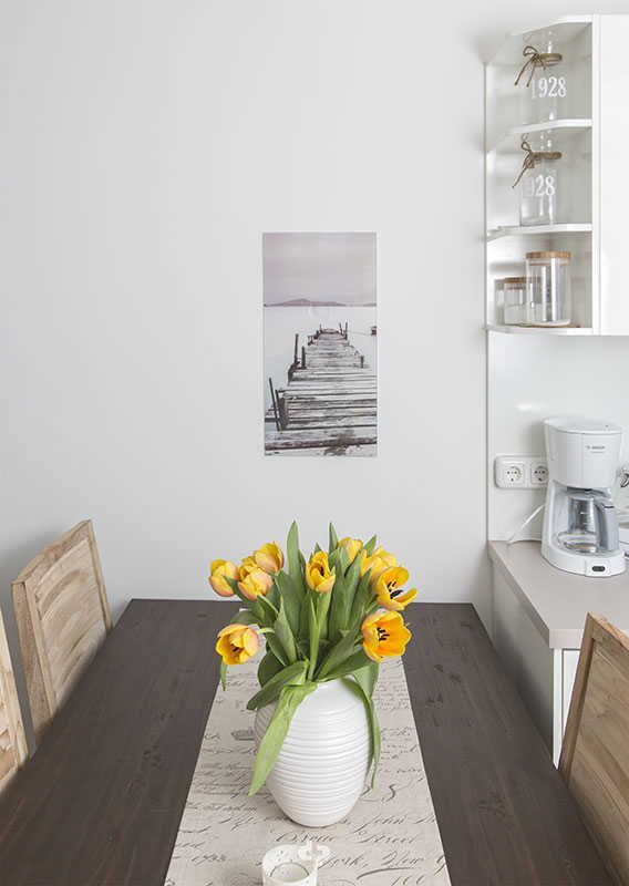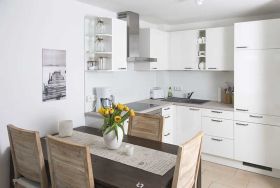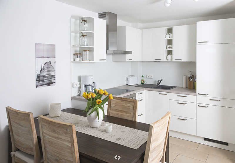 Vom großzügigen Eingangsbereich betreten Sie den Wohnbereich, mit integrierter Einbauküche. Die hochwertige Küche ist ausgestattet mit Cerankochfeld, Backofen, Geschirrspüler, Kühlgefrierkombination, Kaffeemaschine, Wasserkocher, Toaster, Töpfen u. Pfannen und selbstverständlich ausreichend Geschirr und Besteck. Der Essbereich für 4 Personen schließt sich unmittelbar an die Einbauküche an.