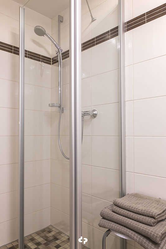 Im Bad erwartet Sie eine geräumige Dusche, ein Handtuchheizkörper, ein Waschplatz, Fön und genügend Ablagefläche.