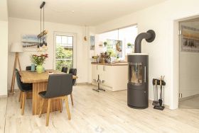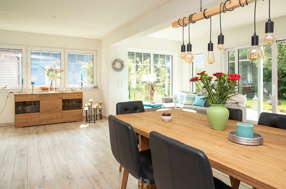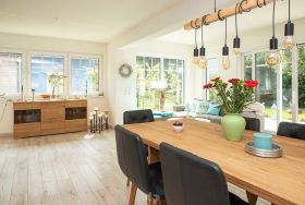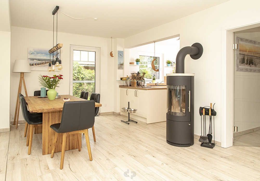 Das gesamte Haus ist mit Fußbodenheizung ausgestattet. Im Erdgeschoß wurden schöne Fliesen in Holzoptik verlegt. Einen Vinylfußboden in heller Holzoptik findet man im Obergeschoß.