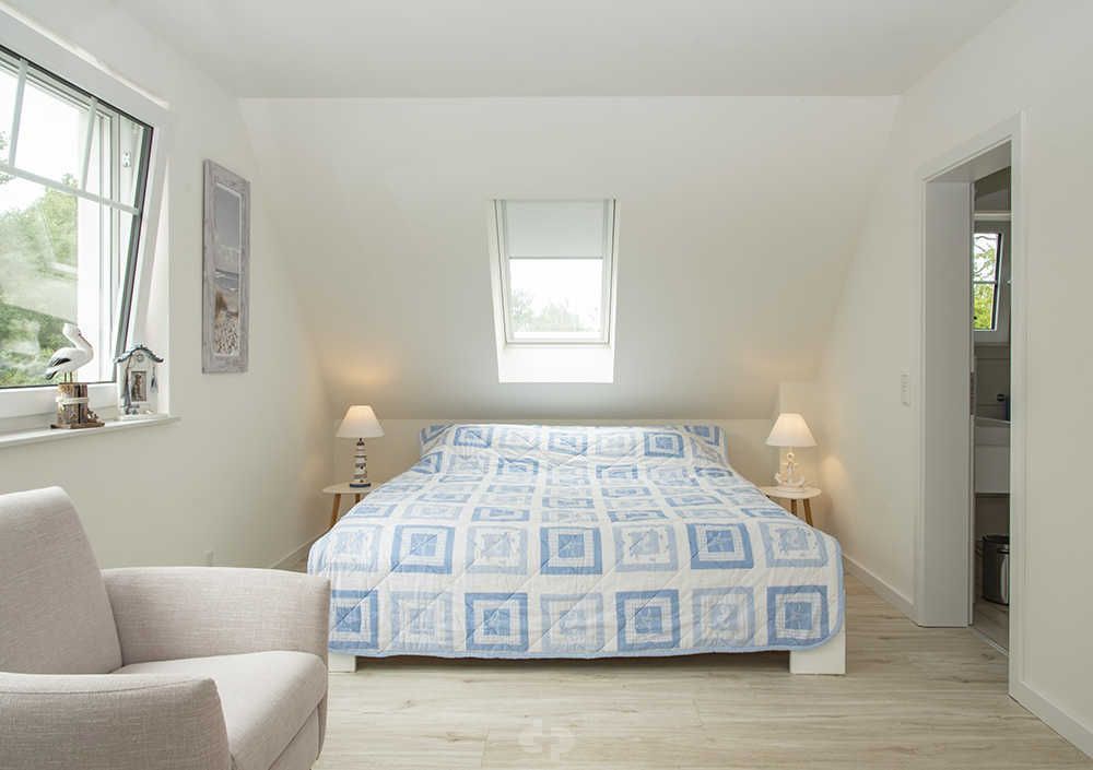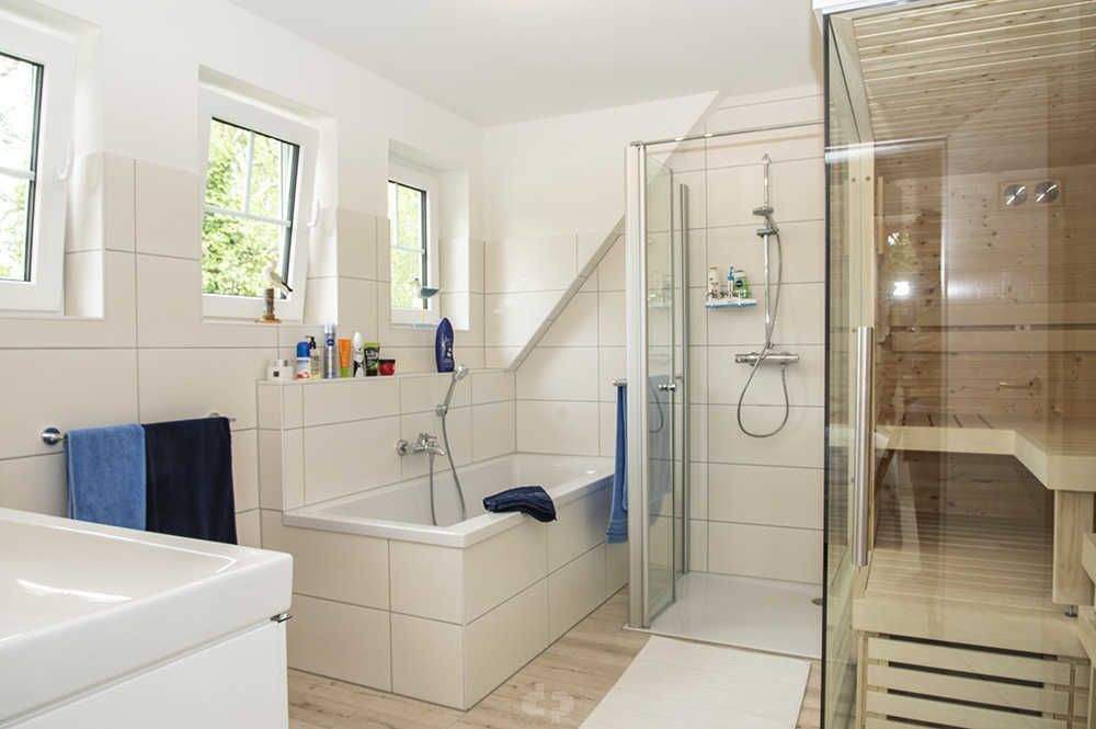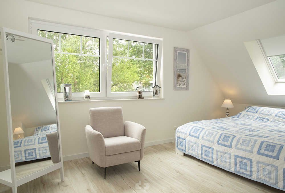 DACHGESCHOSS: 2 Schlafzimmer mit Doppelbetten, HIGHLIGHT im Badzimmer integrierte Bio- und finnische Sauna.