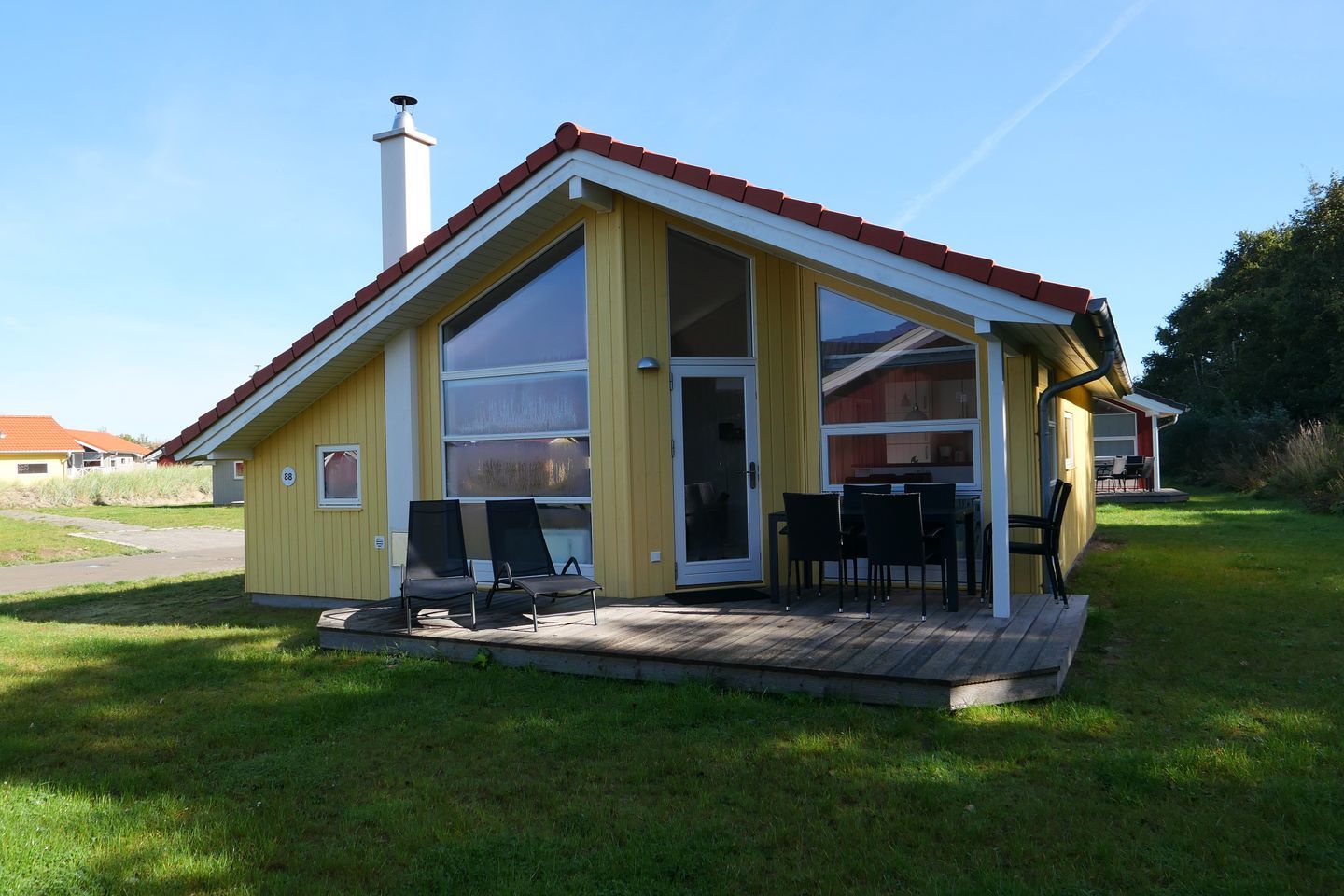 Bitte beachten Sie: Manche Häuser verfügen über ein Geländer um die Terrasse herum, andere nicht. Bei den Außen- und Innenbildern handelt es sich um Modellbilder unterschiedlicher Ferienhäuser.