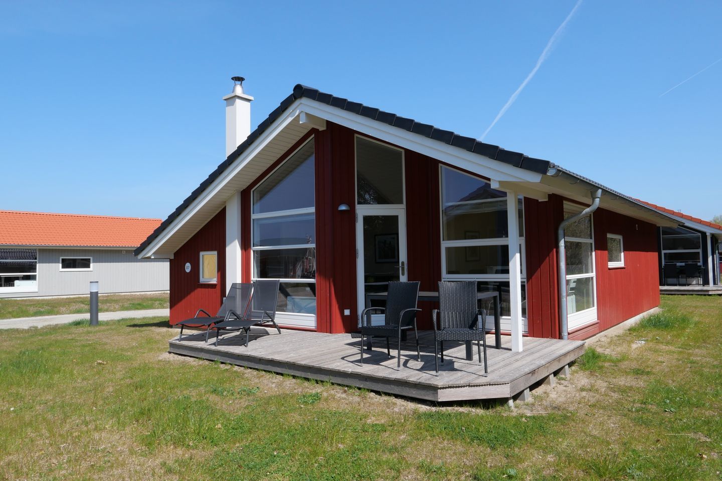 Bitte beachten Sie: Manche Häuser verfügen über ein Geländer um die Terrasse herum, andere nicht. Bei den Außen- und Innenbildern handelt es sich um Modellbilder unterschiedlicher Ferienhäuser.