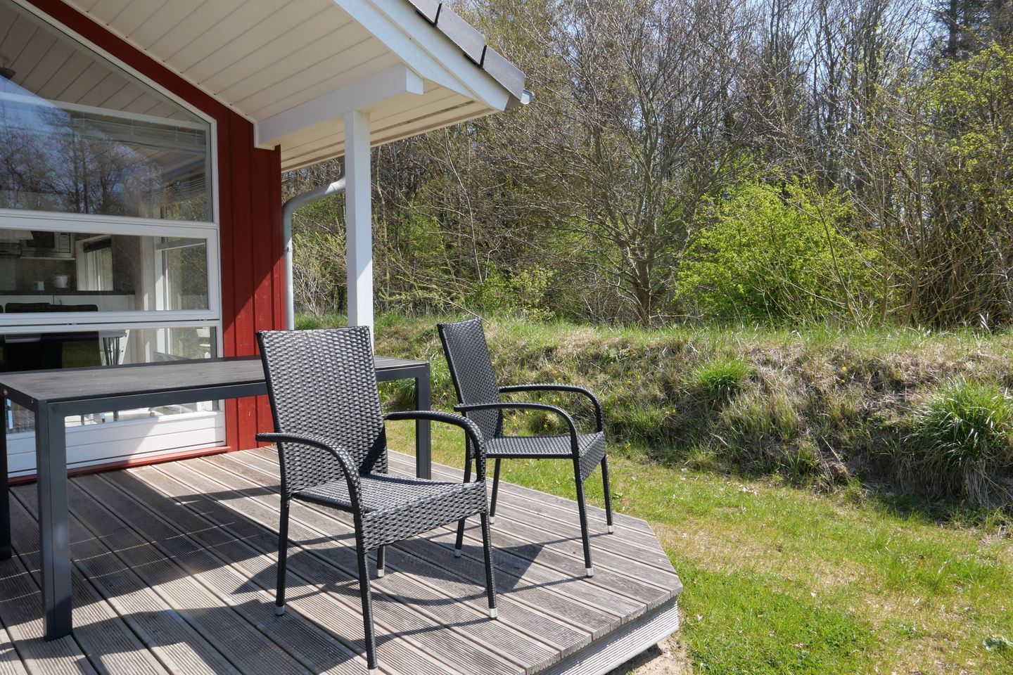 Vom Wohnbereich aus haben Sie Zugang zur teils überdachten und möblierten Terrasse, auf der Sie die langen Sommerabende genießen können. 2 Sonnenliegen stehen Ihnen ebenfalls zur Verfügung.
