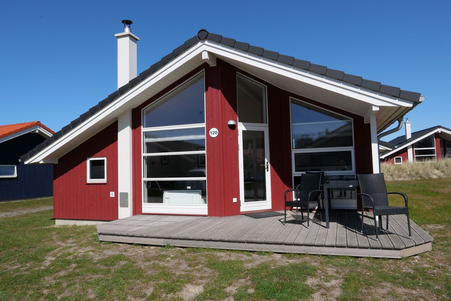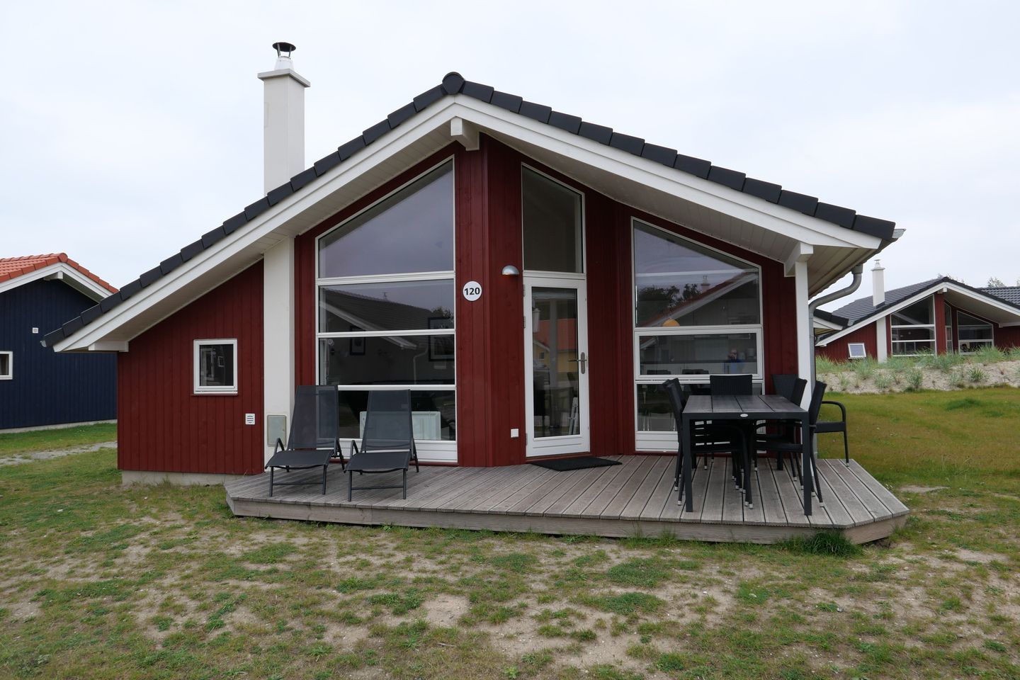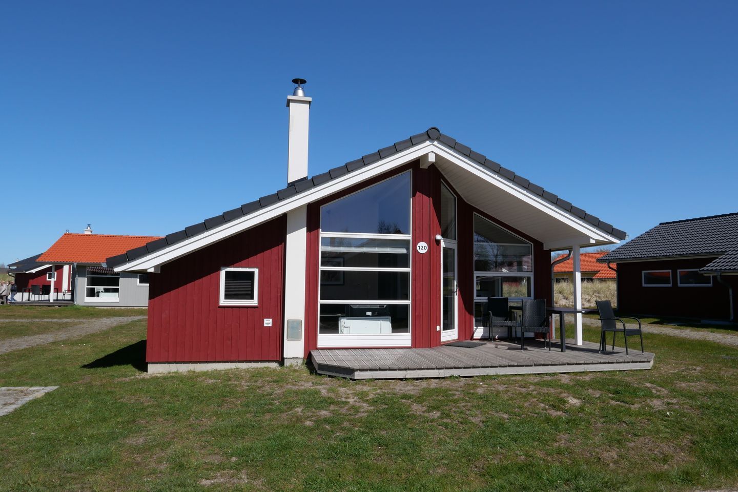 Bitte beachten Sie: Manche Häuser verfügen über ein Geländer um die Terrasse herum, andere nicht. Bei den Außen- und Innenbildern handelt es sich um Modellbilder unterschiedlicher Ferienhäuser.