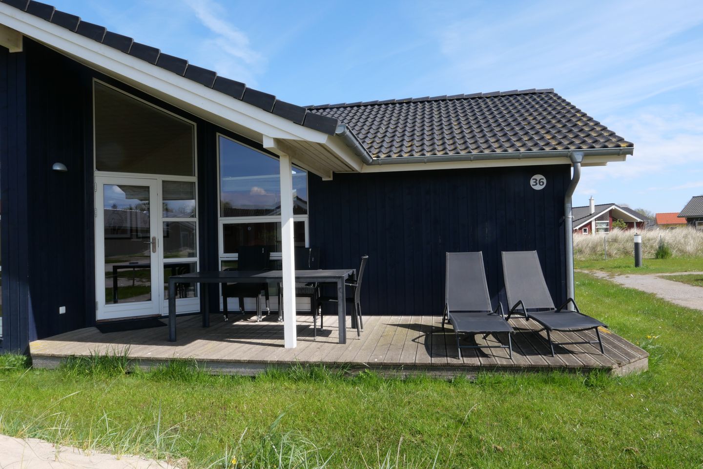 Vom Wohnbereich aus haben Sie Zugang zur teils überdachten, mit Gartentisch und Stühlen möblierten Terrasse, auf der Sie die langen Sommerabende genießen können. 2 Sonnenliegen stehen Ihnen ebenfalls zur freien Verfügung.