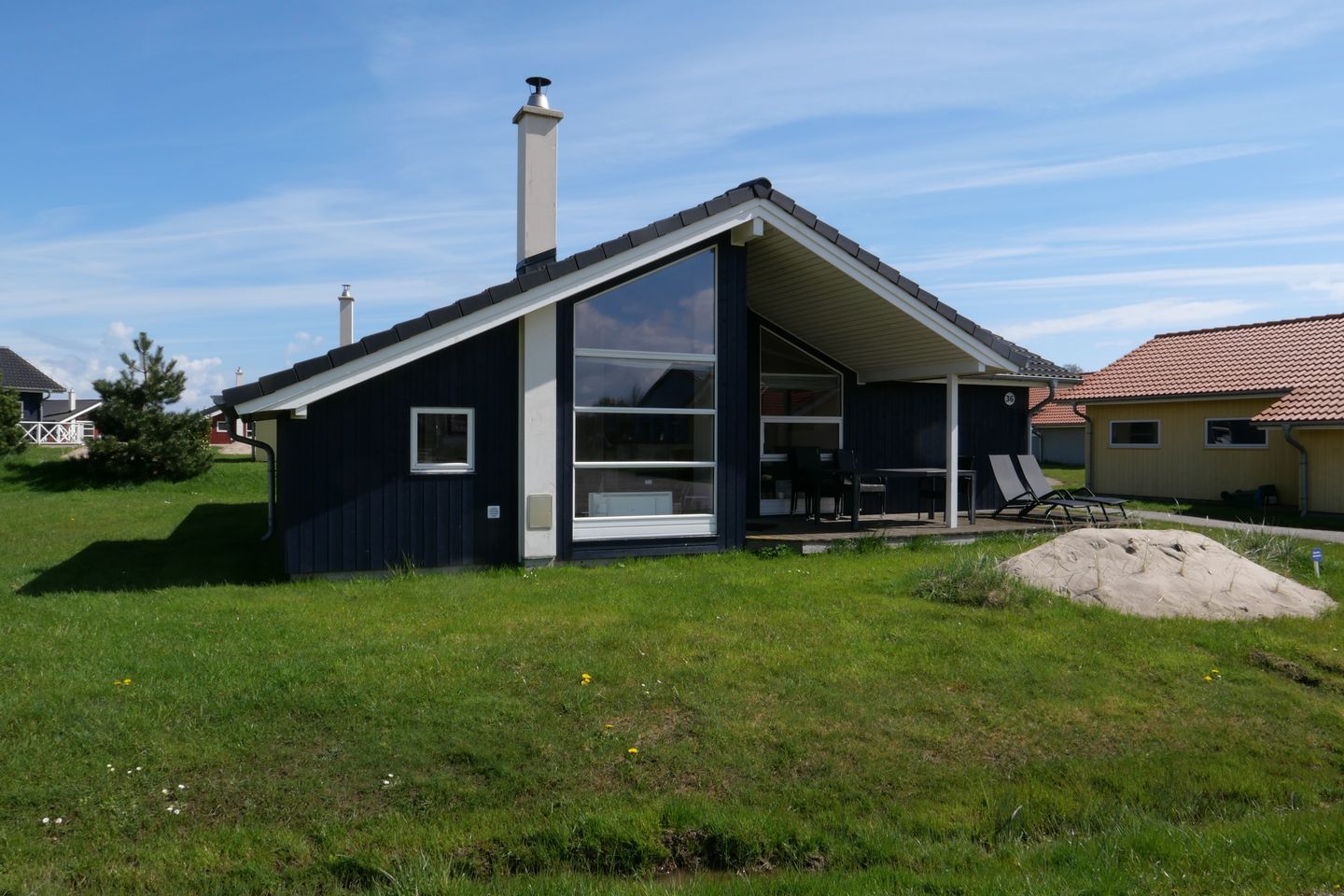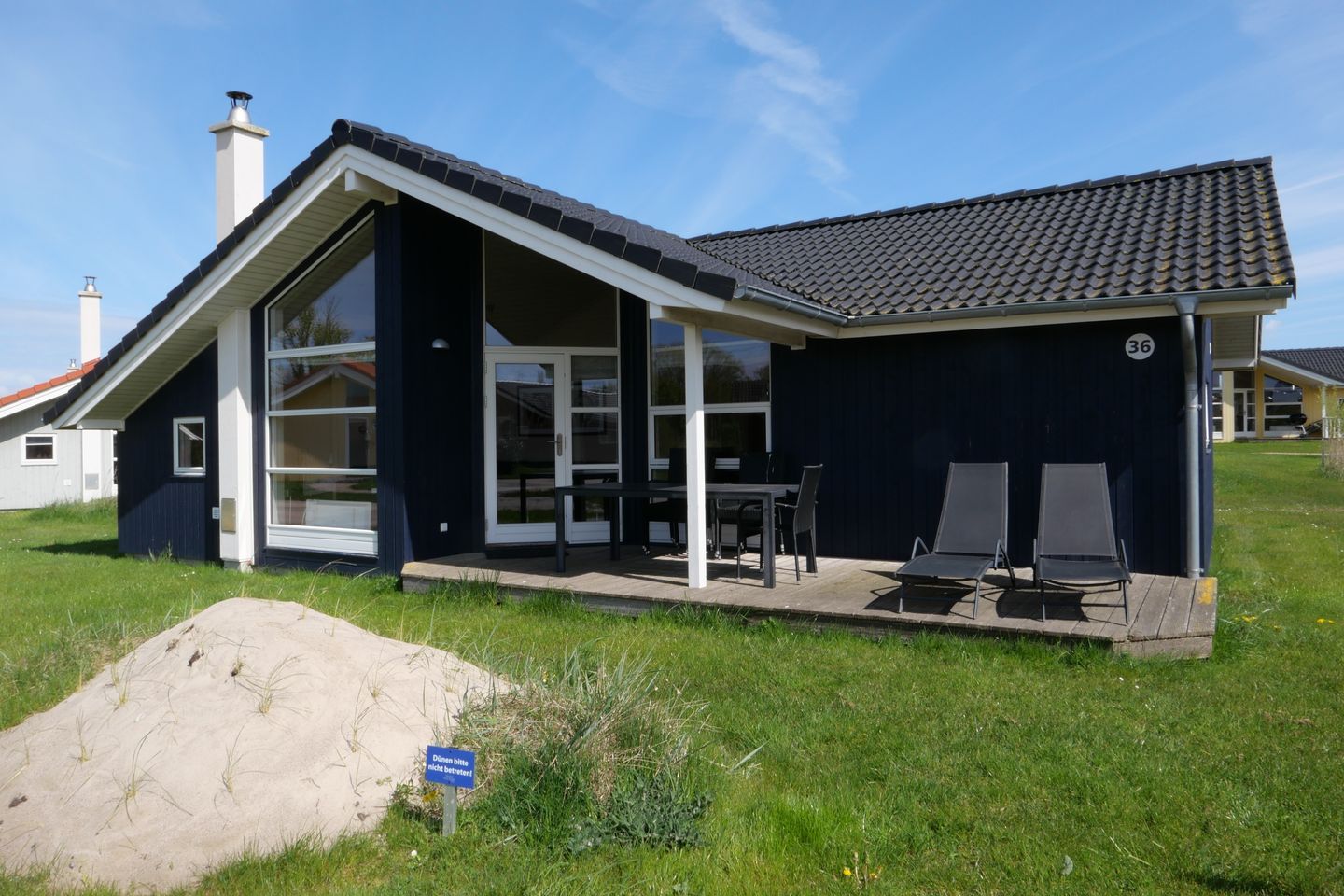 Bitte beachten Sie: Manche Häuser verfügen über ein Geländer um die Terrasse herum, andere nicht. Bei den Außen- und Innenbildern handelt es sich um Modellbilder unterschiedlicher Ferienhäuser.