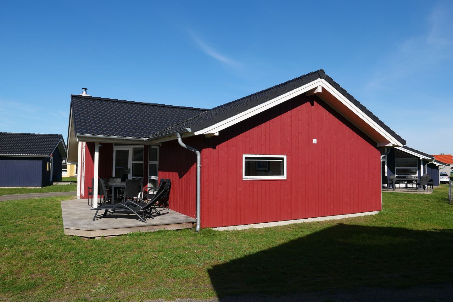 Bitte beachten Sie: Manche Häuser verfügen über ein Geländer um die Terrasse herum, andere nicht. Bei den Außen- und Innenbildern handelt es sich um Modellbilder unterschiedlicher Ferienhäuser.