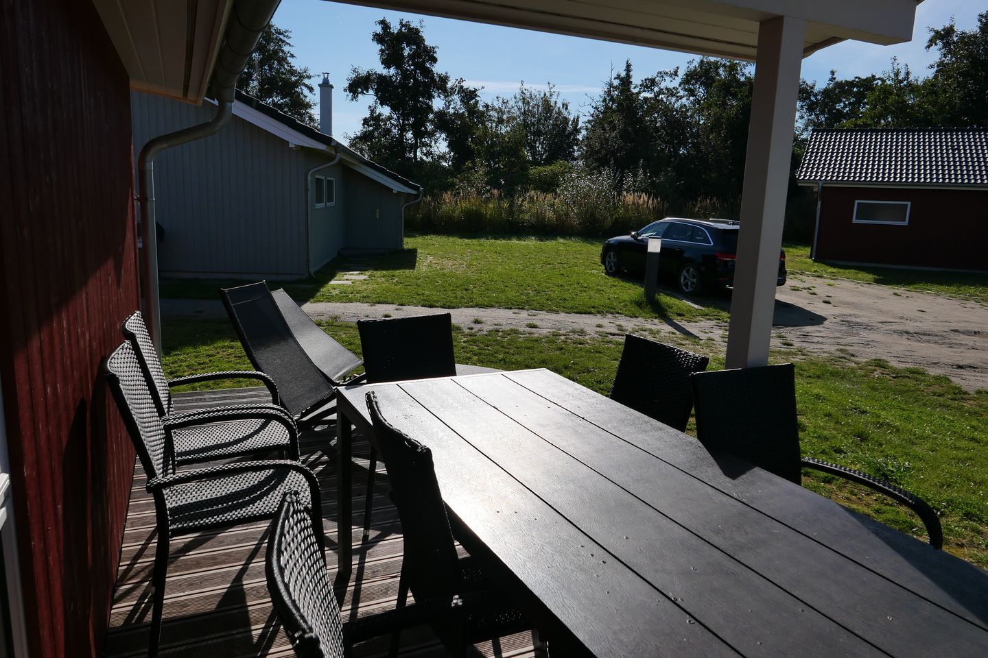 Vom Wohnbereich aus haben Sie Zugang zur teils überdachten, mit Gartentisch und Stühlen möblierten Terrasse, auf der Sie die langen Sommerabende genießen können. 2 Sonnenliegen stehen Ihnen ebenfalls zur freien Verfügung.