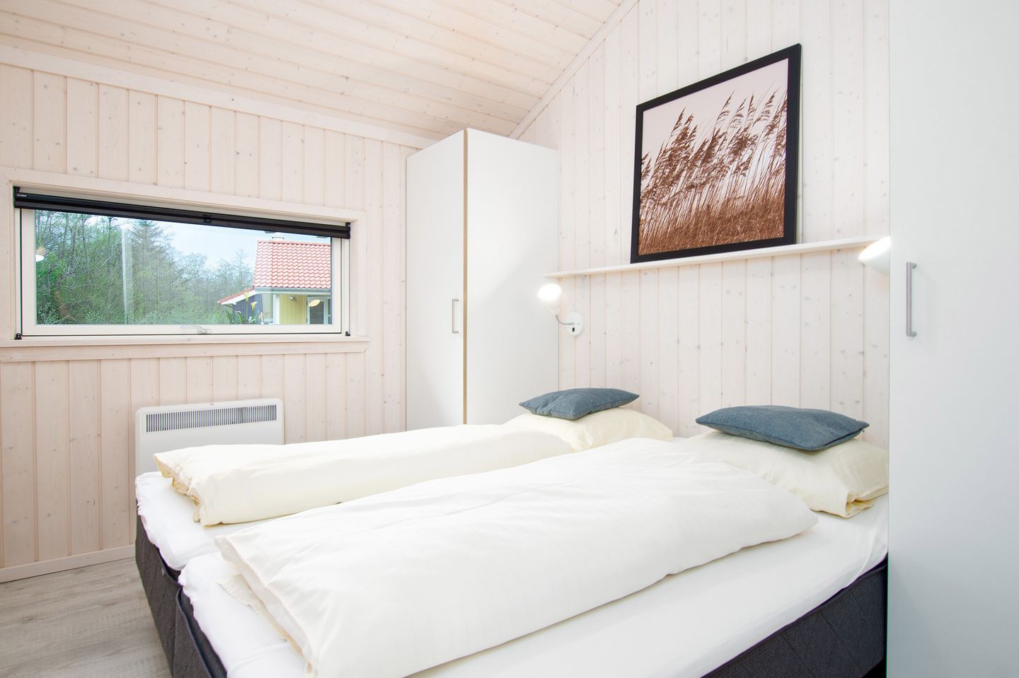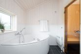 Die 4 Schlafzimmer liegen räumlich versetzt. Ein großes Schlafzimmer mit Doppelbett und ein Schlafzimmer mit Einzelbetten liegen gleich neben dem großen Badezimmer mit Whirlpool, Sauna und Dusche. Zwei weitere Schlafzimmer sind mit Doppelbett bzw. 2 Einzelbetten ausgestattet und liegen auf der anderen Seite des Hauses. Im Alkoven befinden sich 2 zusätzliche Schlafplätze mit Doppelbett, die sehr beliebt bei den jüngeren Familienmitgliedern sind. Ein Kinderbett und ein Kinderhochstuhl befinden sich im Haus.