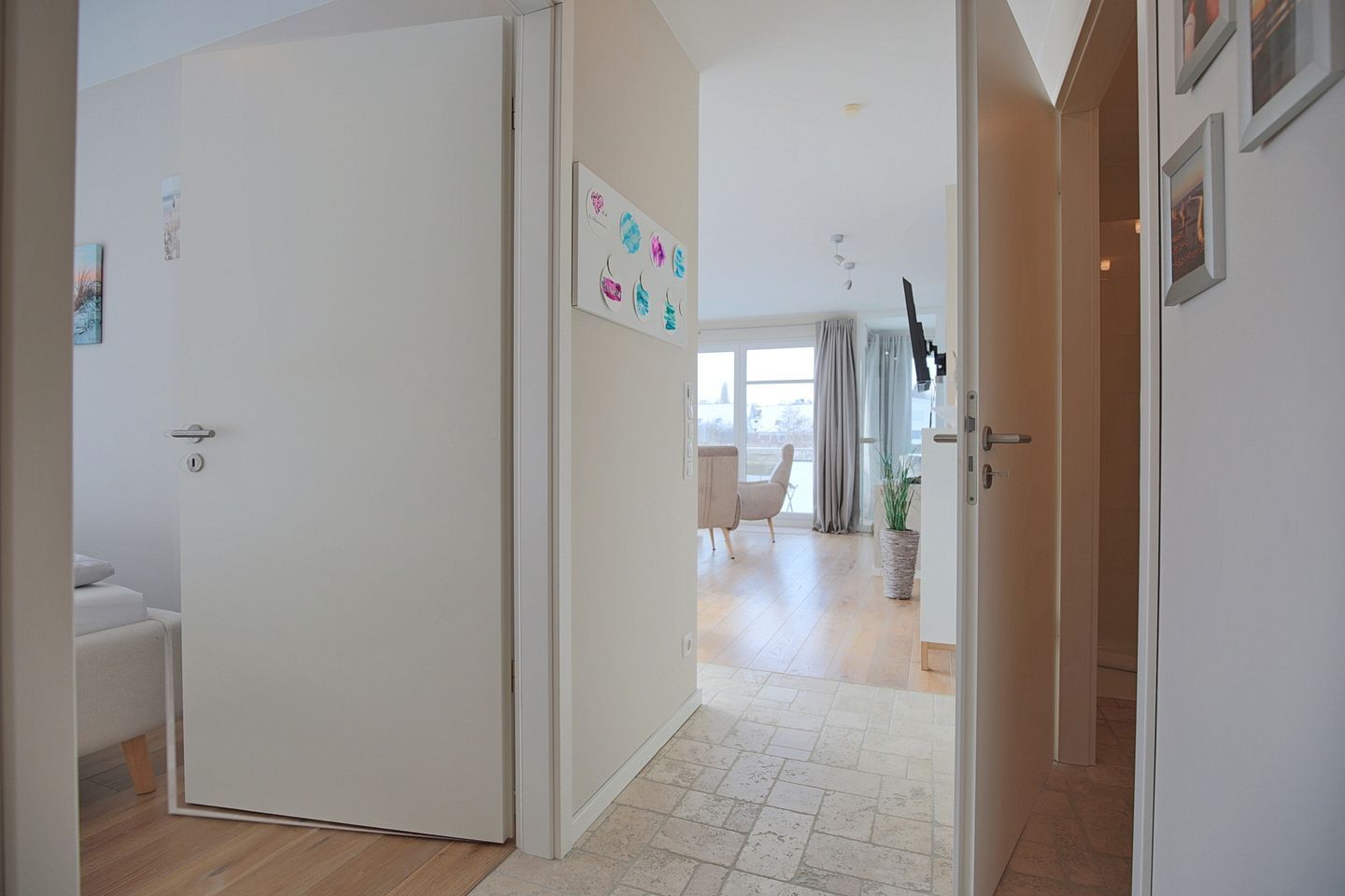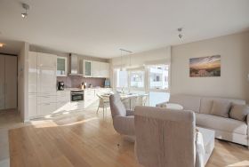 Das moderne 3 Zimmer Appartement bietet Ihnen auf 62 m² ein durchdachtes Raumkonzept für bis zu 6 Personen, davon maximal 4 Erwachsene. Die Unterkunft liegt im 2. Stock und ist bequem per Aufzug erreichbar – ideal, wenn Sie mit Kindern, Gepäck oder auch mit Hund anreisen, denn Haustiere sind erlaubt (max. 1). Im Eingangsbereich finden Sie einen großzügigen Kleiderschrank und eine Garderobe.