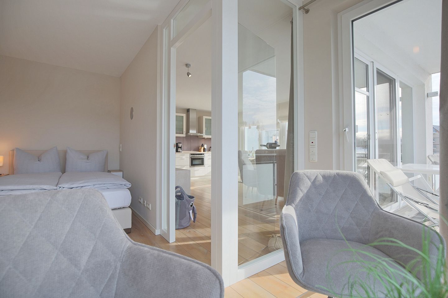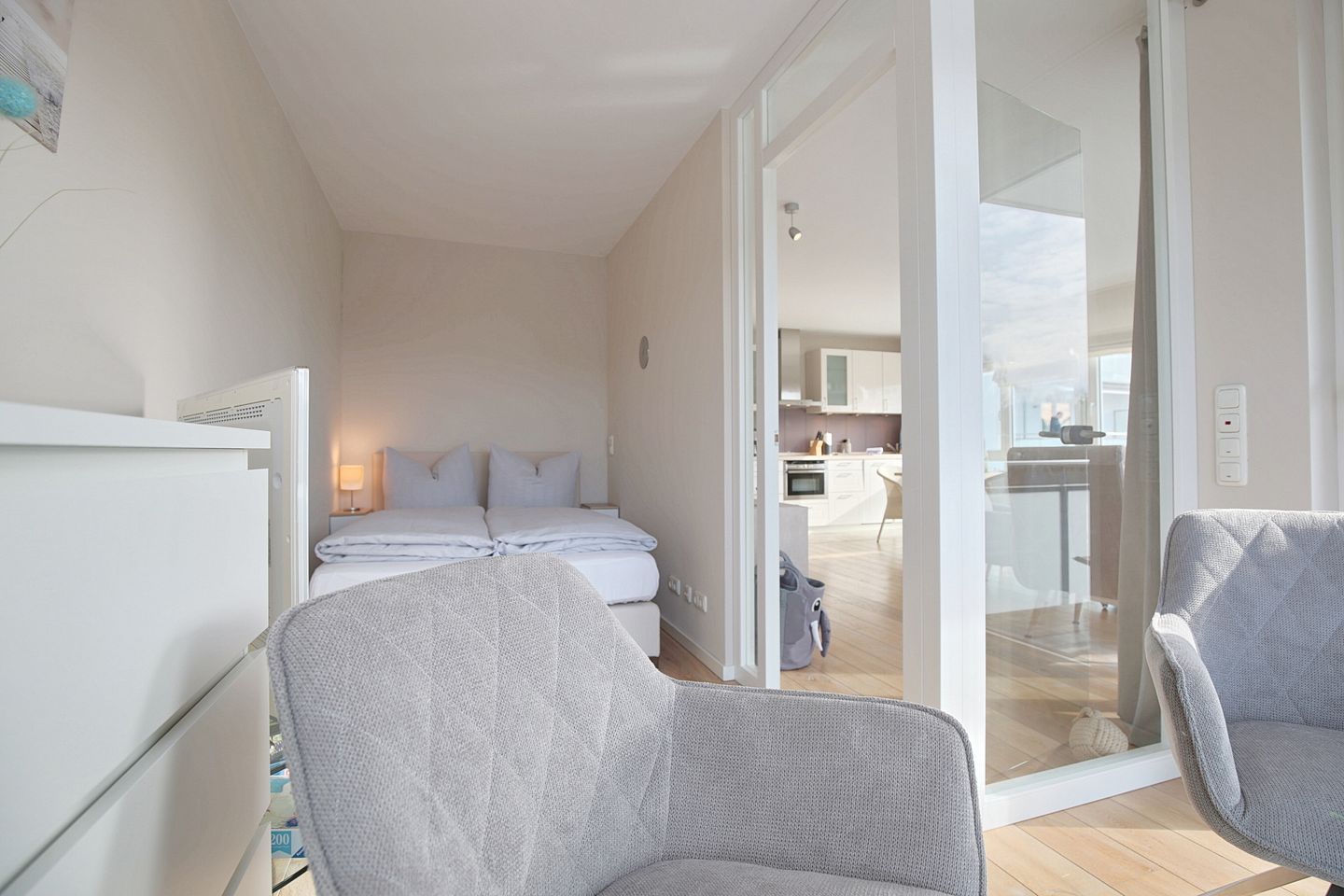 Zur Küchenausstattung gehören Herd mit Cerankochfeld, Mikrowelle, Kühlschrank mit Gefrierfach, Spülmaschine sowie einer Filter- Kaffeemaschine, Wasserkocher und Toaster. Von dort aus gelangen Sie in das angrenzende Schlafzimmer, das durch eine Glastür vom Wohnzimmer aus zugänglich ist. Der kleine Schlafbereich ist mit einem Doppelbett (1,40 x 2,00 m ) und einem zusätzlichen TV ausgestattet. Von hier aus gelangen Sie ebenfalls auf den West-Balkon.