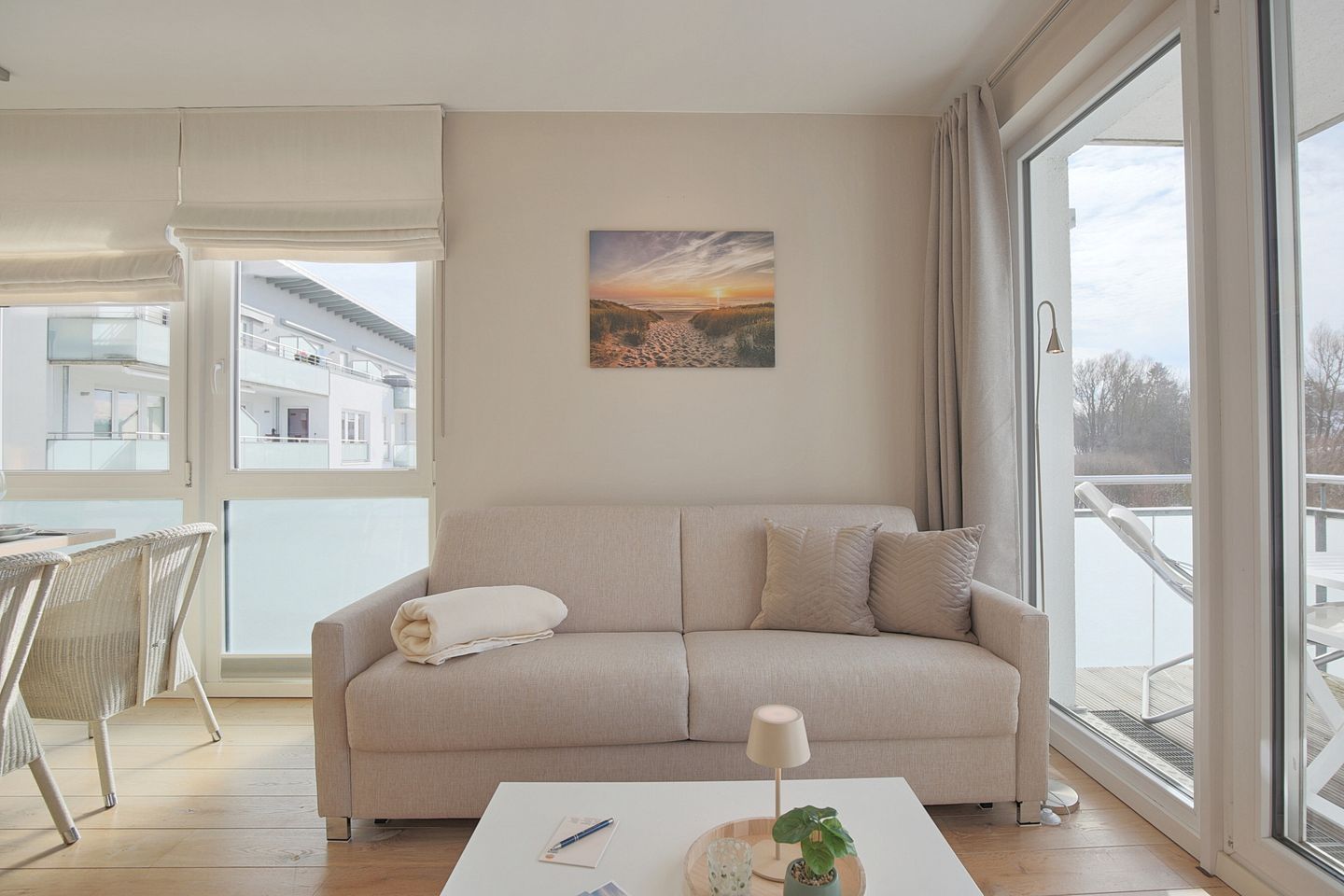 Der Wohnbereich mit Schlafcouch (1,60 x 2,00 m ) ist offen gestaltet und geht direkt in die Küche über. Die offene Küche zum Wohnzimmer schafft eine kommunikative Atmosphäre – praktisch für gemeinsame Mahlzeiten und entspannte Abende. Von hier aus gelangen Sie auf den West - Balkon. Hier können Sie den Tag ruhig beginnen oder ausklingen lassen.