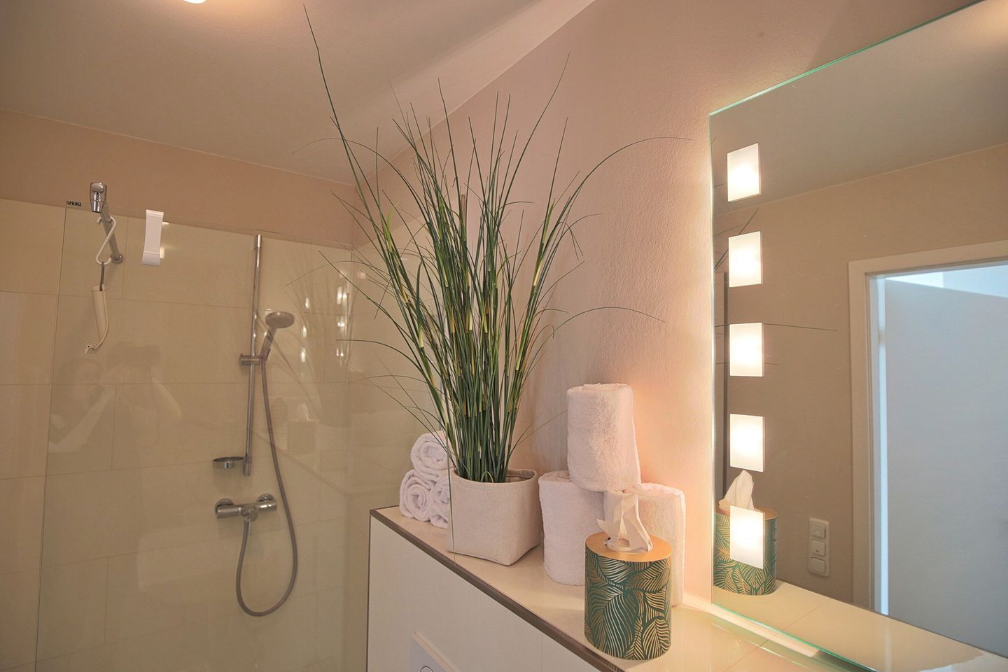 Das zweite Schlafzimmer ist mit einem Doppelbett ( 1,80 x 2,00 m ) und einer Kommode ausgestattet. Alle Räume sind mit Verdunklungsgardinen ausgestattet. Das Badezimmer ist mit einer ebenerdigen Dusche ausgestattet und bietet Ihnen außerdem einen Haartrockner sowie einen Kosmetikspiegel für die tägliche Routine. Für Komfort zu jeder Jahreszeit sorgt eine Fußbodenheizung.