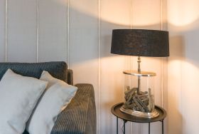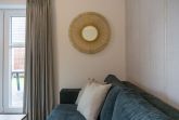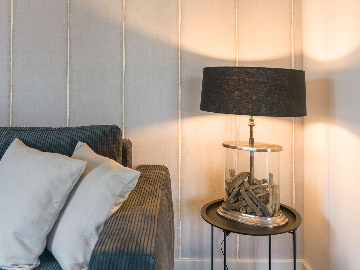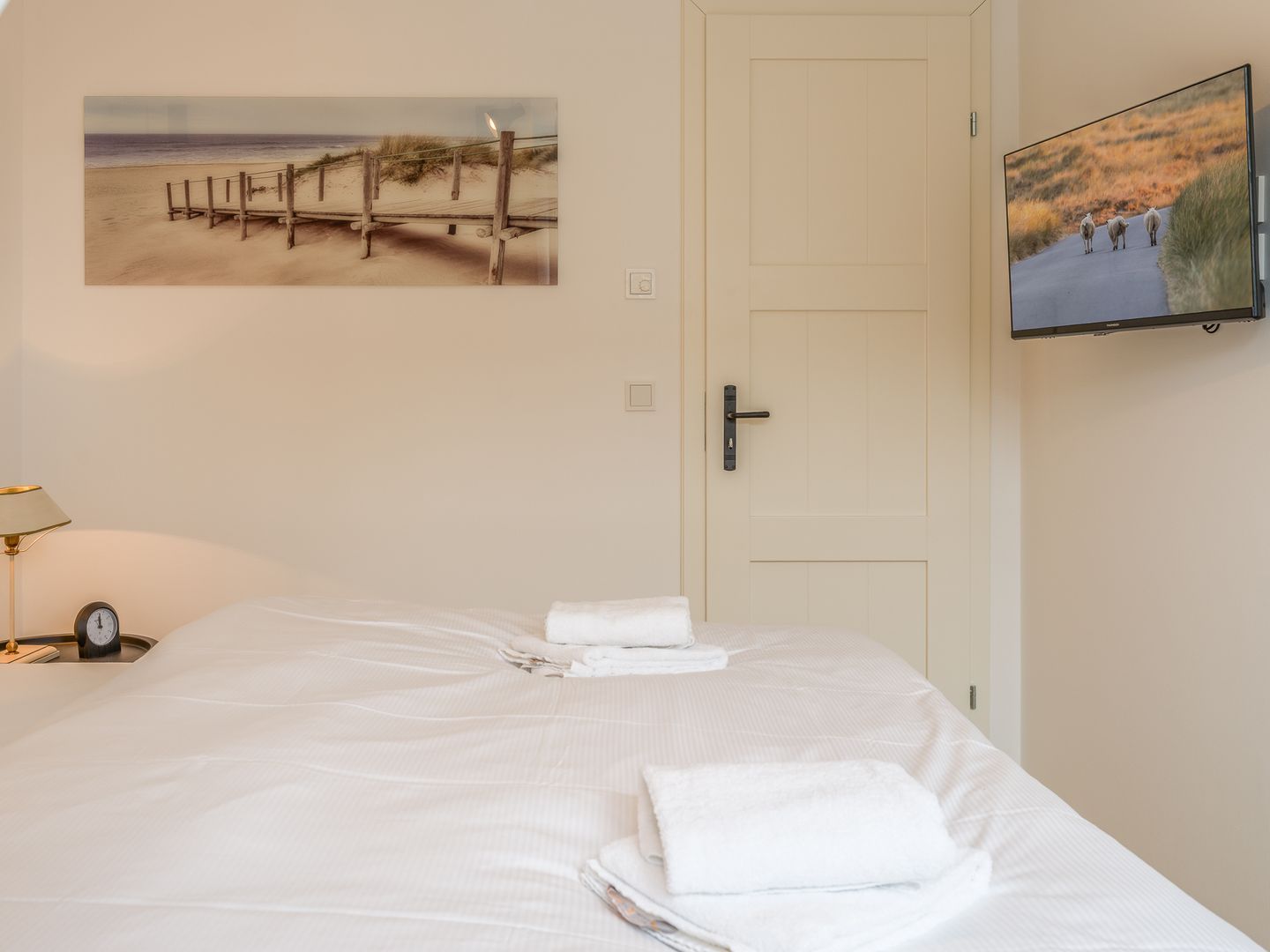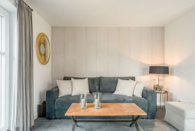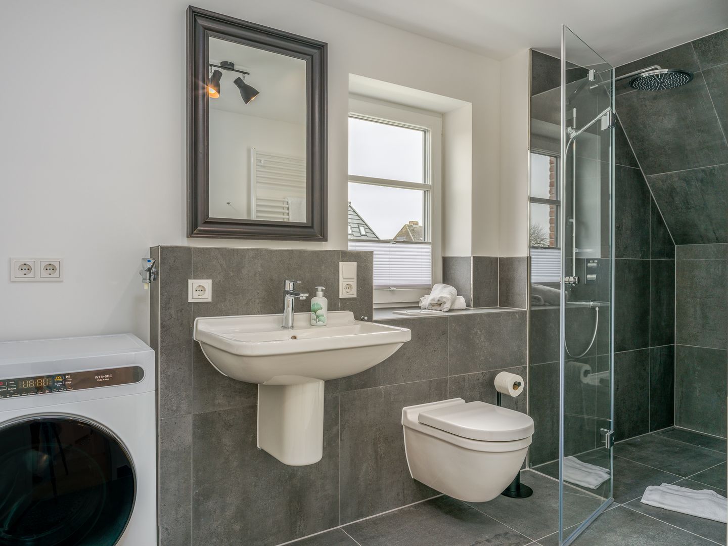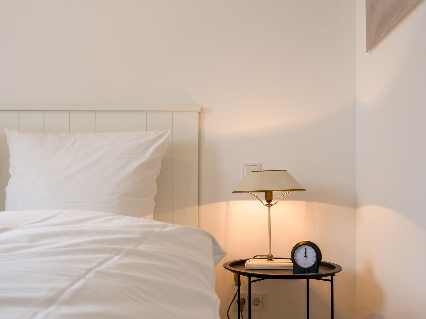 Eine Treppe höher liegen die beiden Schlafzimmer. mit jeweils einem Doppelbett. Begleitet werden sie von einem großen Bad mit Naturstein und hochwertiger Ausstattung wie z.B. einer Walk-in Dusche. Die Einrichtung im ersten OG ist nicht nur schön, sondern auch hochwertig: vom Holzboden, über Naturstein bis hin zu maßgefertigten Tischlereinbauten. Ein zeitlos-nordischer Look, der Qualität und Behaglichkeit vereint.