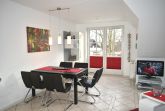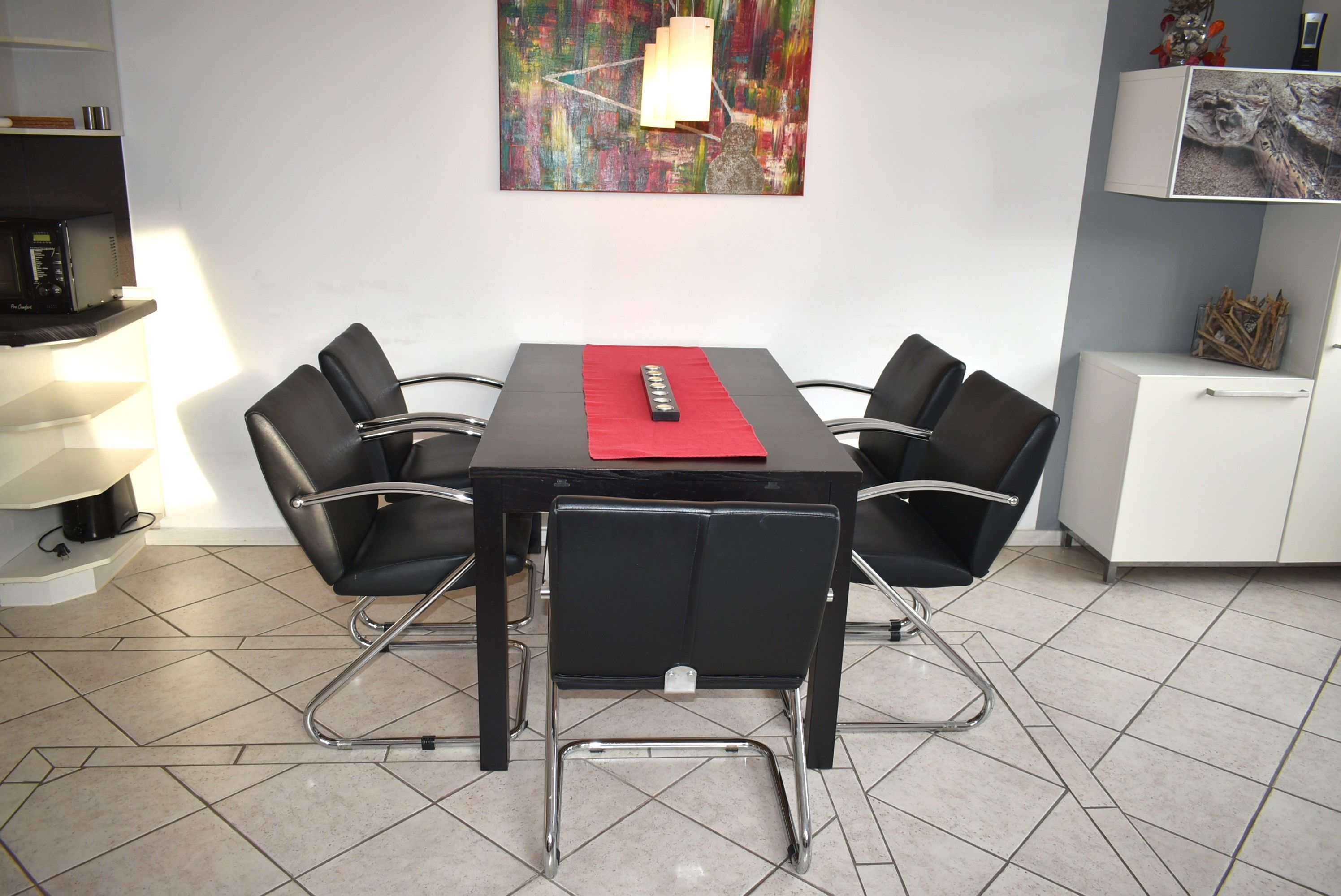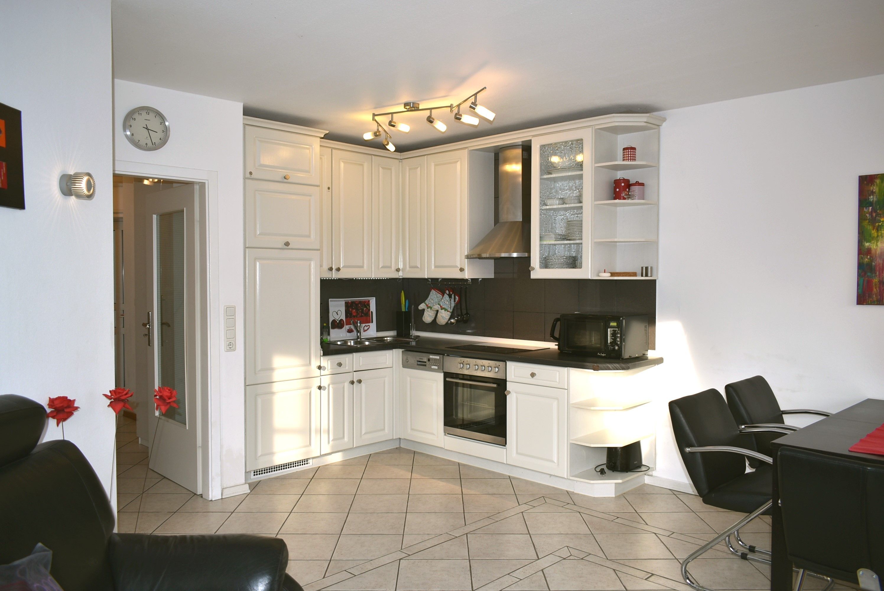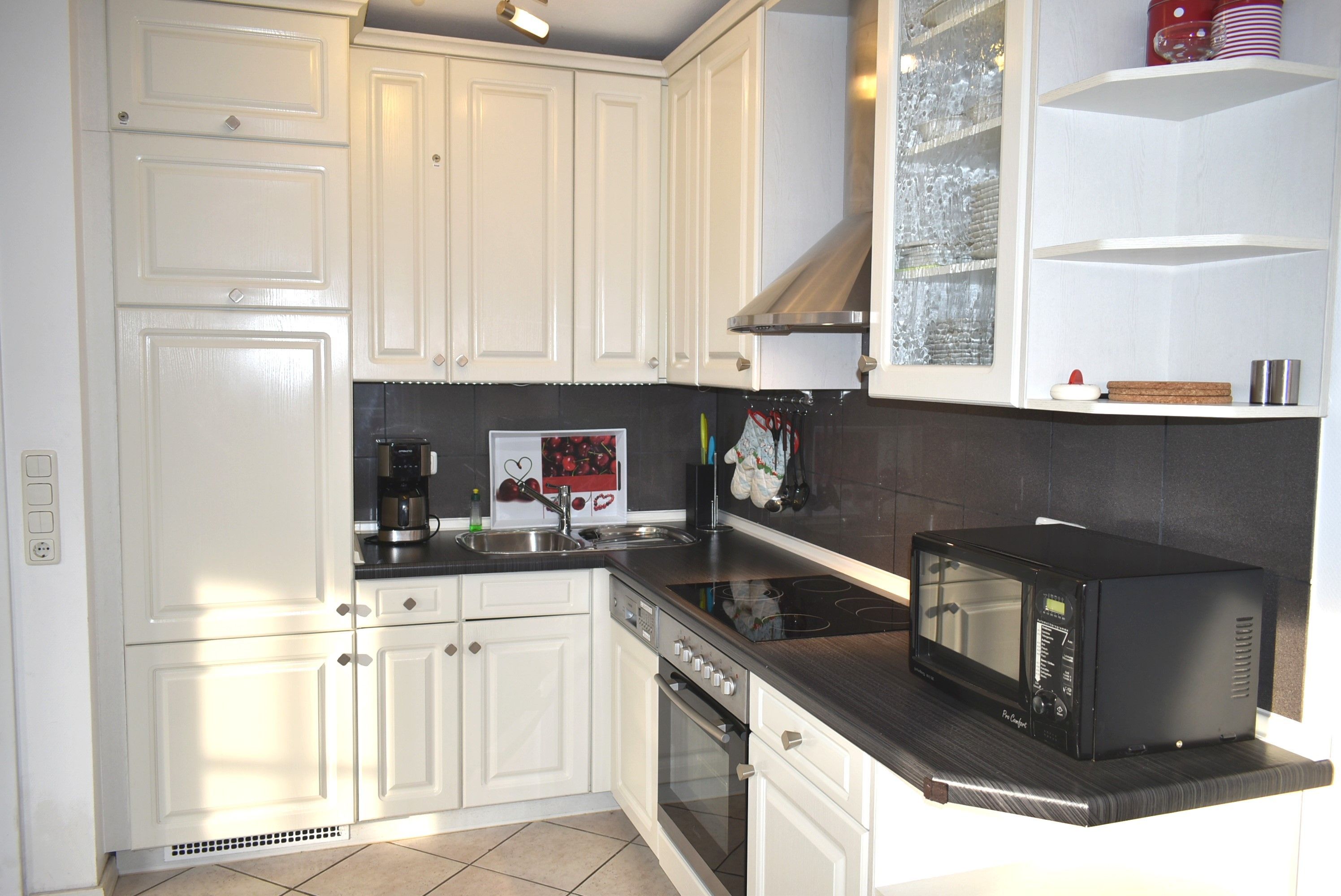 Wohnzimmer: Einbauküche, Cerankochfeld mit Backofen, Dunstabzugshaube, Mikrowelle, Kaffeemaschine, Wasserkocher, Senseo Kaffeemaschine, Eierkocher, Kühlschrank mit 3* Gefrierfach, Spülmaschine, Entsafter, Couchtisch, Eckcouch, Flachbildschirm, TV-Rolltisch, Plisee, Esstisch, 5 Stühle, Regalschrank mit Büchern, Kabel-TV