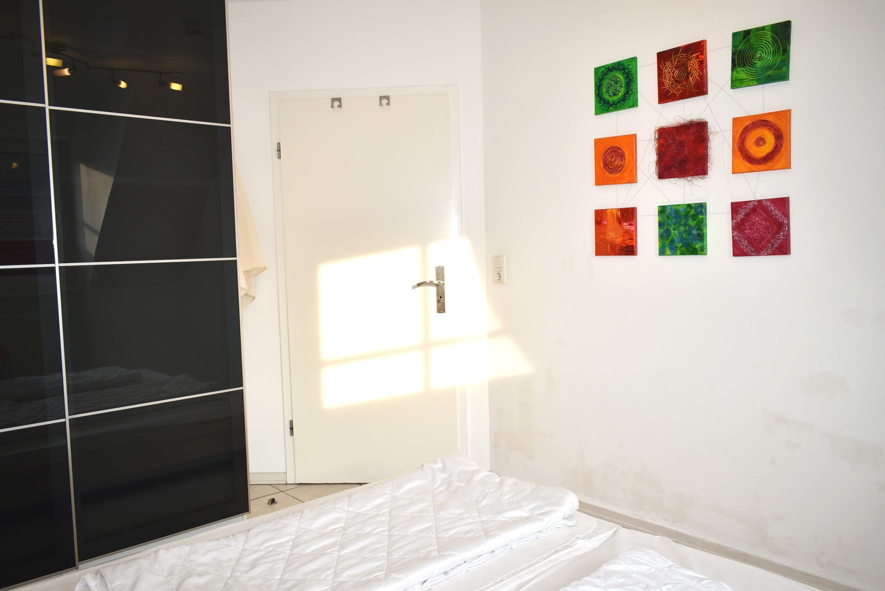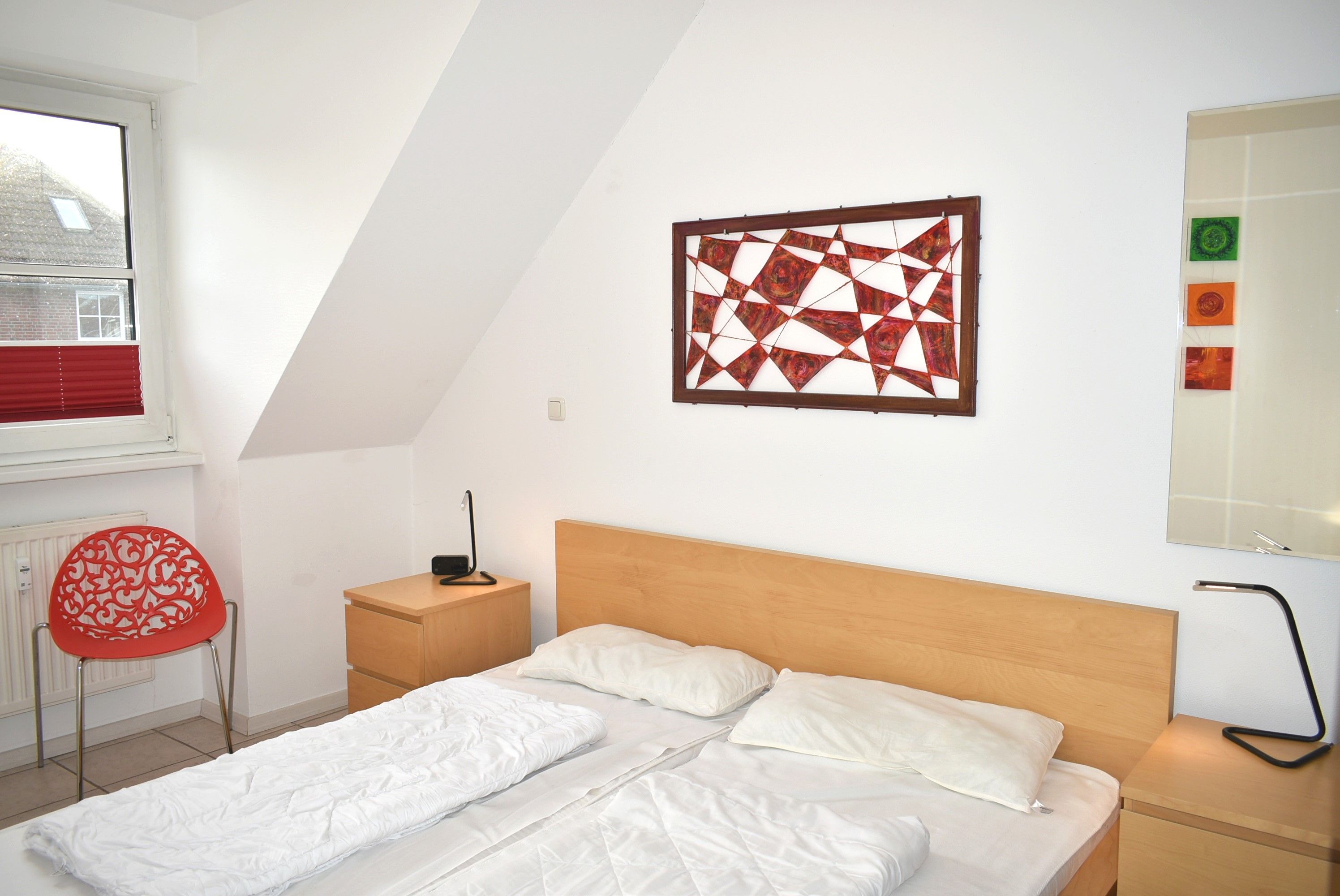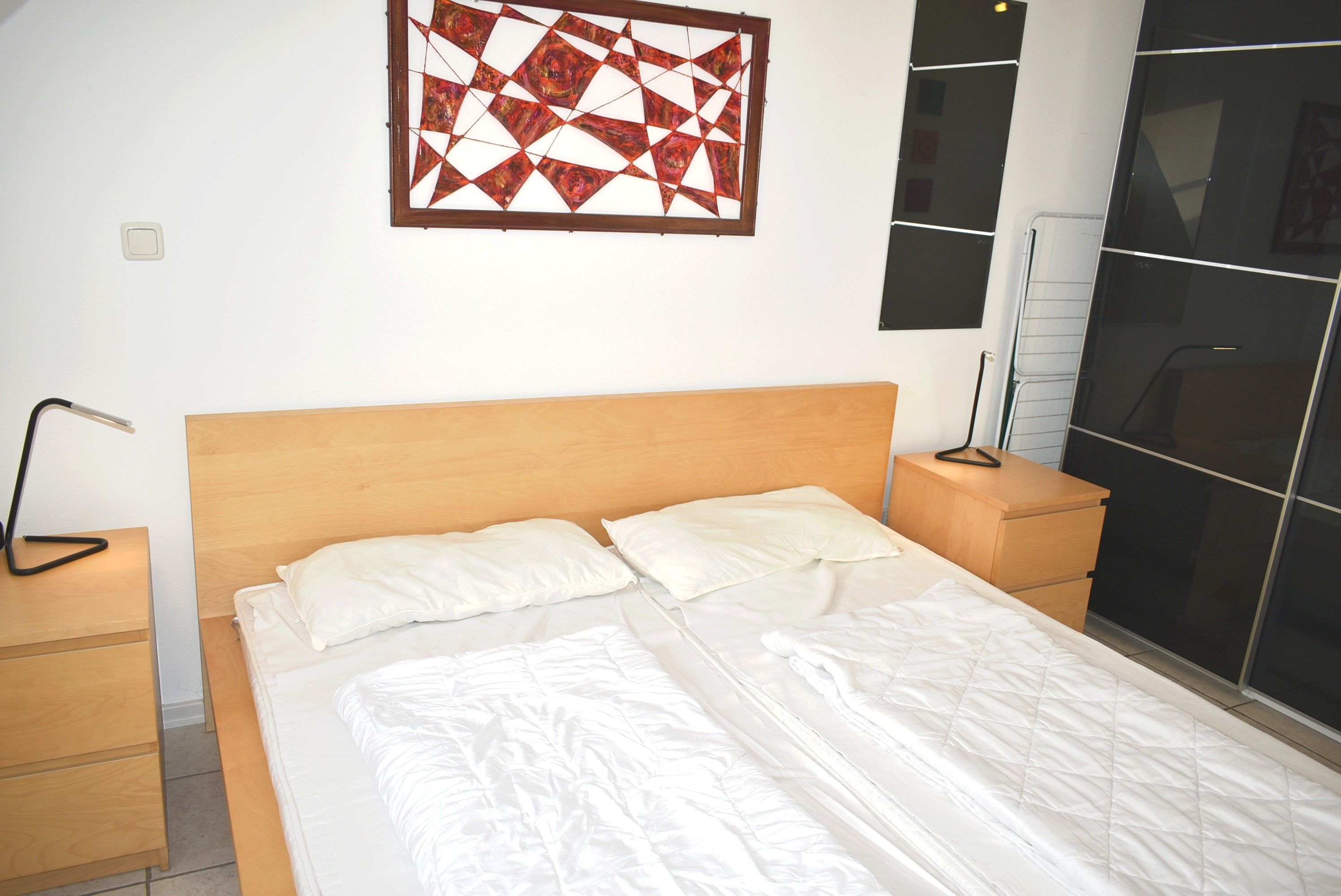 Schlafzimmer 1: Spiegel, 2 Matratzen, 2 Nachttische, 2 Nachttischlampen, Doppelbett 2,00 x 1,80 m, Kleiderschrank, Stuhl, Wäscheständer, verdunklungsplisee