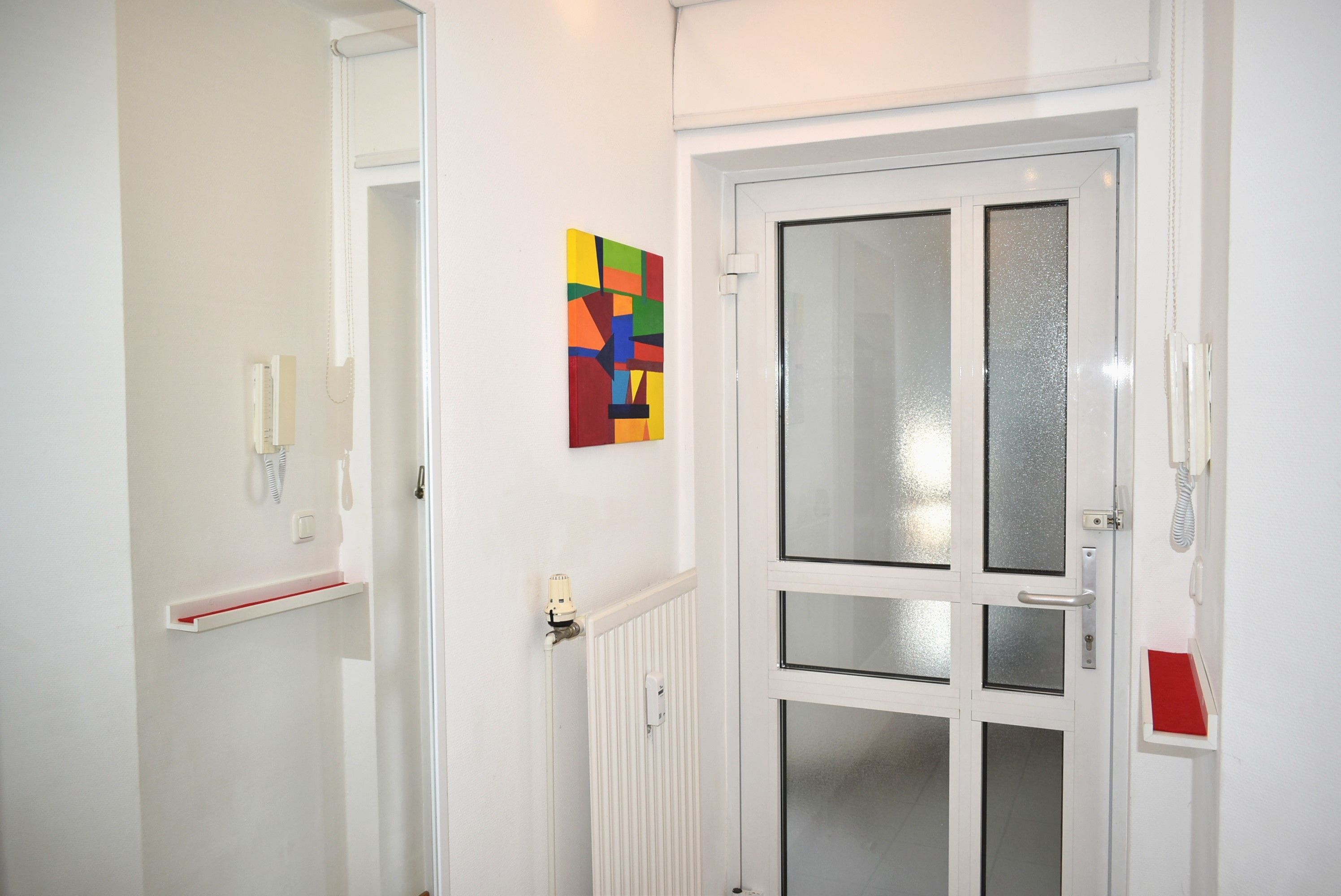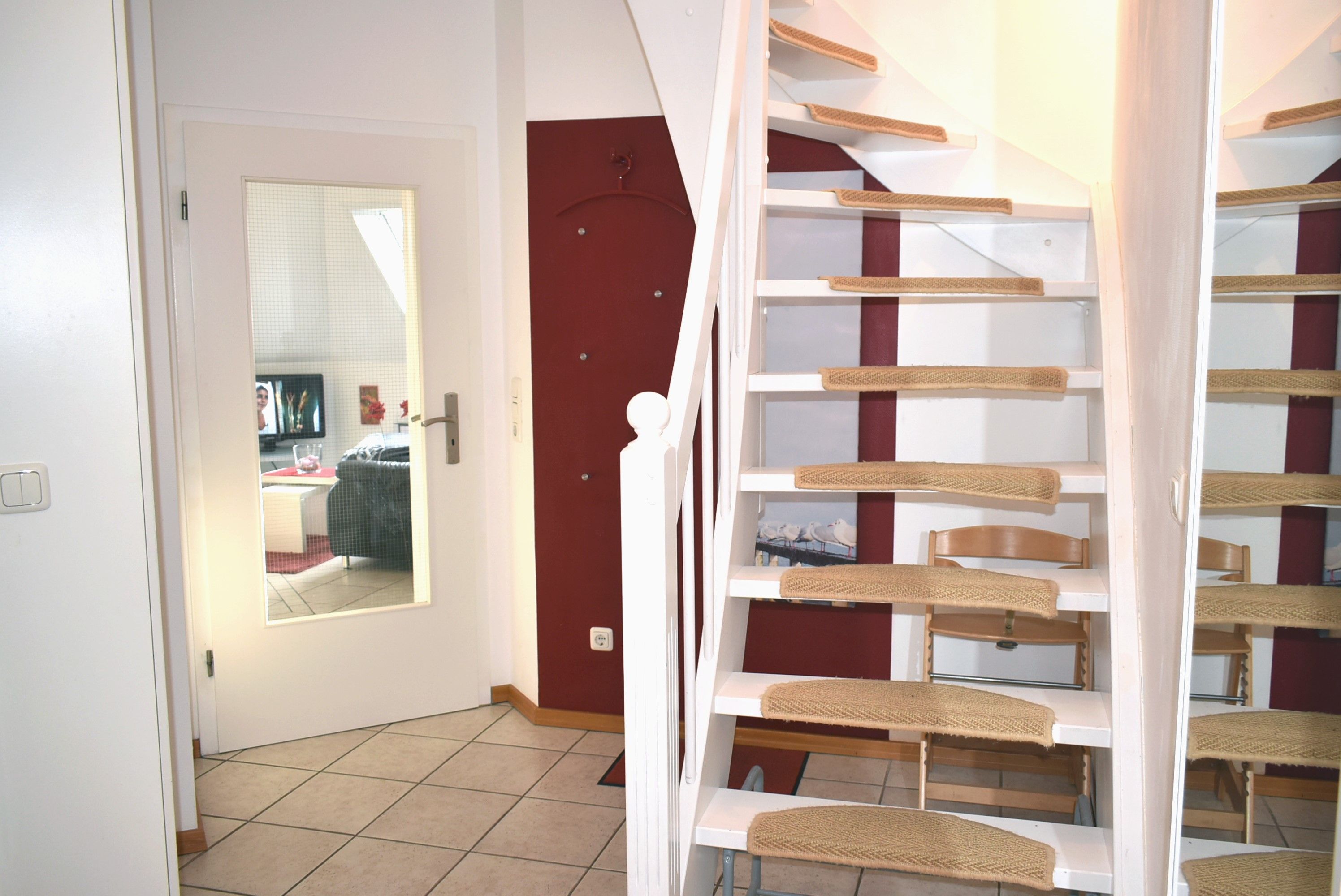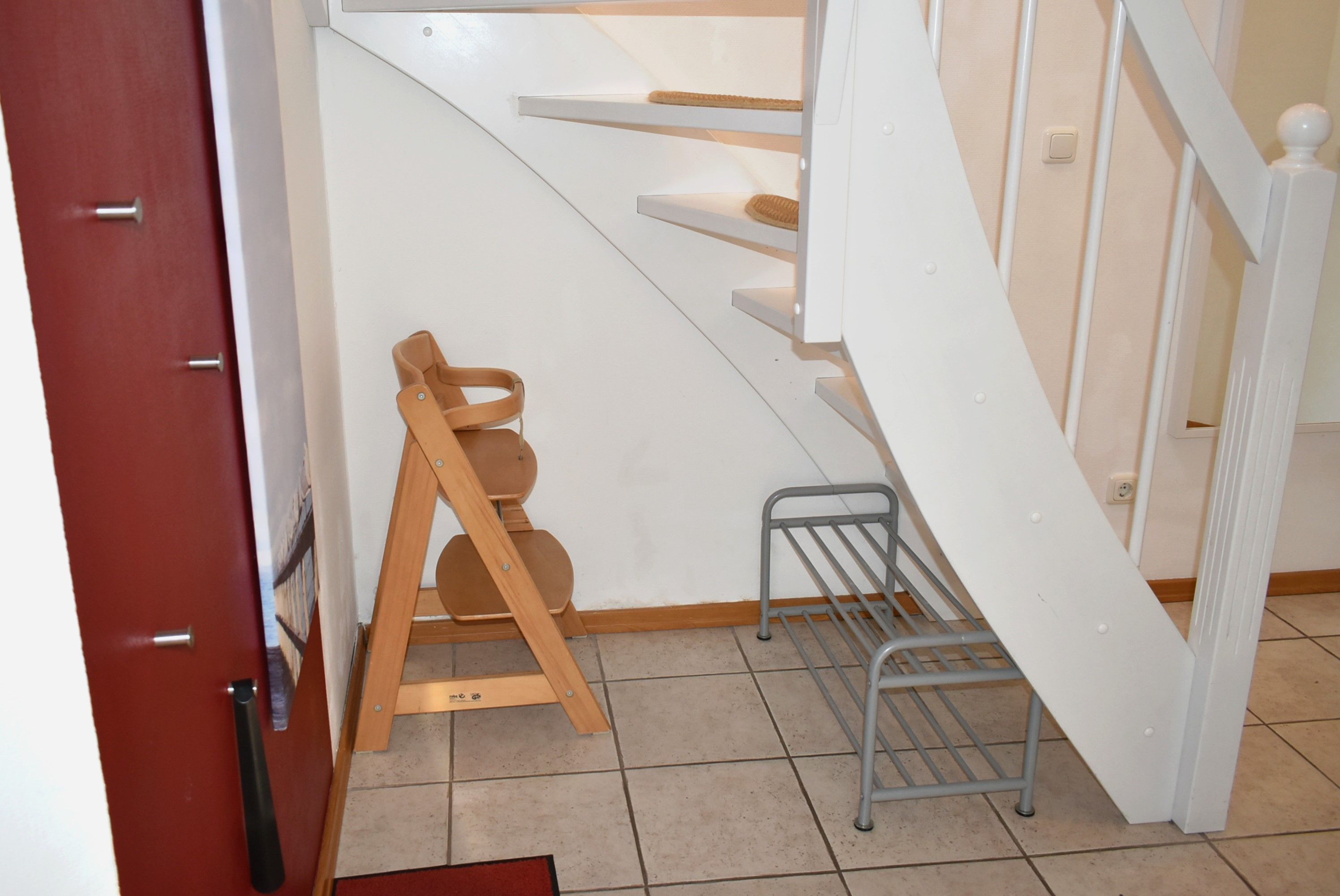 Flur: Spiegel, Garderobe, Schrank, Wischer mit Eimer, Staubsauger, Schuhregal, Kinderhochstuhl inkl., Tür Verdunklung, Besen