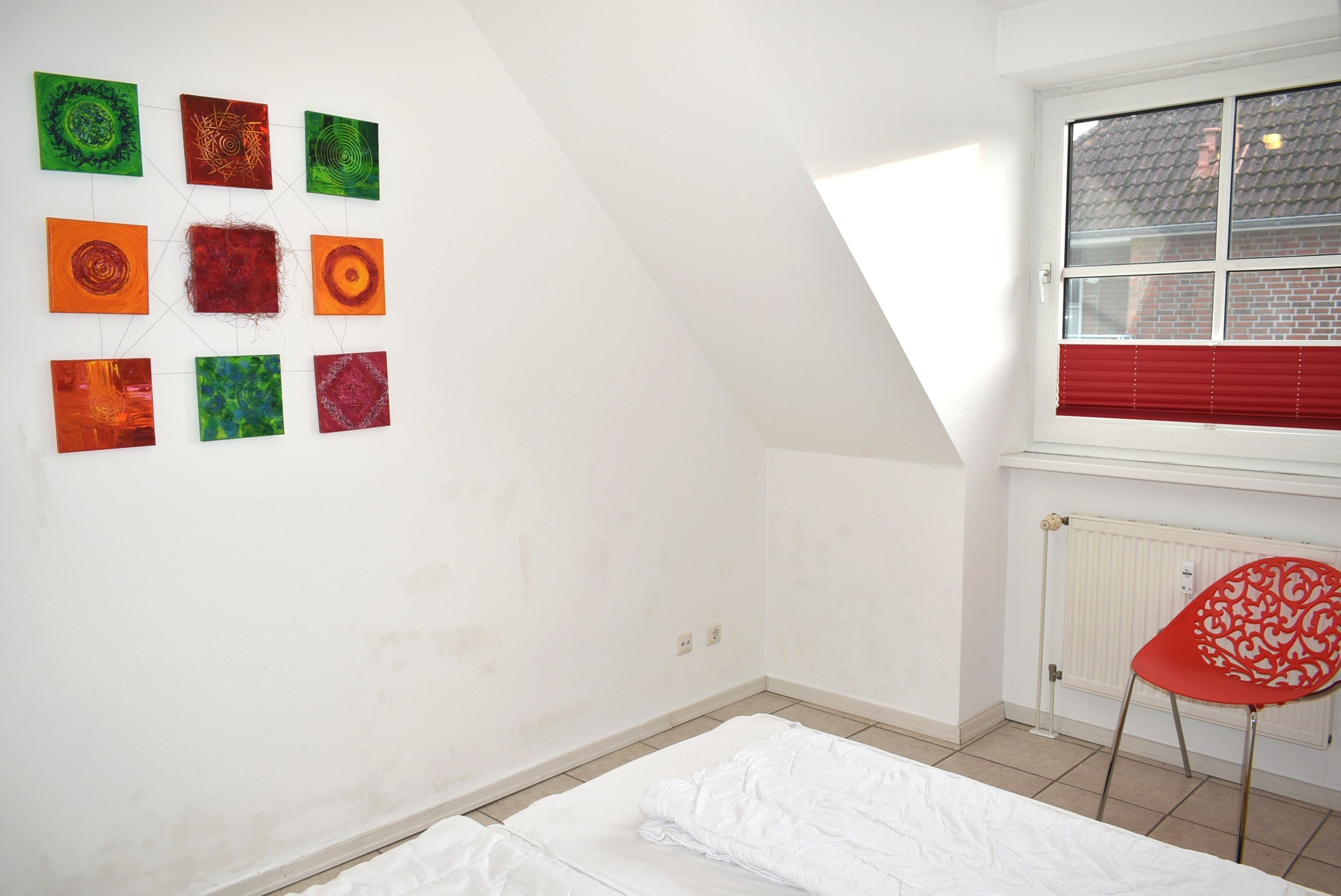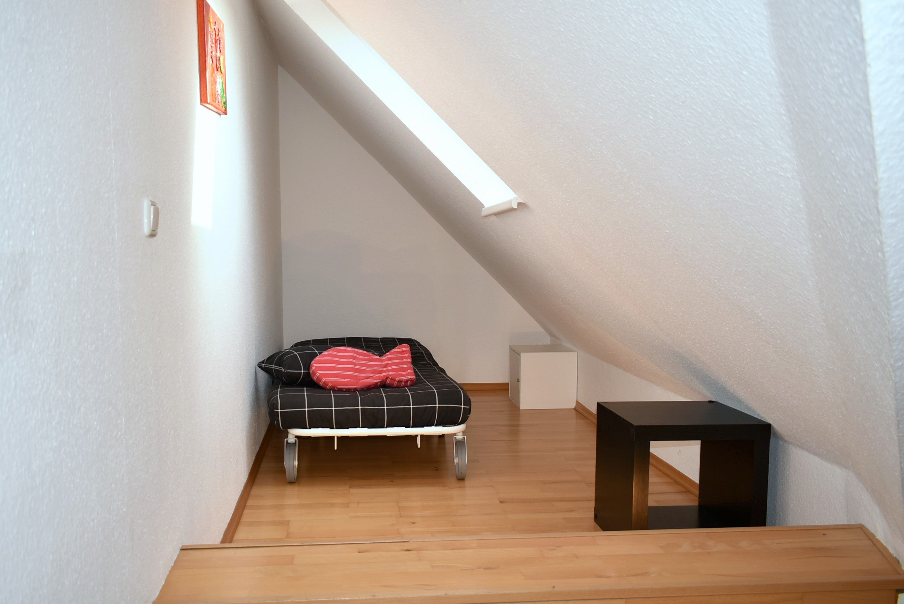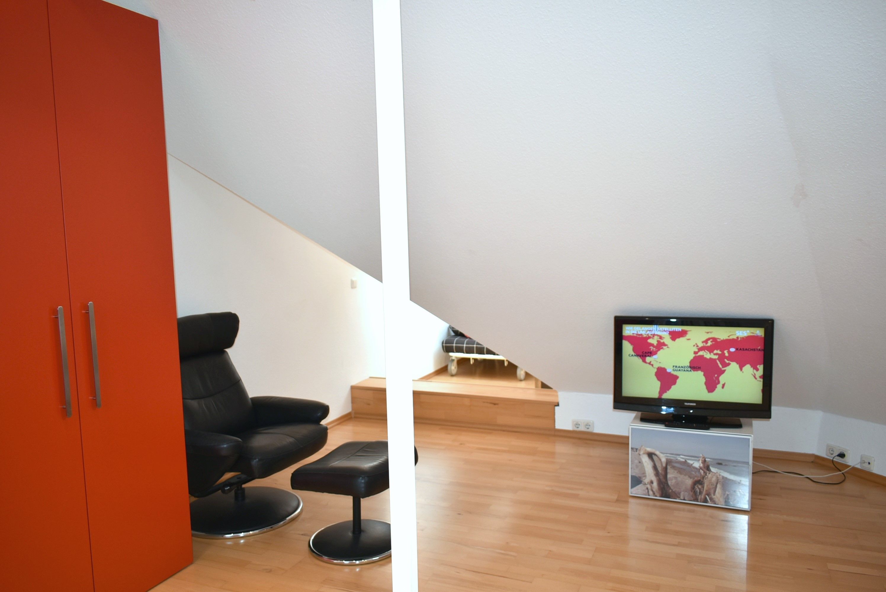 Schlafzimmer 2: 2 Einzelbett 2,00 x 0,90 m, Schlafsessel 2,05 m lang, 2 Nachttische, 2 Nachttischlampen, Sessel mit Hocker, Flachbildschirm, Kabel-TV, TV-Tisch, ein Kinderreisebett ohne Matratze inkl., verdunklungsrollos, 2 Regalwürfel