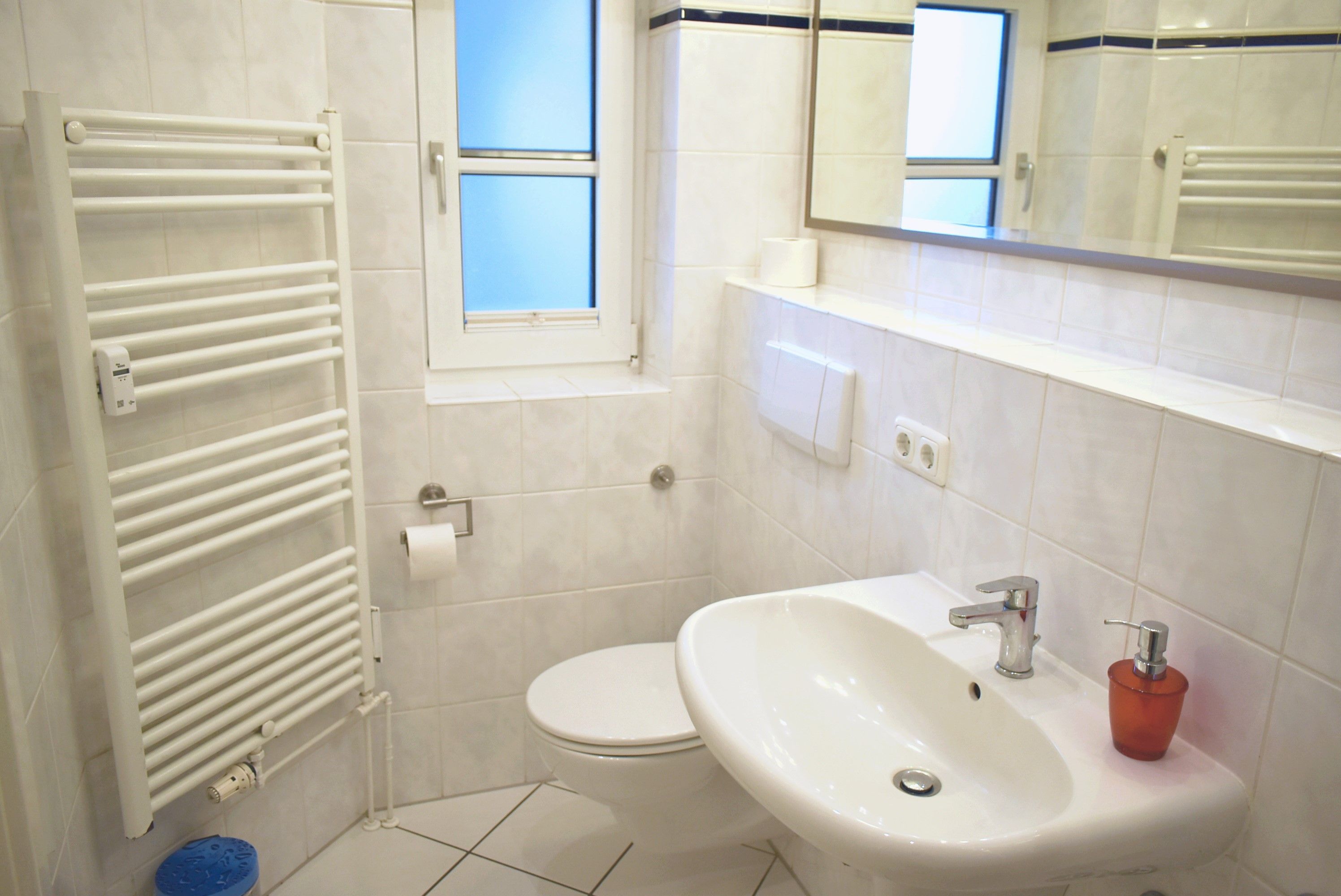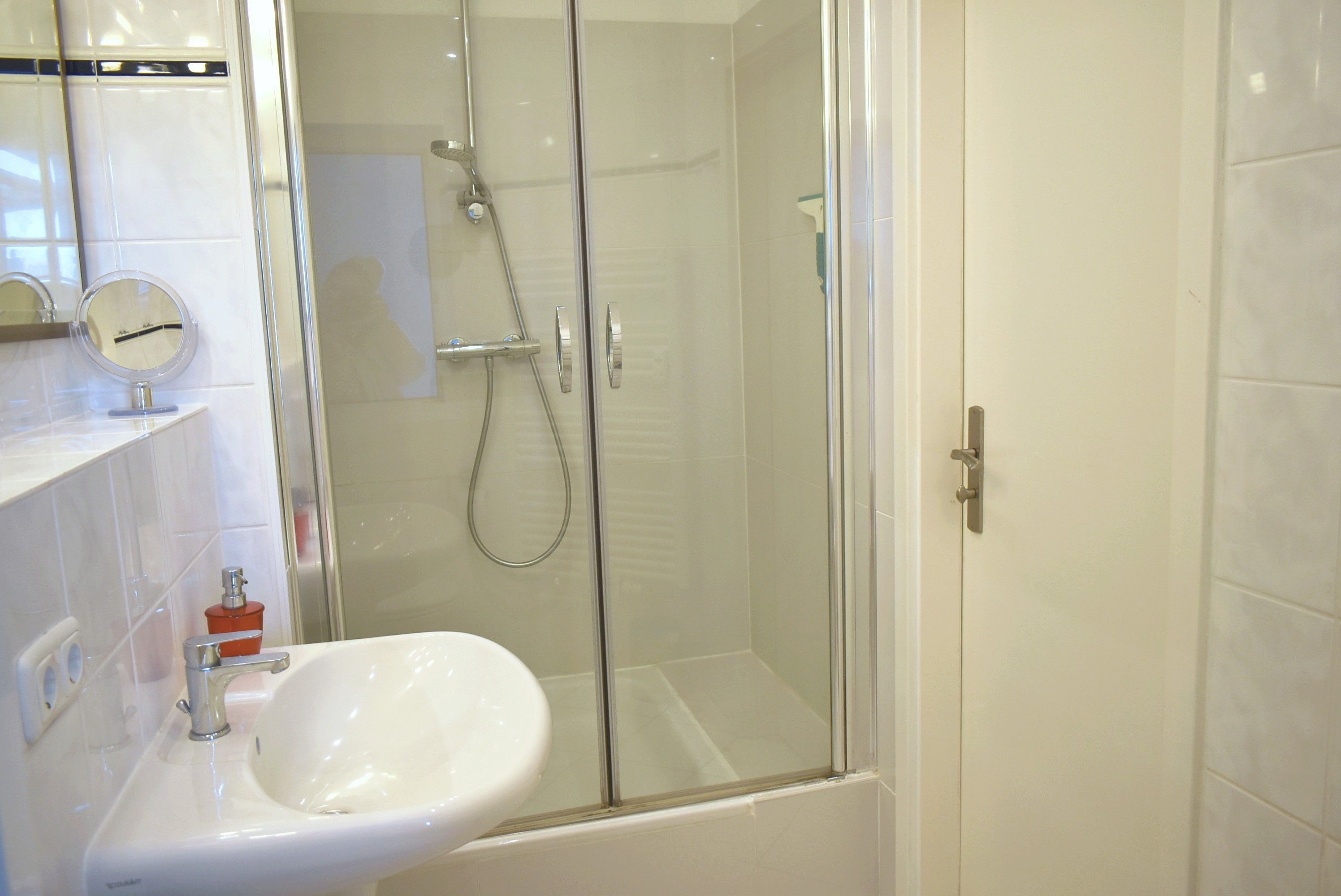 Bad : Duschkabine, Kosmetikspiegel, Spiegel, Waschbecken, WC, Fön