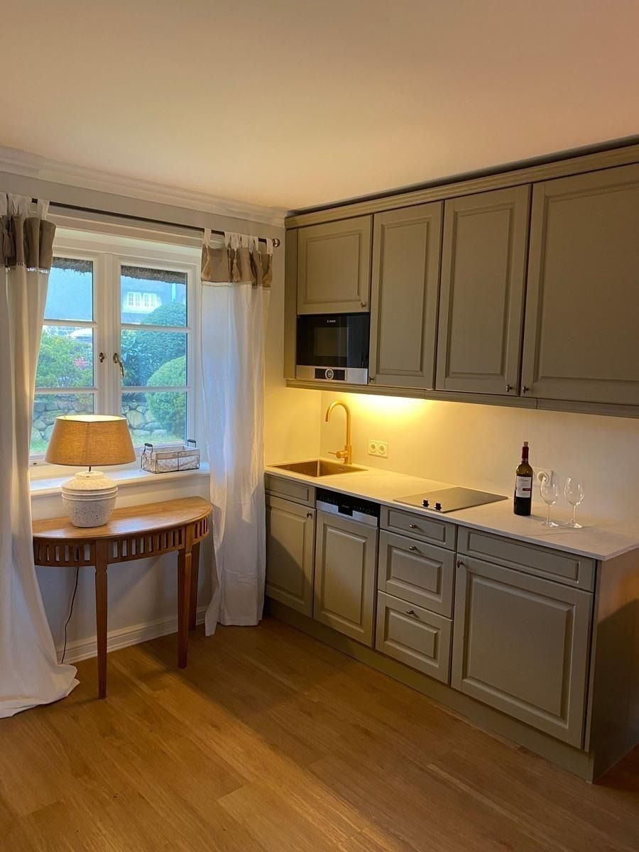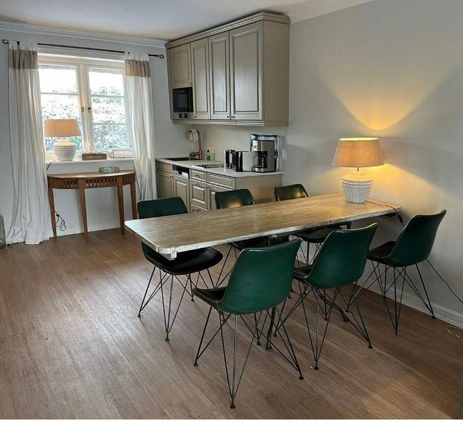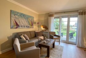 Die Wohnung wird in der Ausstattung gehobenen Ansprüchen gerecht. Im WohnEssbereich prägen helle, zum Teil schwedische Antiquitäten das Ambiente.Fussbodenheizung. Die Abendsonne scheint auf den Essplatz,während der Blick in den Vordergarten schweift.Neben dem Wohnessraum / Küchenzeile voll ausgestattet mit Mikrowelle,Geschirrspüler etc. verfügt das Appartement über 2 separate Schlafzimmer.Das1. Schlafzimmer ist mit einem gemütlichen Boxspringbett von 1,80 M.sowie einem großen Einbauschrank versehen Das 2. Schlafzimmer mit einem Doppelbett von 1,40M. und ebenfalls einem Wandschrank, sowie ein Bettsofa 1.40. EG u.UG In dem großzügigen Badezimmer gibt es Fussbodenheizung und einen erwärmbaren Handtuchhalter, eine bodentiefe Dusche, WC.