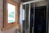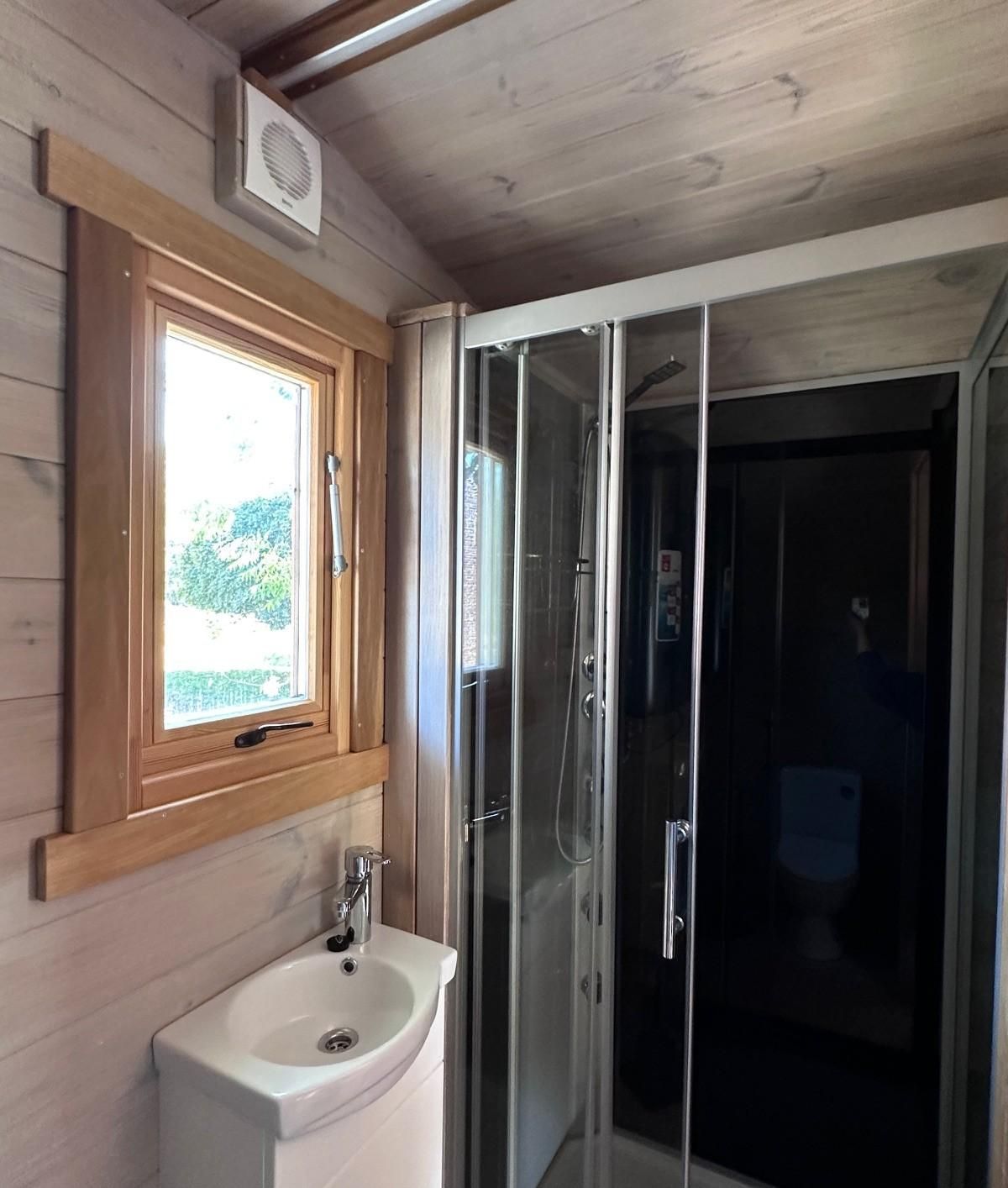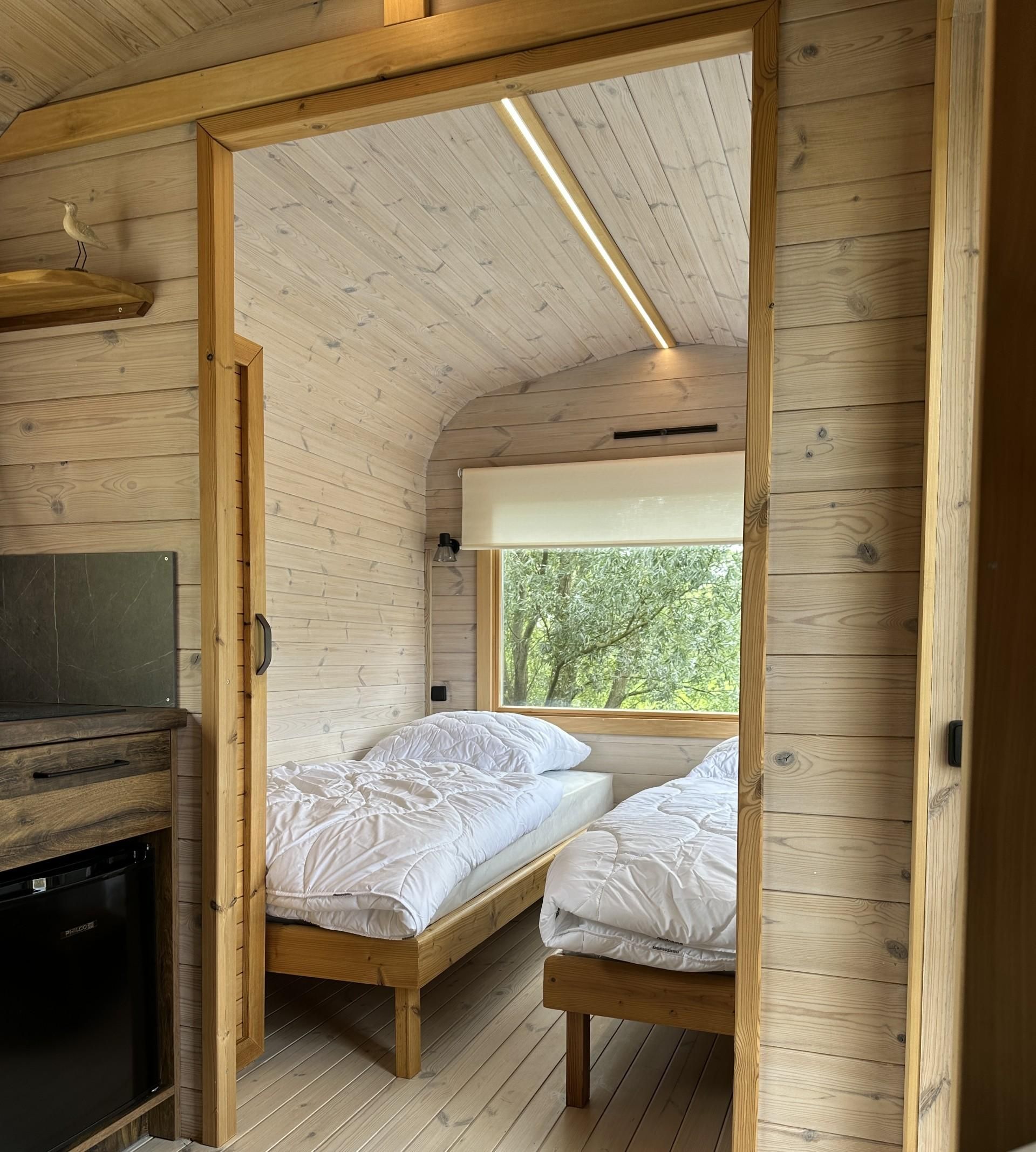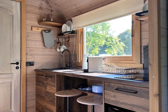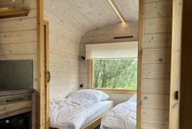 Das Tiny-Haus in Bauform eines Schlaffasses für zwei Personen bietet eine komfortable Grundausstattung in schönem Holzdesign mit zwei Einzelbetten (90x200cm), großem Panorama-Fenstern, kleiner Pantry-Küche mit Essbereich und Bad mit Dusche und WC. Eine Sitzmöglichkeit mit Tisch und Stühlen befindet sich vor dem Schlaffass auf einer Terrasse.