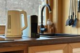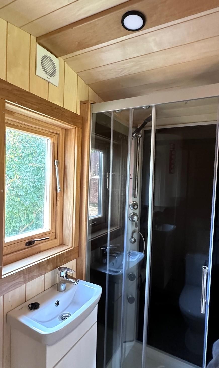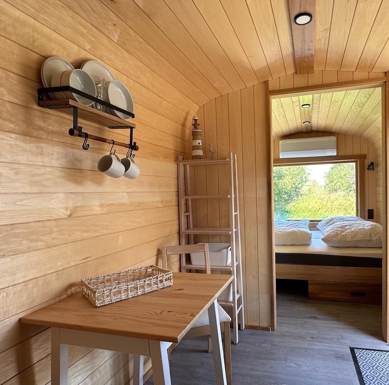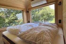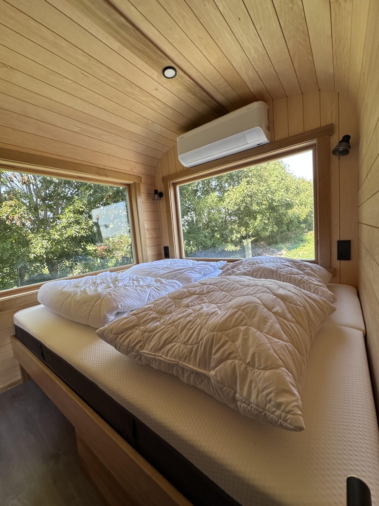 Das Tiny-Haus in Bauform eines Schlaffasses für zwei Personen bietet eine komfortable Grundausstattung in schönem Holzdesign mit einem Doppelbett (160x200cm), großem Panorama-Fenstern, kleiner Pantry-Küche mit Essbereich und Bad mit Dusche und WC. Eine Sitzmöglichkeit mit Tisch und Stühlen befindet sich vor dem Schlaffass auf einer Terrasse.