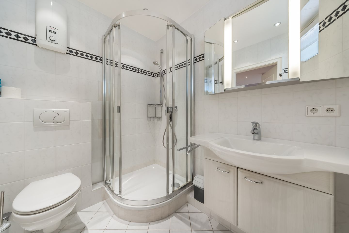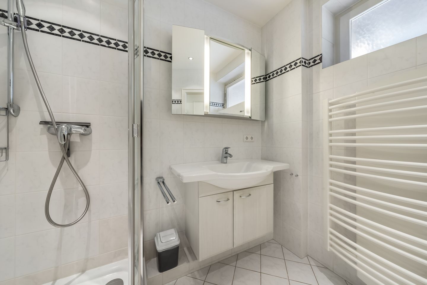 Badezimmer: Helles Bad mit Dusche, WC, Handtuchhalter und Fenster.