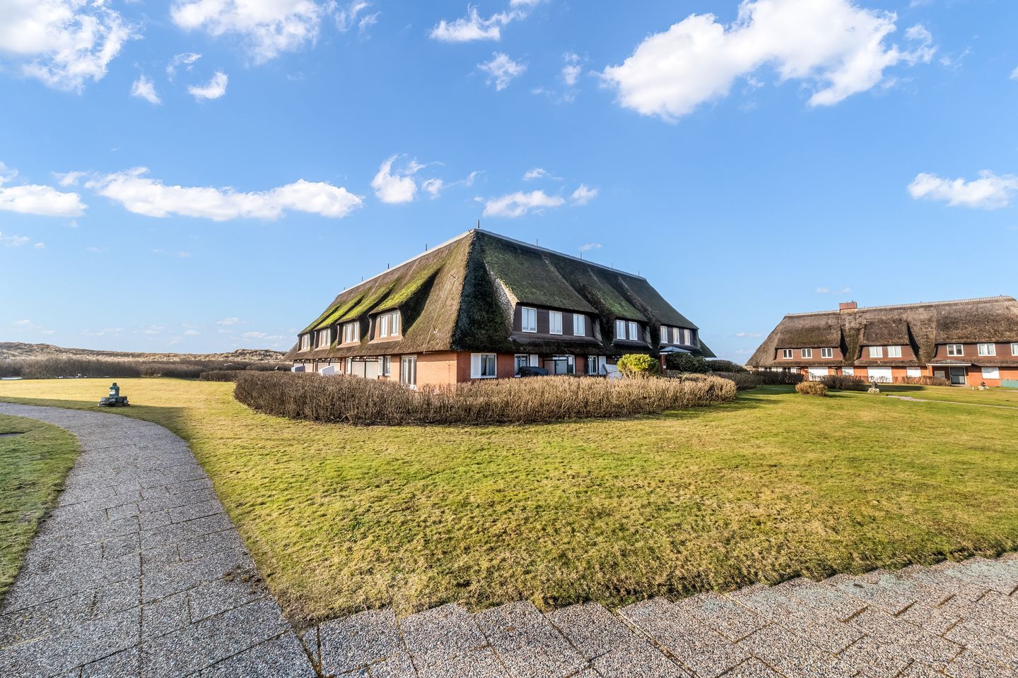 Dieses helle Feriendomizil liegt im ersten Obergeschoss in einer schönen Anlage unter Reet. Die Wohnung zeichnet sich durch einen fantastischen Meer- und Dünenblick in bester Lage von Kampen sowie eine hochwertige Einrichtung mit Tischlereinbauten und Eichenholz-Parkettboden aus. Der Übergang zum Kampener Hauptstrand liegt nur 500 Meter von der Haustür entfernt, die Uwe-Düne ist in 350 Metern zu erreichen.