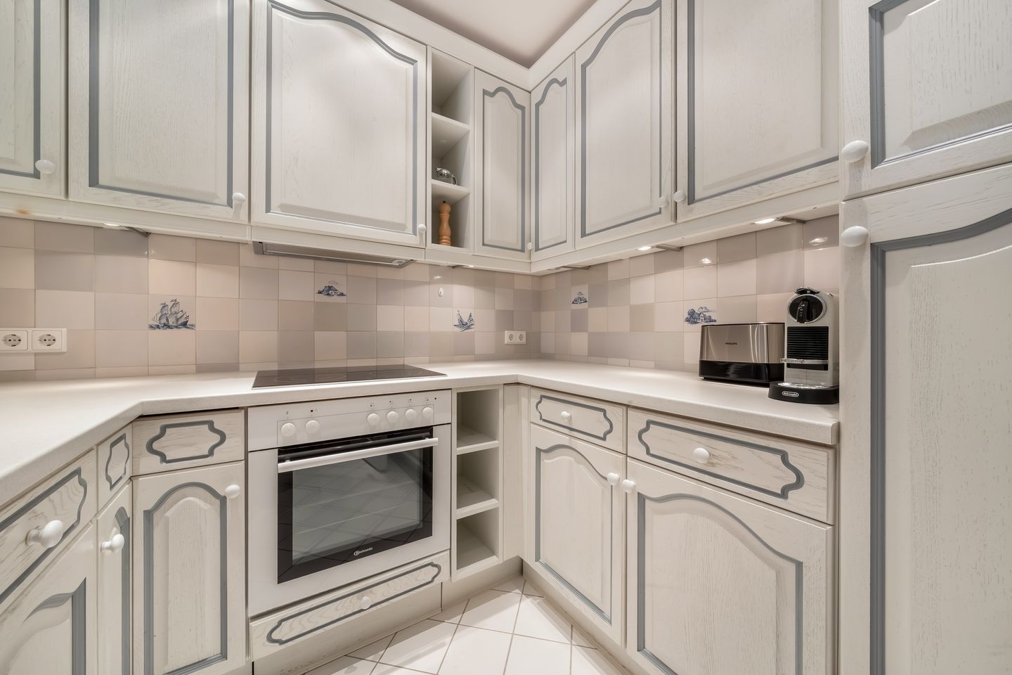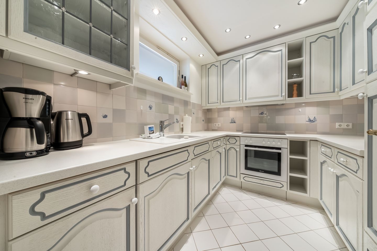 Küche: Die separate Küche im Landhausstil ist gut ausgestattet und verfügt über viel Stauraum für Lebensmittel und Vorräte sowie eine eingebaute Geschirrspülmaschine und Waschmaschine.