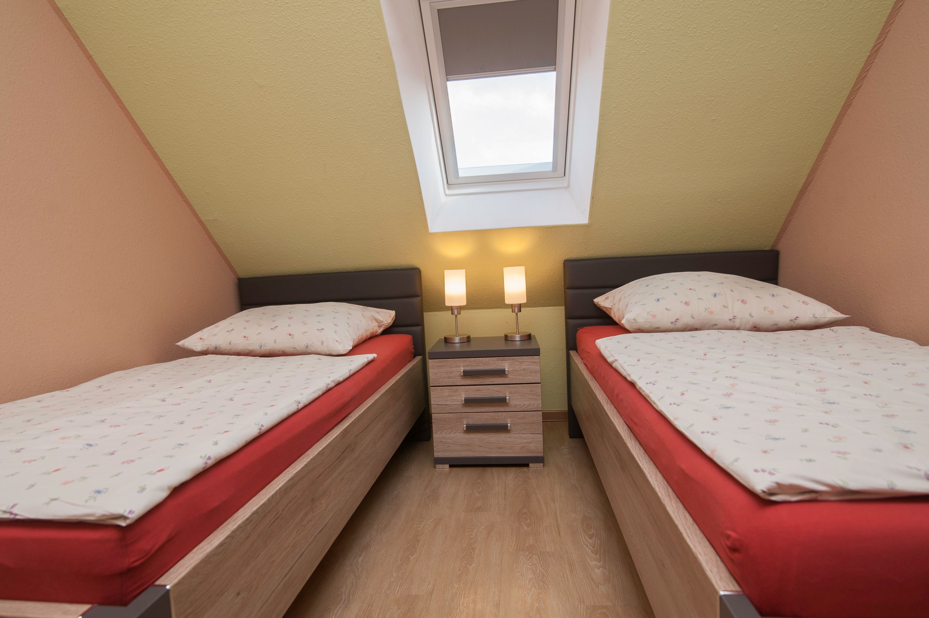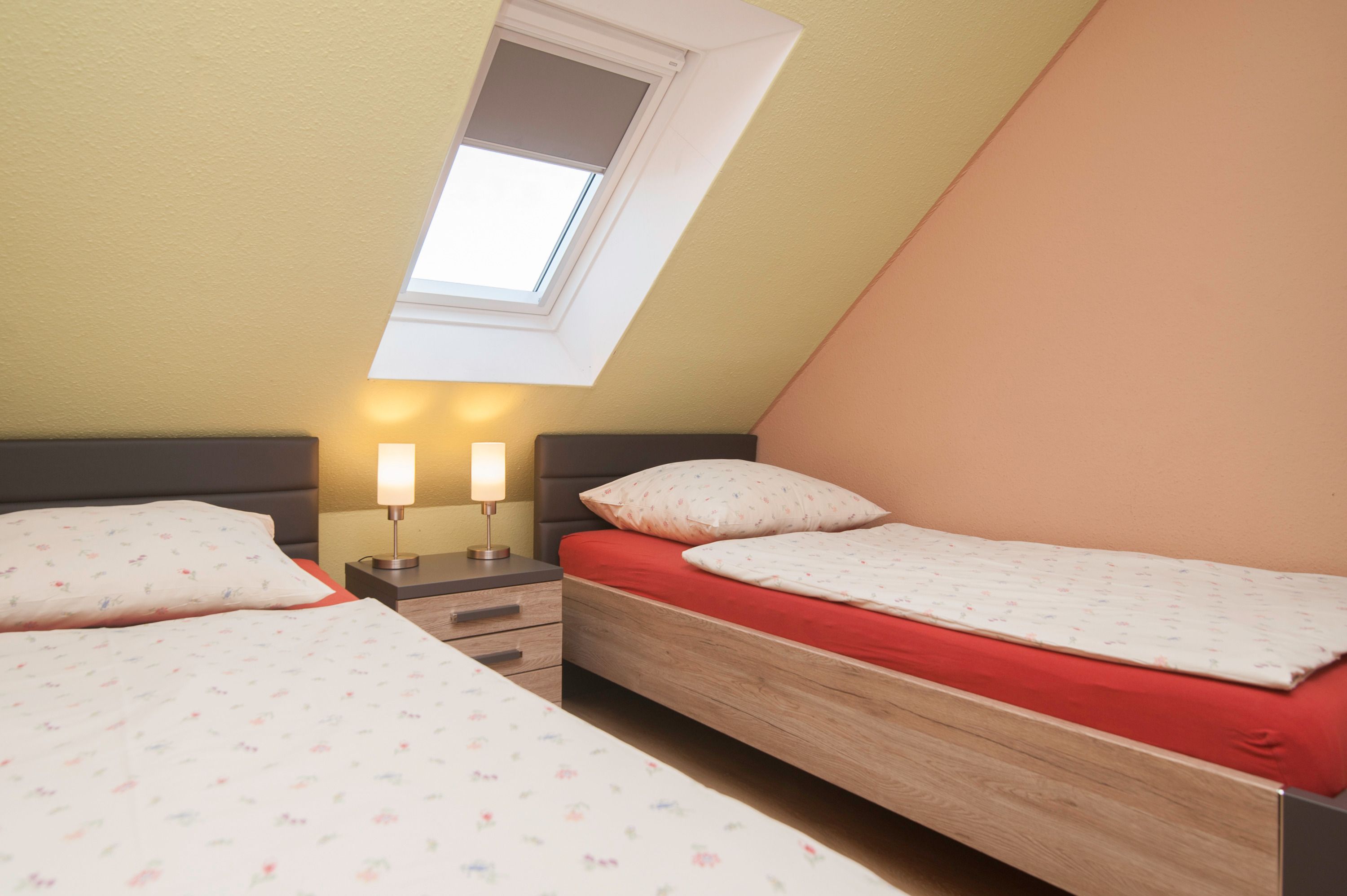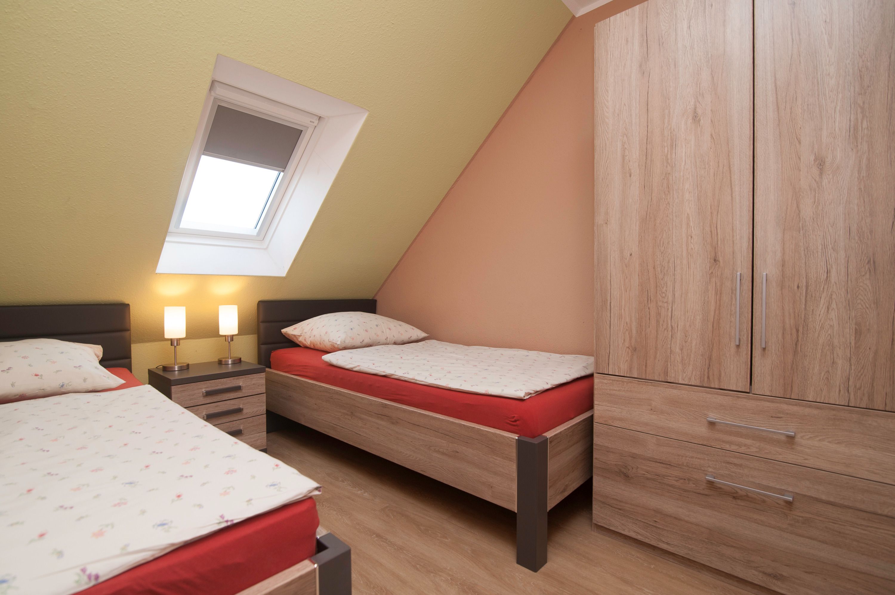 Im Obergeschoß befinden sich ein Badezimmer mit Dusche (niedriger Einstieg) und zwei Schlafzimmer, eines mit Doppelbett (2 x 90 x 200 cm) und Innenplissee, das zweite Schlafzimmer mit 2 Einzelbetten (90 x 200cm), Innenplissees und Verdunkelungsrollo.