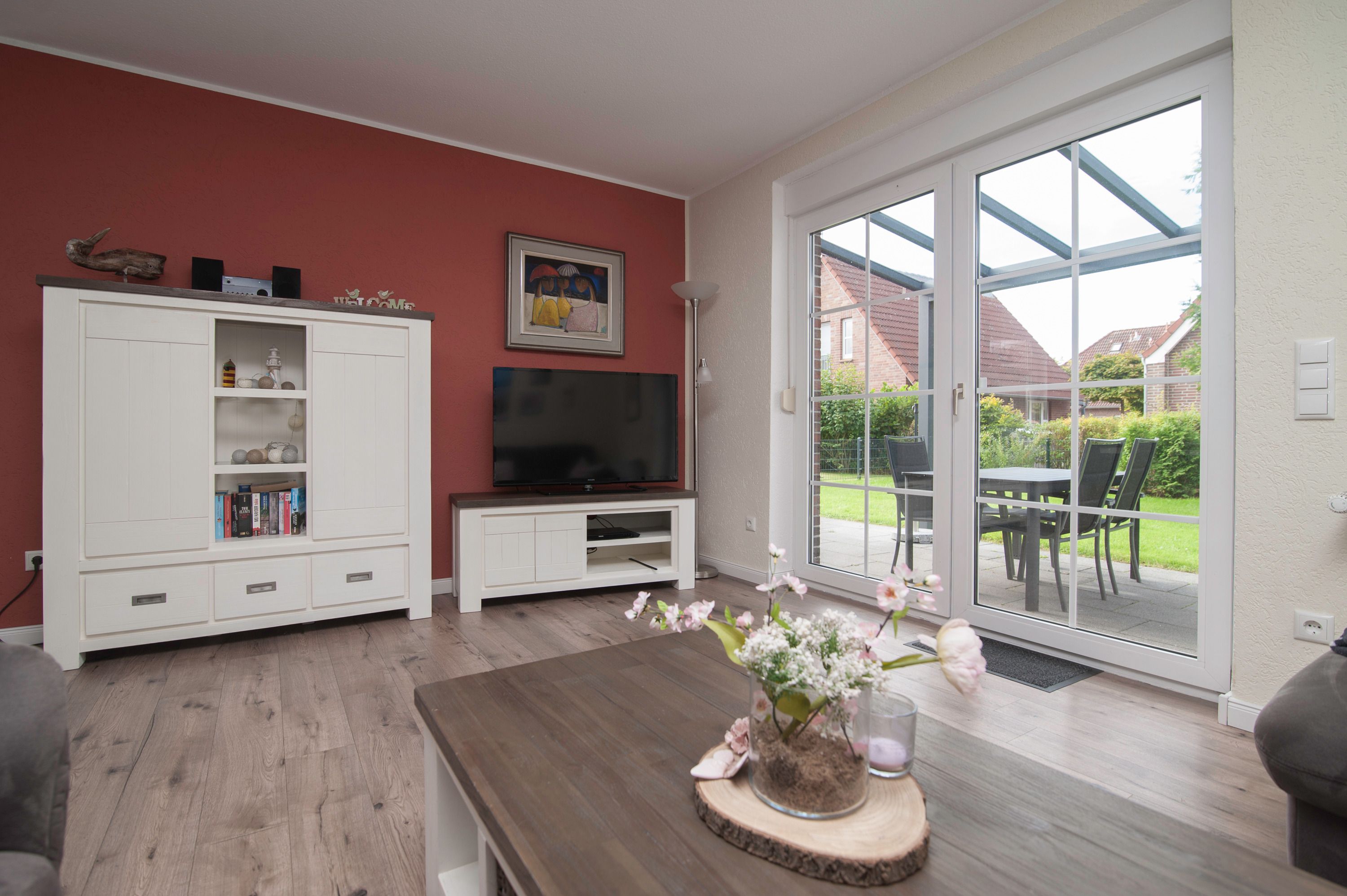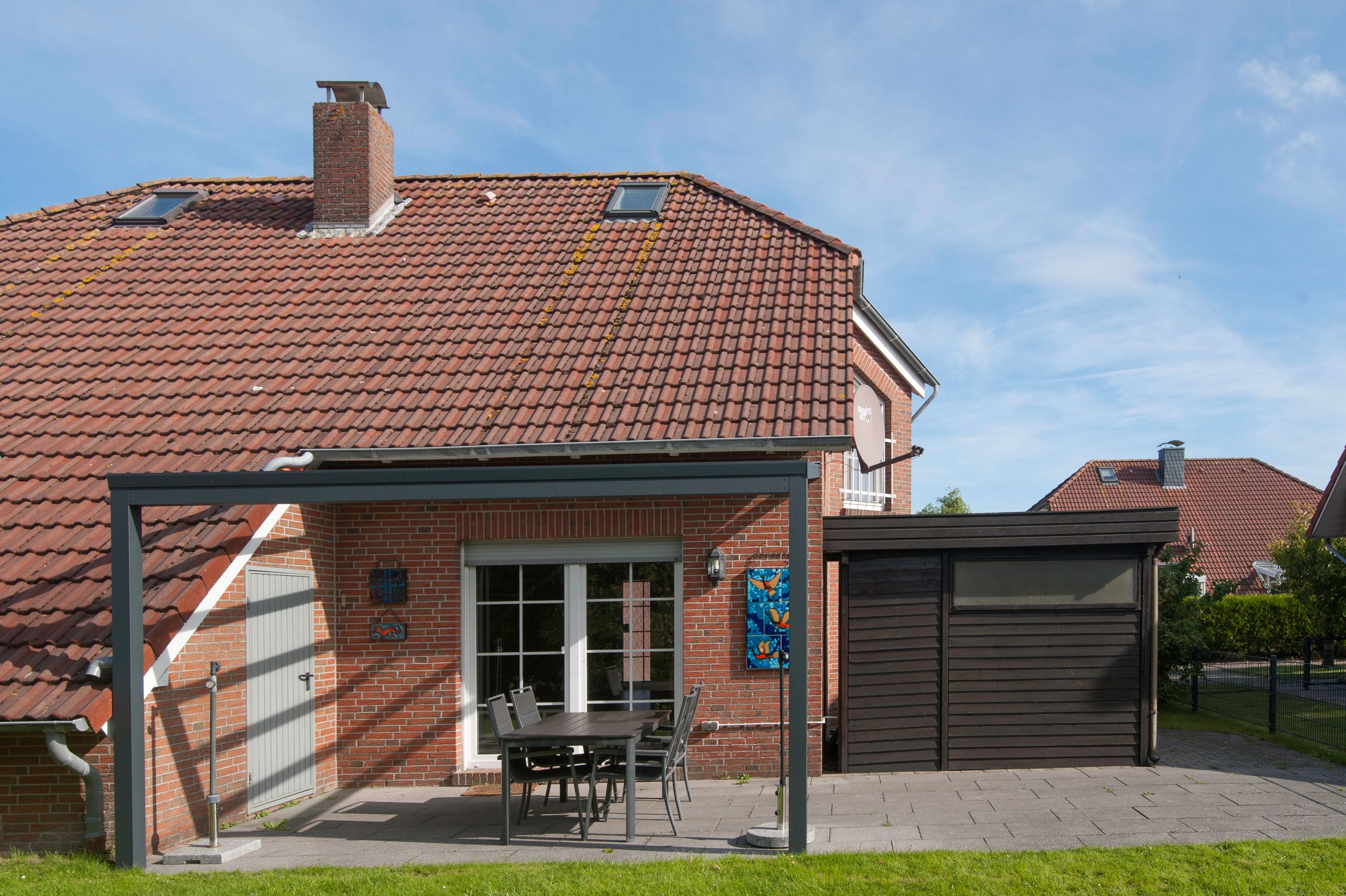Eine sonnige Terrasse mit Gartenmöbeln lädt zum Erholen und Abschalten ein. Durch die bevorzugte Lage des Hauses in Deich- und Hafennähe erreichen Sie kleine und große Sehenswürdigkeiten bequem zu Fuß oder per Fahrrad an frischer Seeluft.