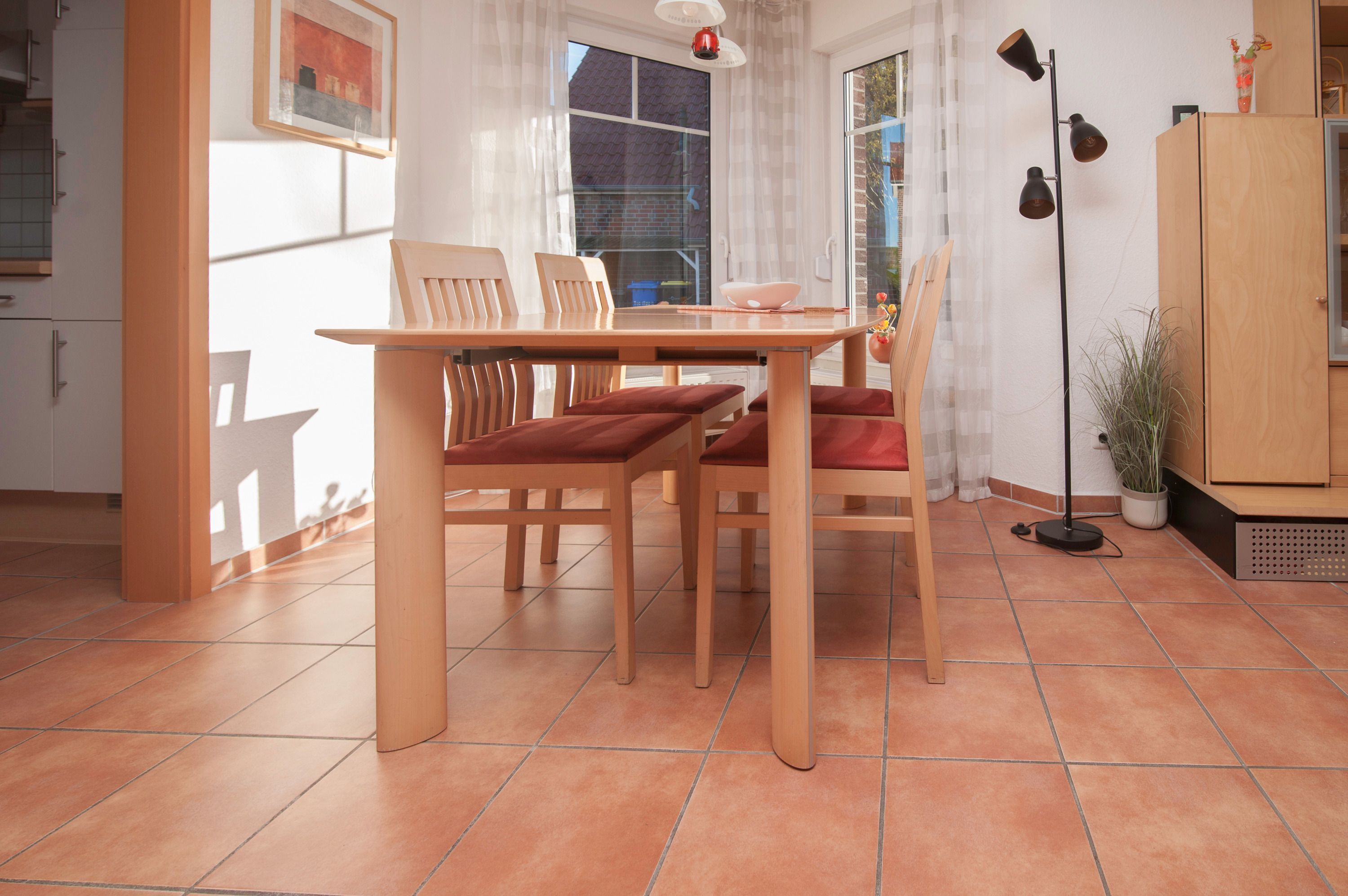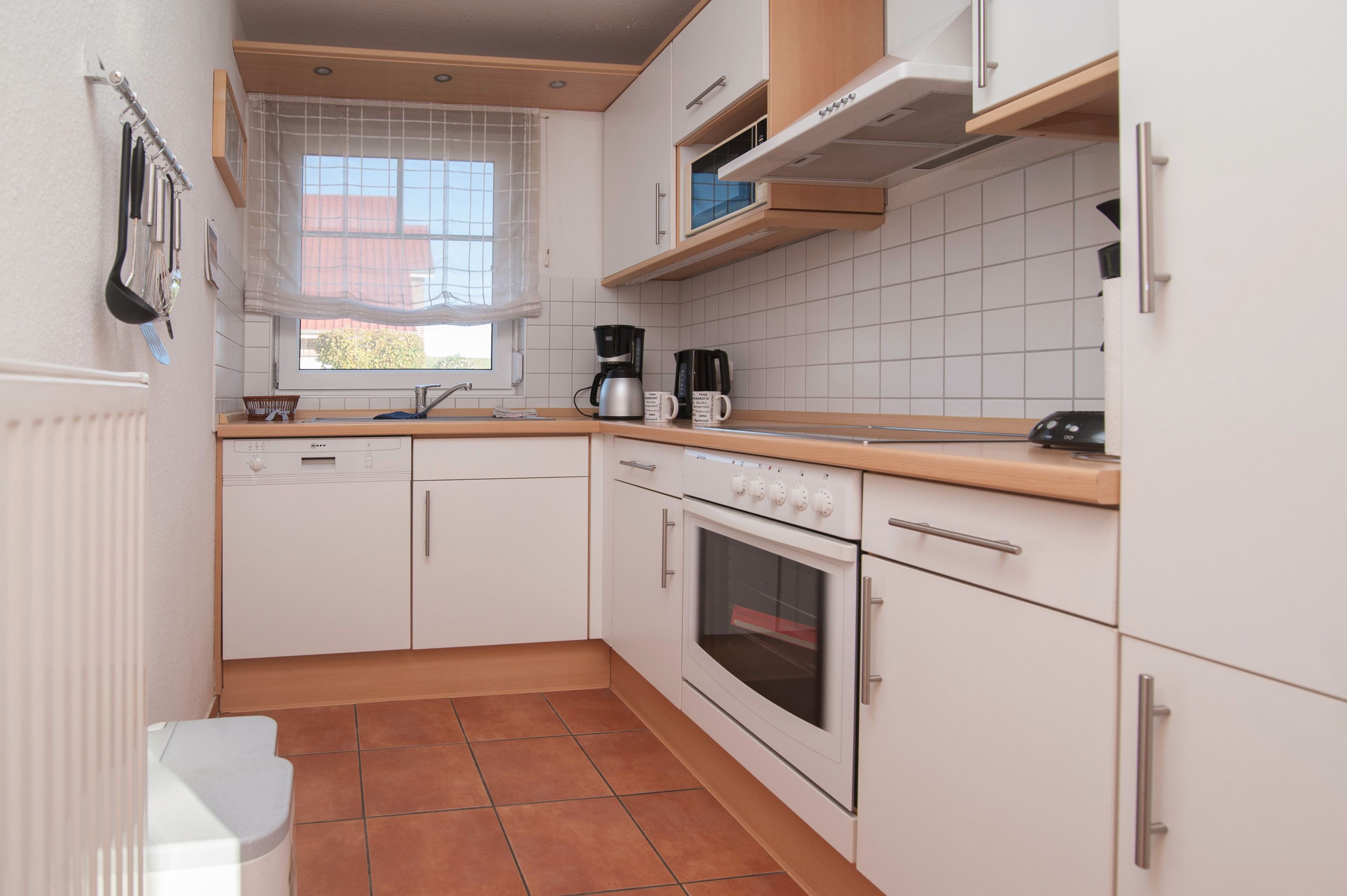 Einbauküche komplett ausgestattet, u.a. Herd mit Cerankochfeld, Dunstabzugshaube, Mikrowelle, Geschirrspüler, Kühlschrank mit Gefrierfach, Filterkaffee + Kaffeepadmaschine, Toaster und vielem mehr. Das Erdgeschoß ist komplett mit Fliesen ausgestattet und verfügt über Fußbodenheizung. Badezimmer mit Dusche, Waschbecken und WC, Waschmaschine (4kg) und Föhn im Obergeschoß, sowie ein Schlafzimmer mit einem Doppelbett (2 x 90 x 200cm) und einem 22Samsung LCD-TV. Ein zusätzliches Schlafzimmer mit zwei Einzelbetten (90 x 200cm) im Obergeschoß, alle Betten im Haus verfügen über verstellbare Lattenroste.