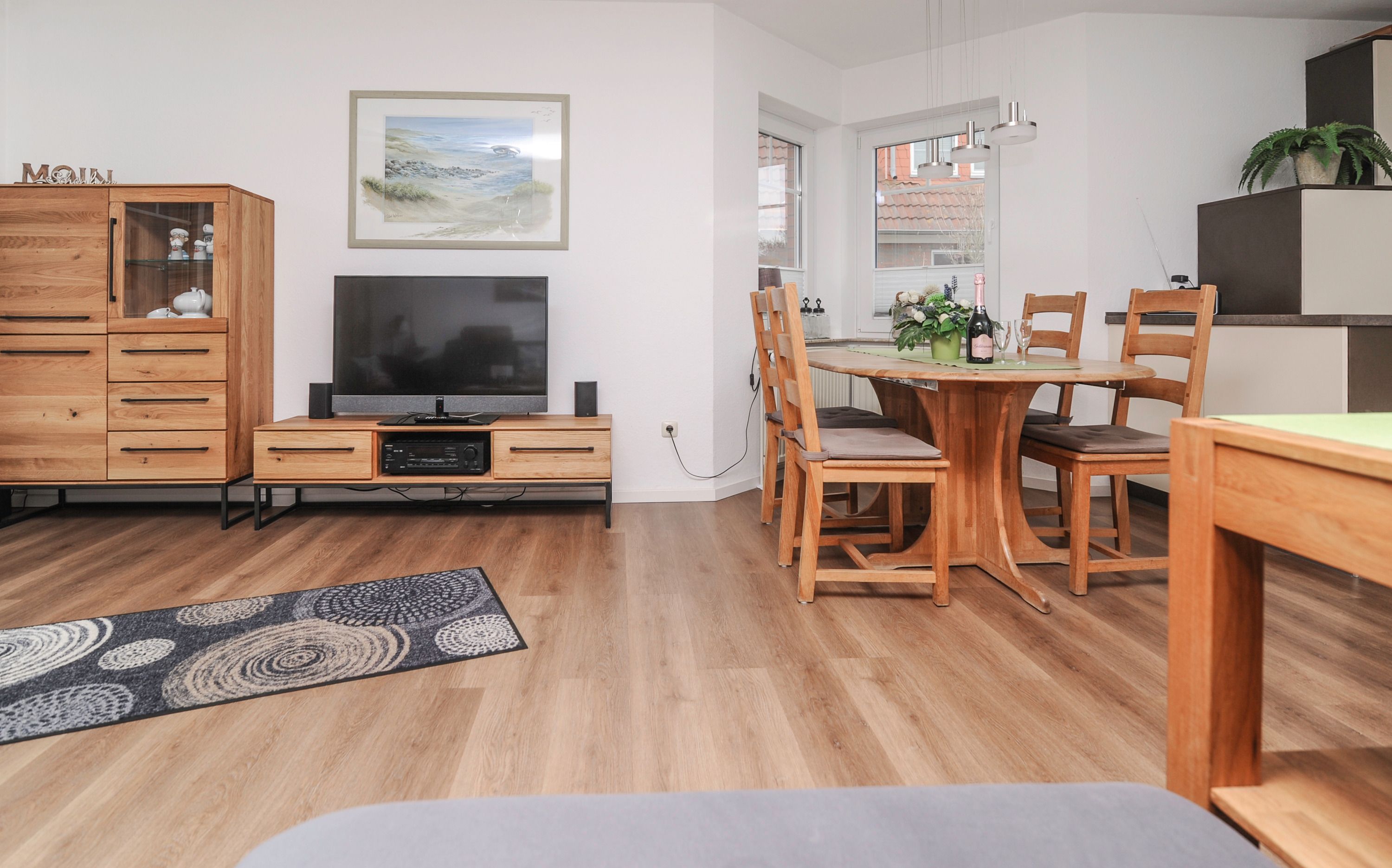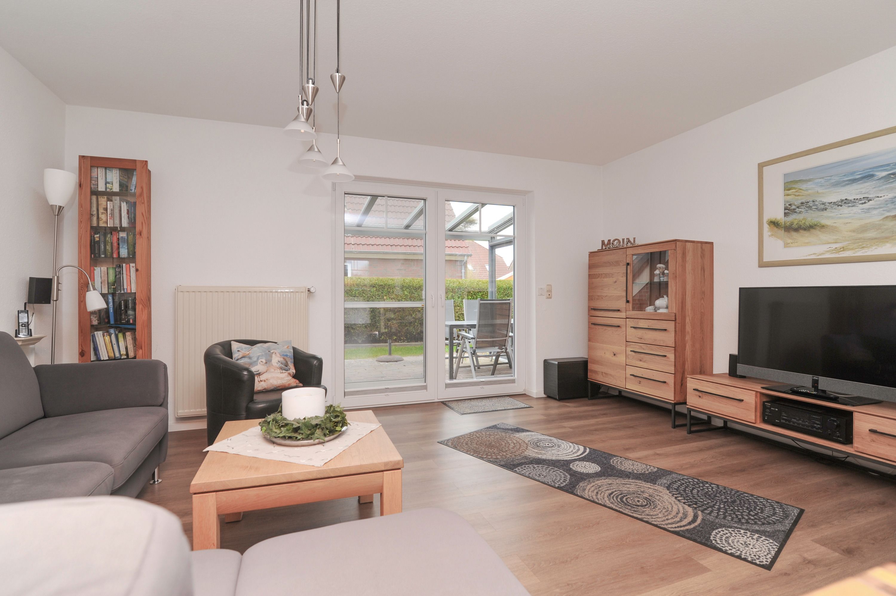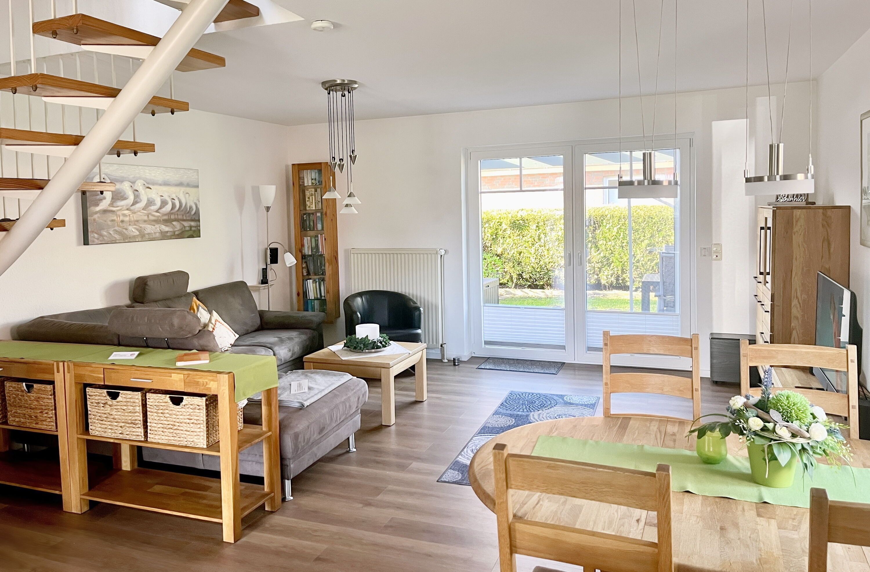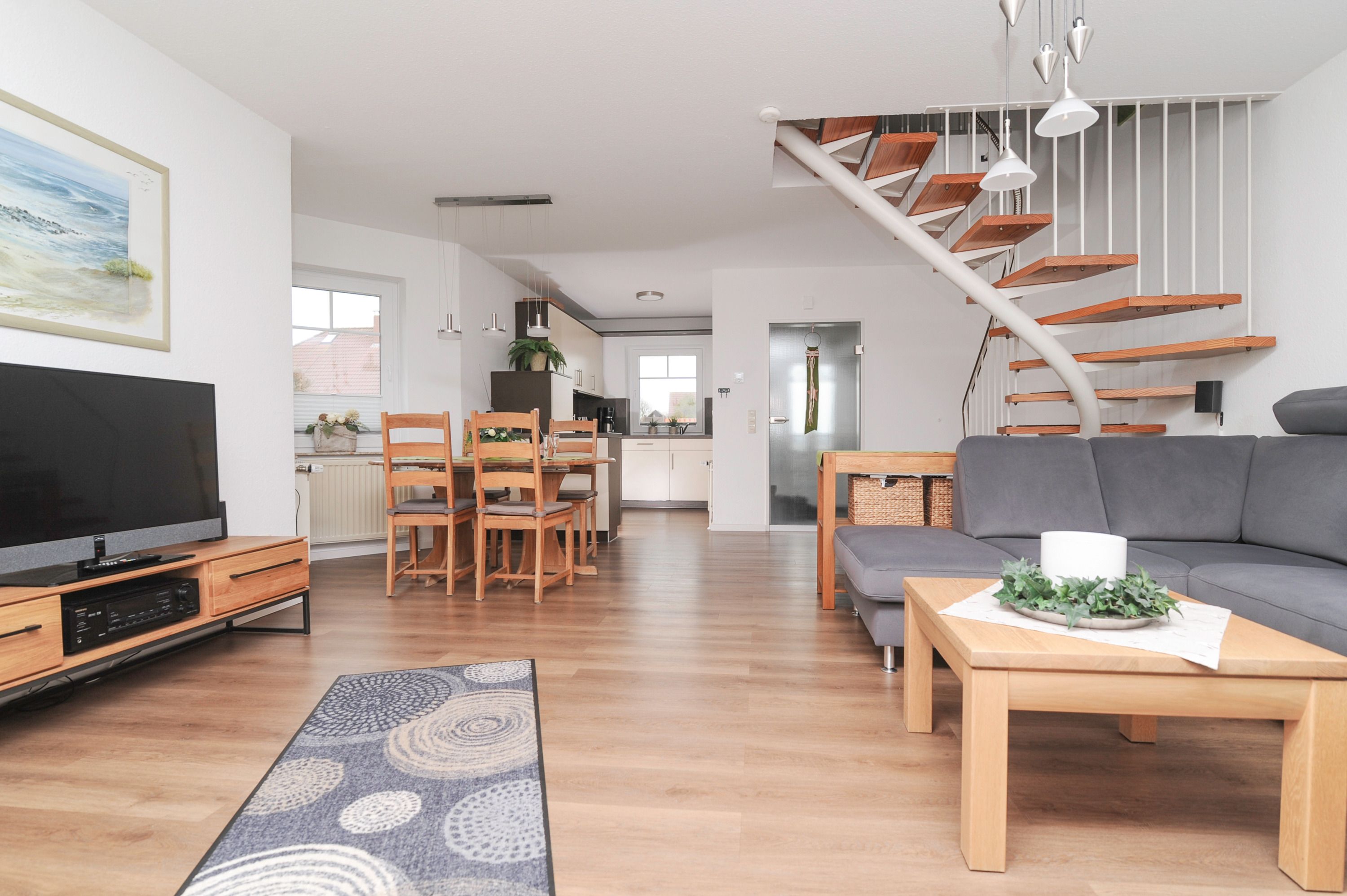 Das Haus bietet auf 2 Etagen einen angenehmen Komfort für die ganze Familie. Der geschmackvoll eingerichtete Wohnraum mit 42Metz FullHD LCD TV (Mediathek), bequemem Ecksofa, Stereoanlage, Essplatz für 4 Personen sowie ein DAB+ Radio, kostenlosem Glasfaser WLAN-Gastzugang und Telefon stehen für Sie bereit. Die offene Einbauküche ist komplett ausgestattet: Herd mit Cerankochfeld, Dunstabzugshaube, Geschirrspüler, Kühlschrank mit Gefrierfach, Filterkaffeemaschine, Toaster und vielem mehr bietet Ihnen alle Annehmlichkeiten für einen erholsamen Urlaub.