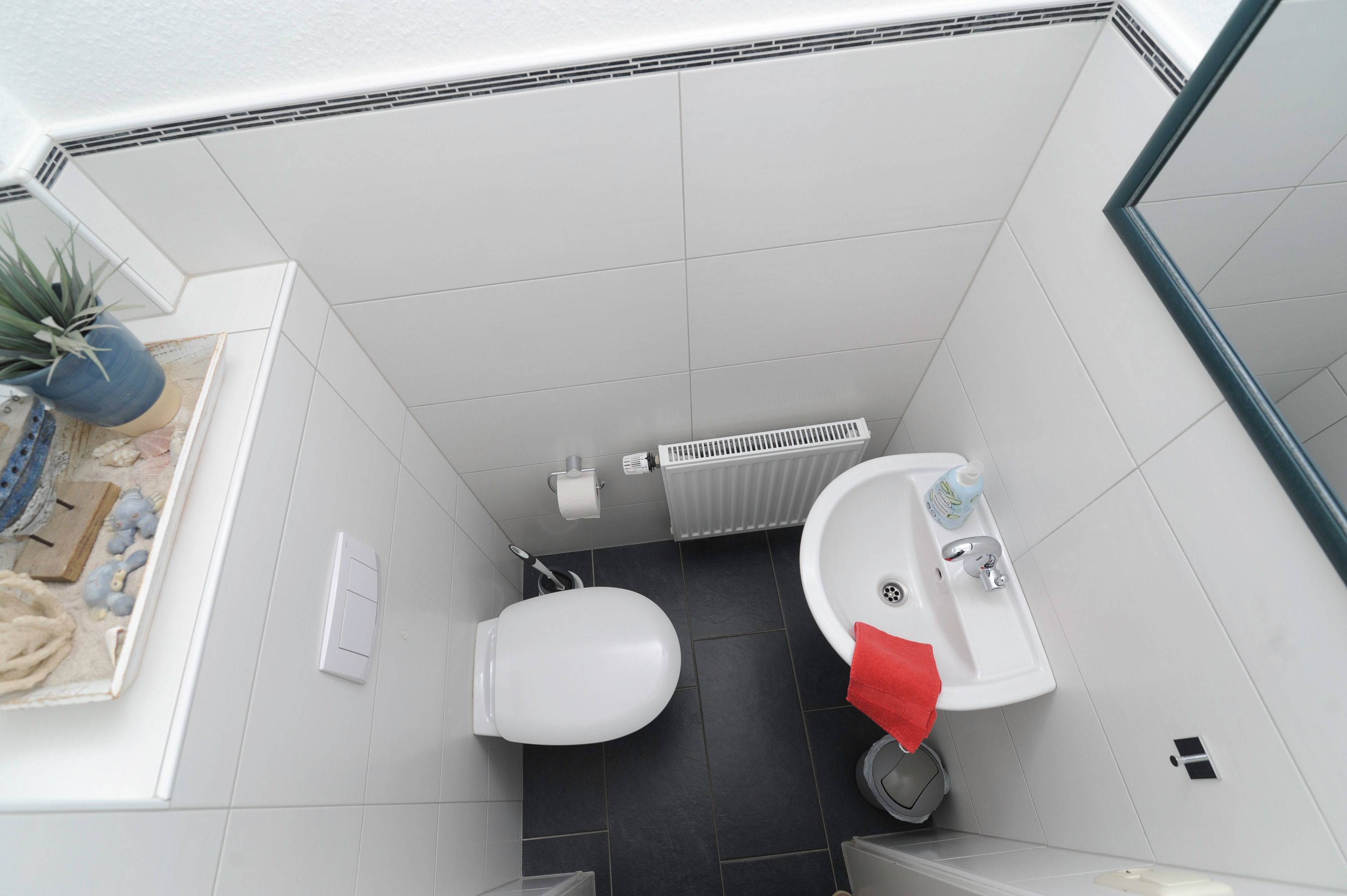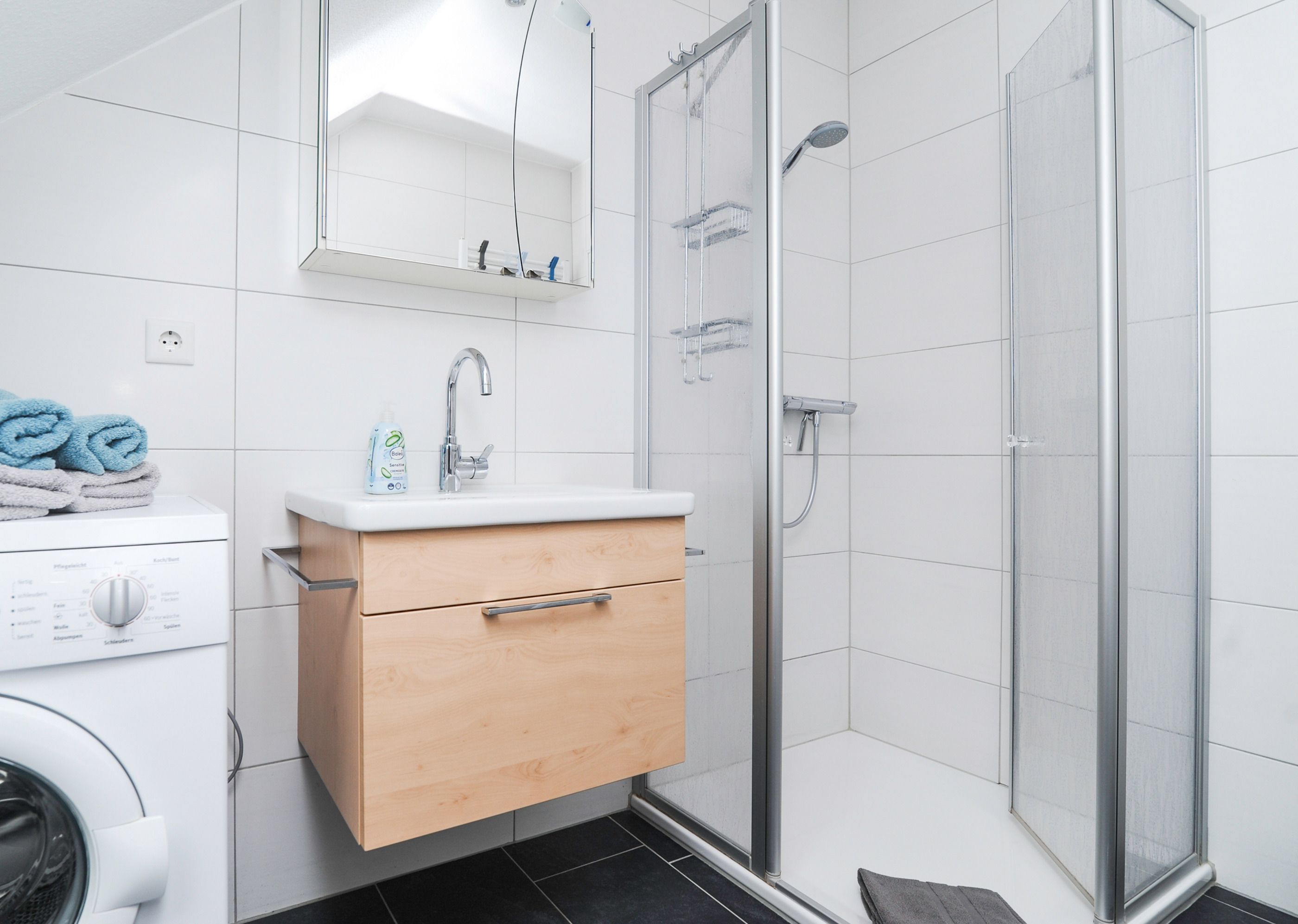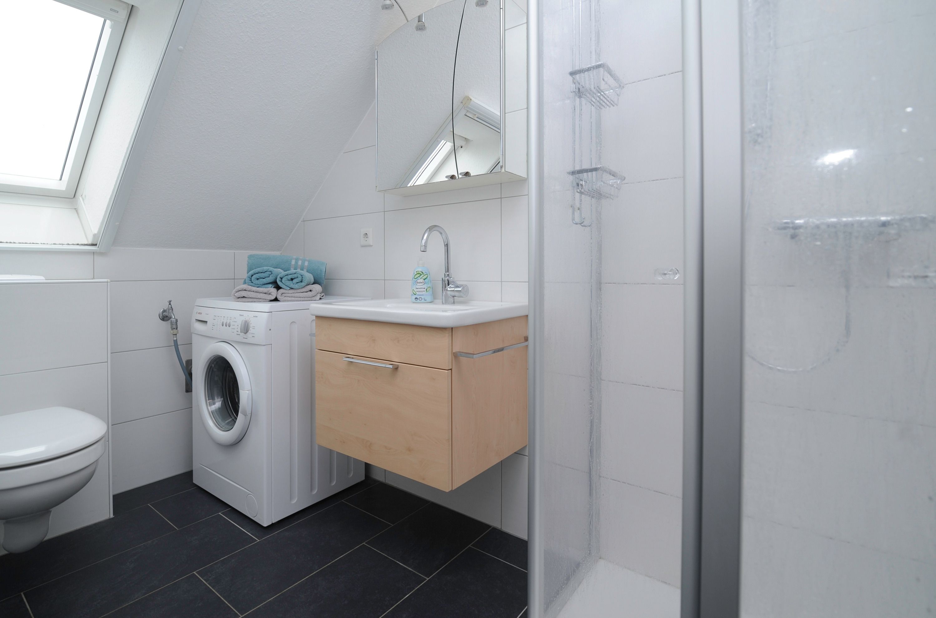 Das Badezimmer mit einem Velux-Fenster verfügt über eine Dusche mit niedrigem Einstieg, Waschtisch und WC. Dort befindet sich auch die Waschmaschine (5 kg).