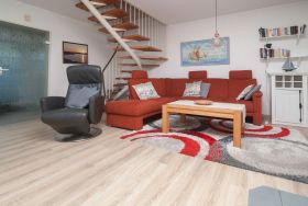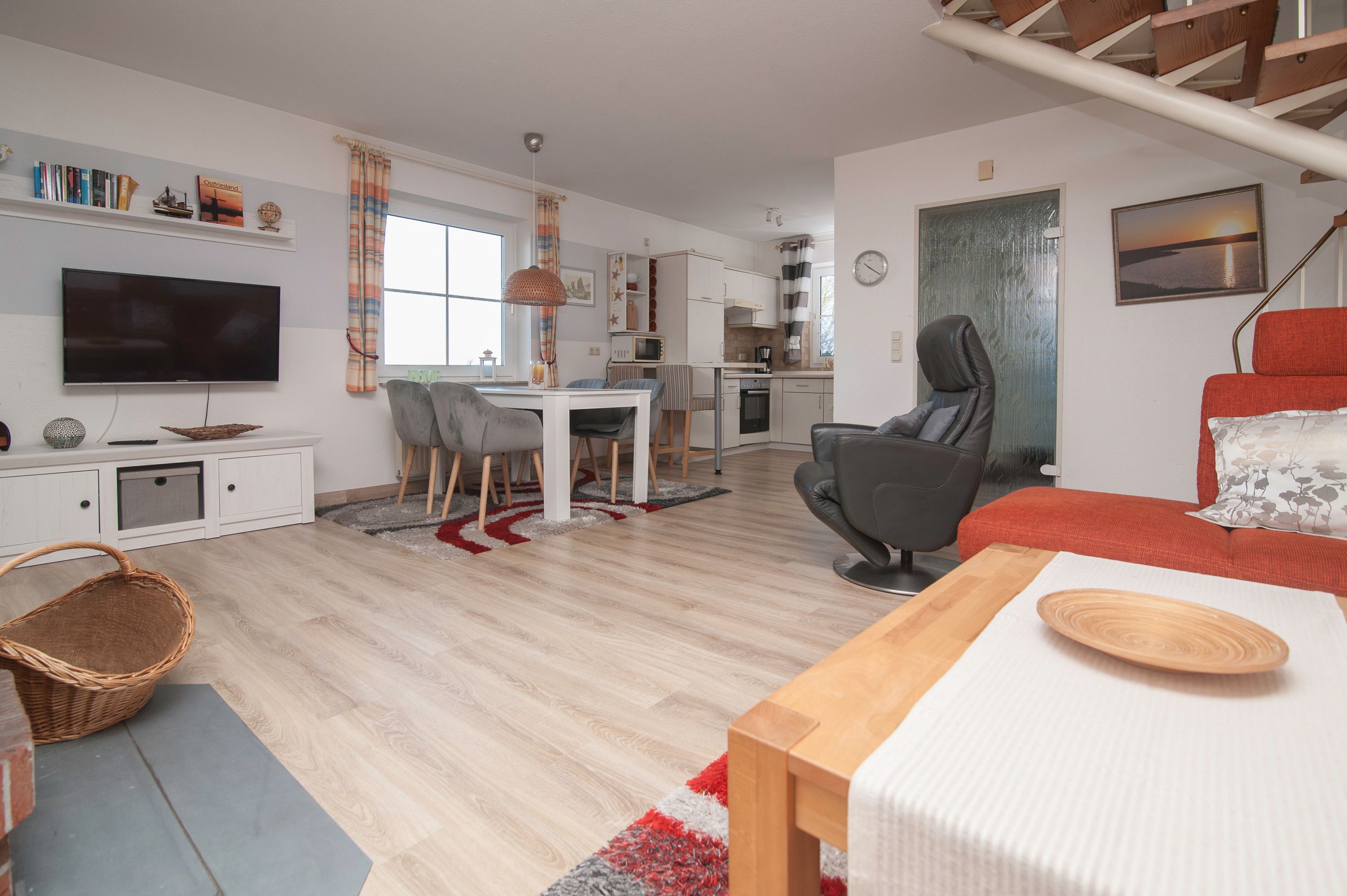 Geschmackvoll gestalteter Wohnraum mit 43 Grundig HD LCD TV , Sitzgruppe und einem bequemen Relax-Sessel, Essplatz für 4 Personen, ein DSL WLAN-Gastzugang ist vorhanden. Ein Kamin sorgt in der kalten Jahreszeit für gemütliche Stunden im Kreis Ihrer Lieben. Die offen gestaltete Einbauküche ist komplett ausgestattet: Herd mit Cerankochfeld, Dunstabzugshaube, Mikrowelle, Geschirrspüler, Kühlschrank mit Gefrierfach, Filterkaffeemaschine, Toaster und vielem mehr.