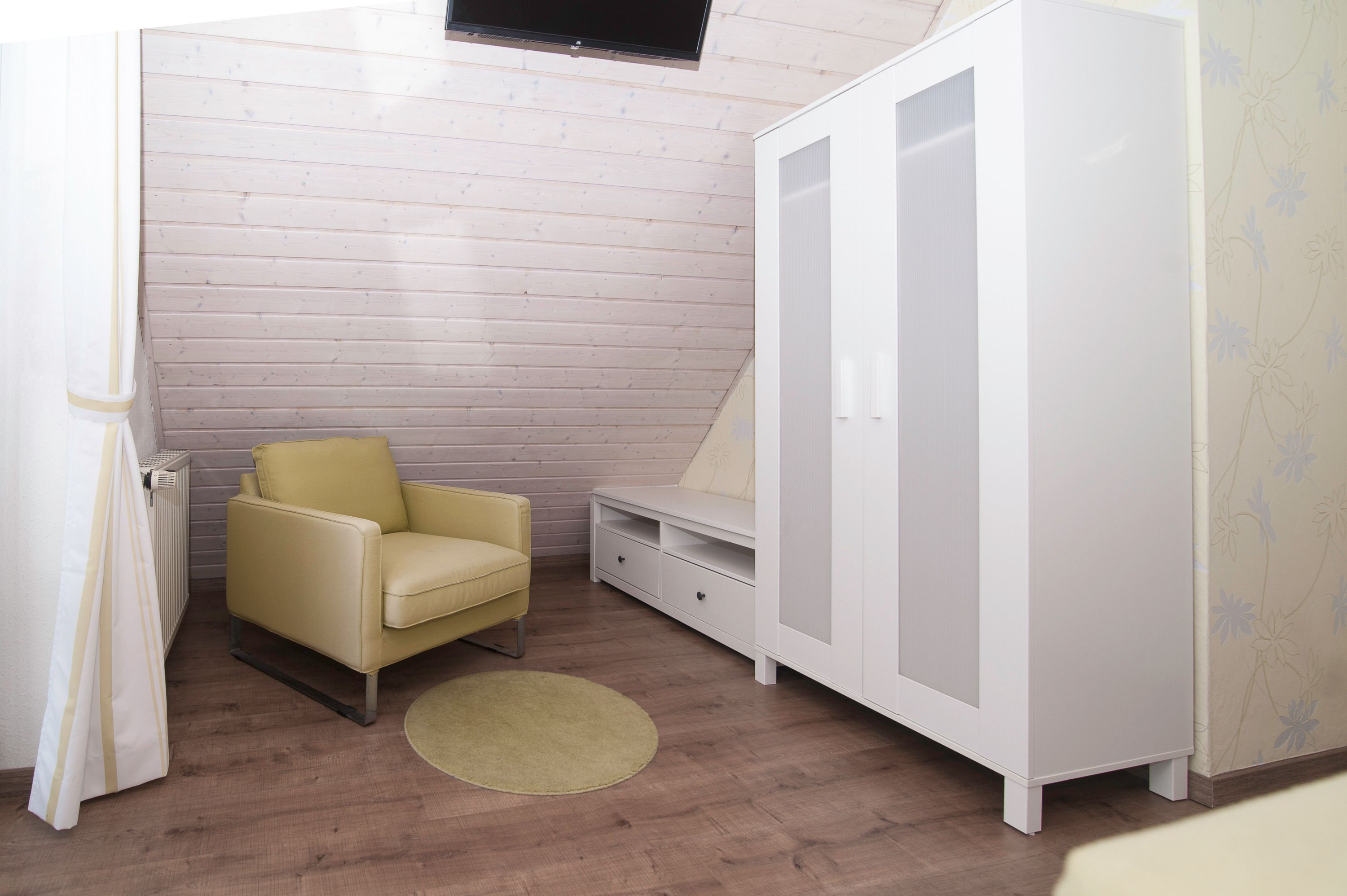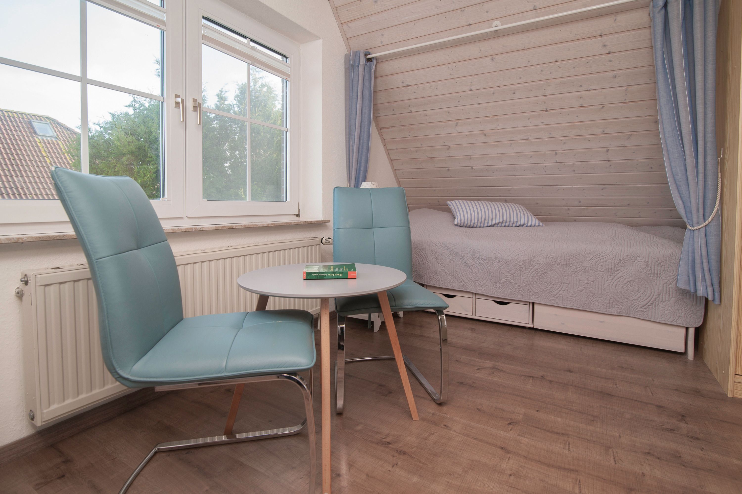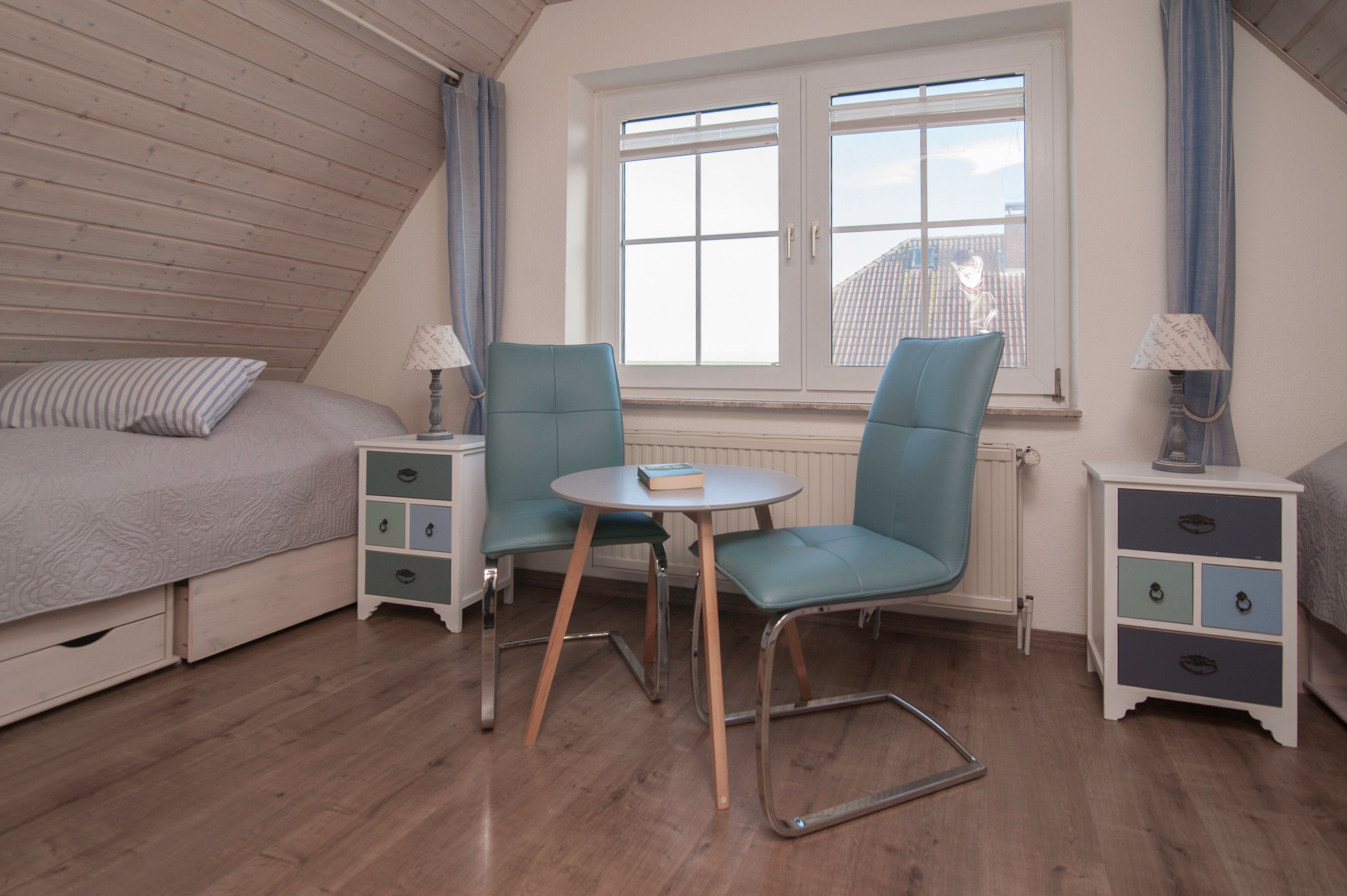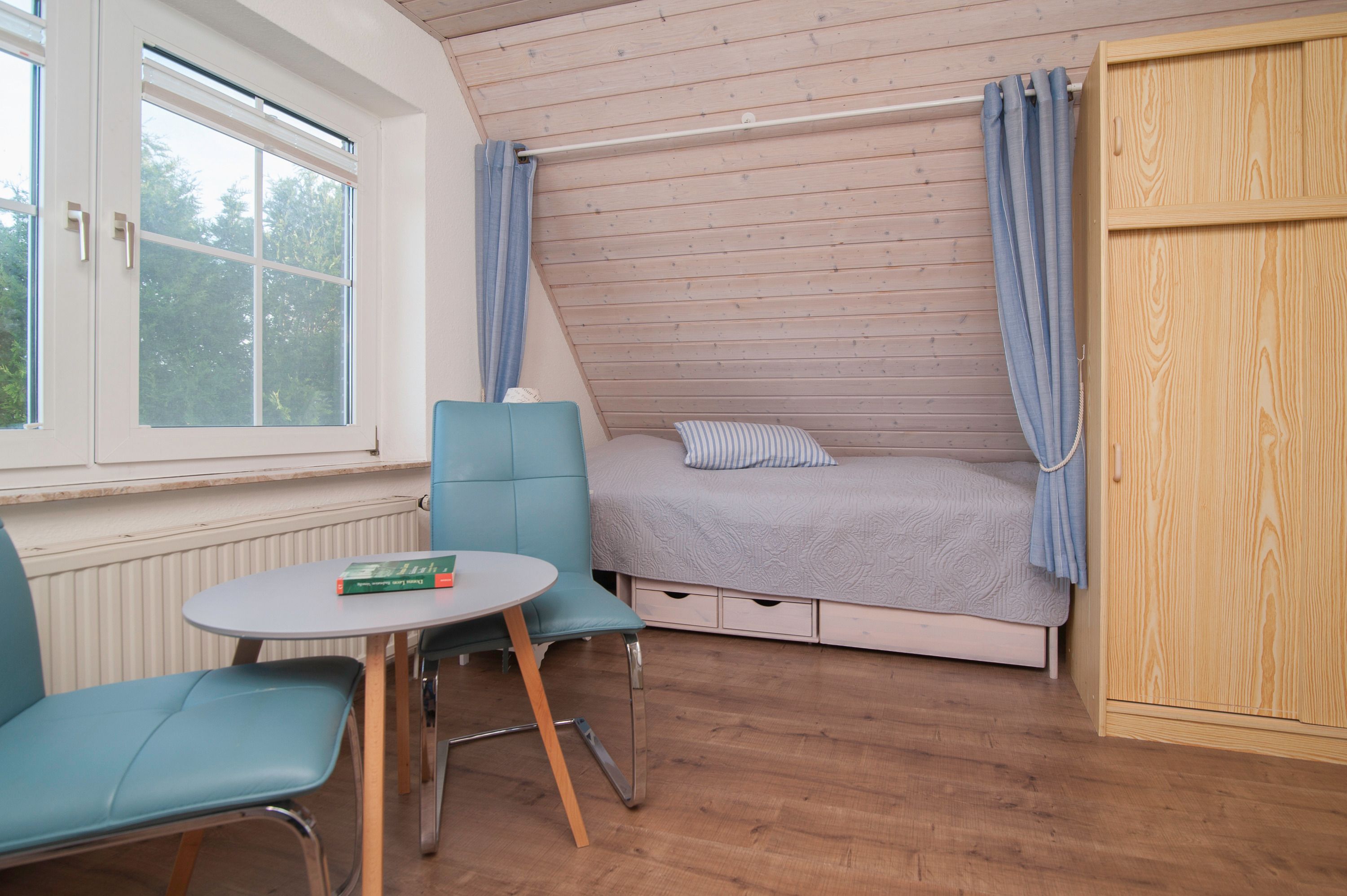 Im Obergeschoss erwarten Sie zwei liebevoll eingerichtete Schlafzimmer. Ein Schlafzimmer mit Doppelbett (Bodyguard Matratzen 90 x 200 cm mit Topper) und 32JTC LED HD-TV und ein weiteres Schlafzimmer mit zwei Einzelbetten (90 x 200 cm). Das Badezimmer mit Dusche, Waschbecken und WC ist ebenfalls Obergeschoss.