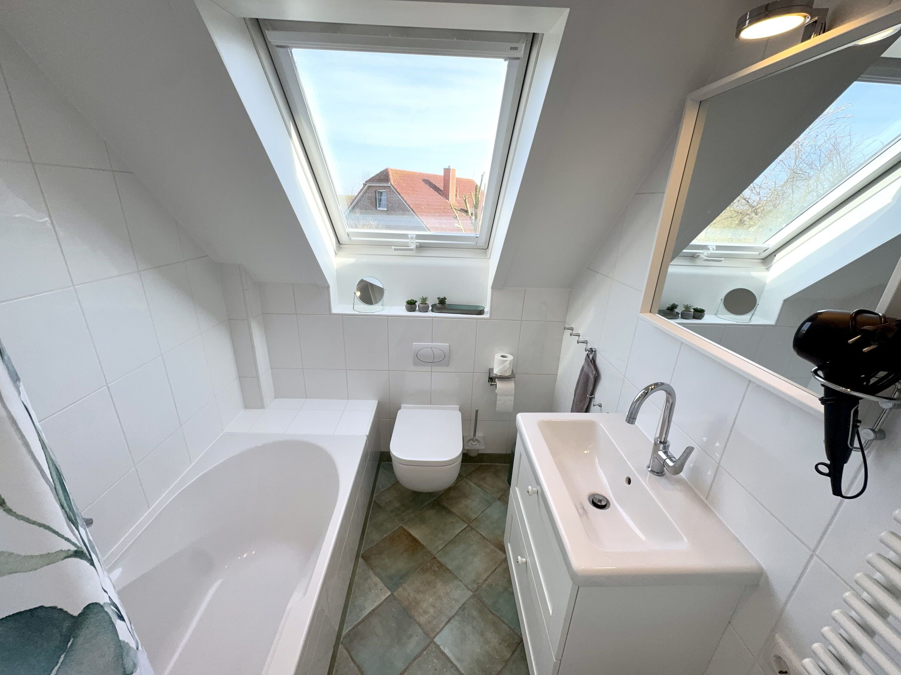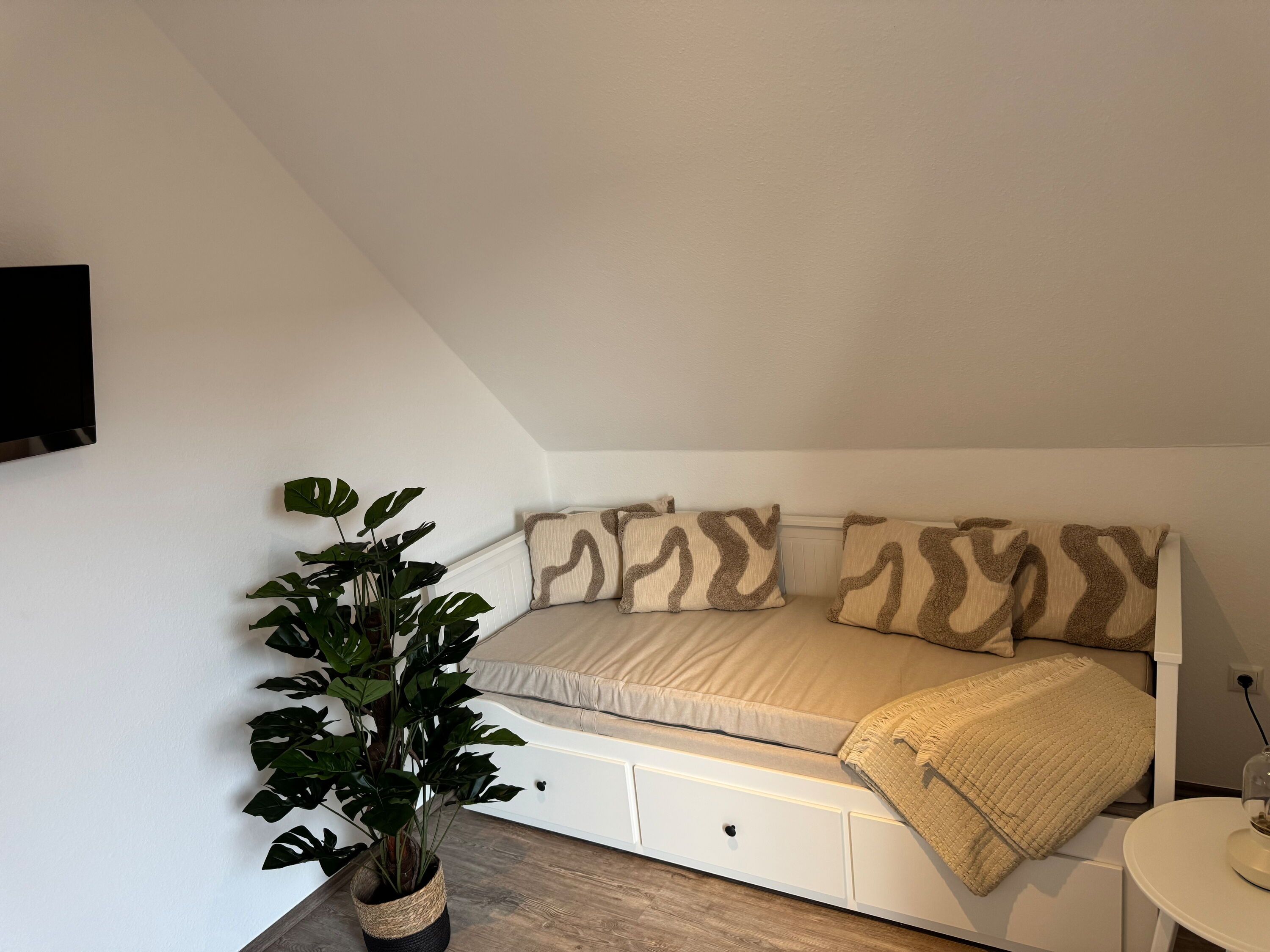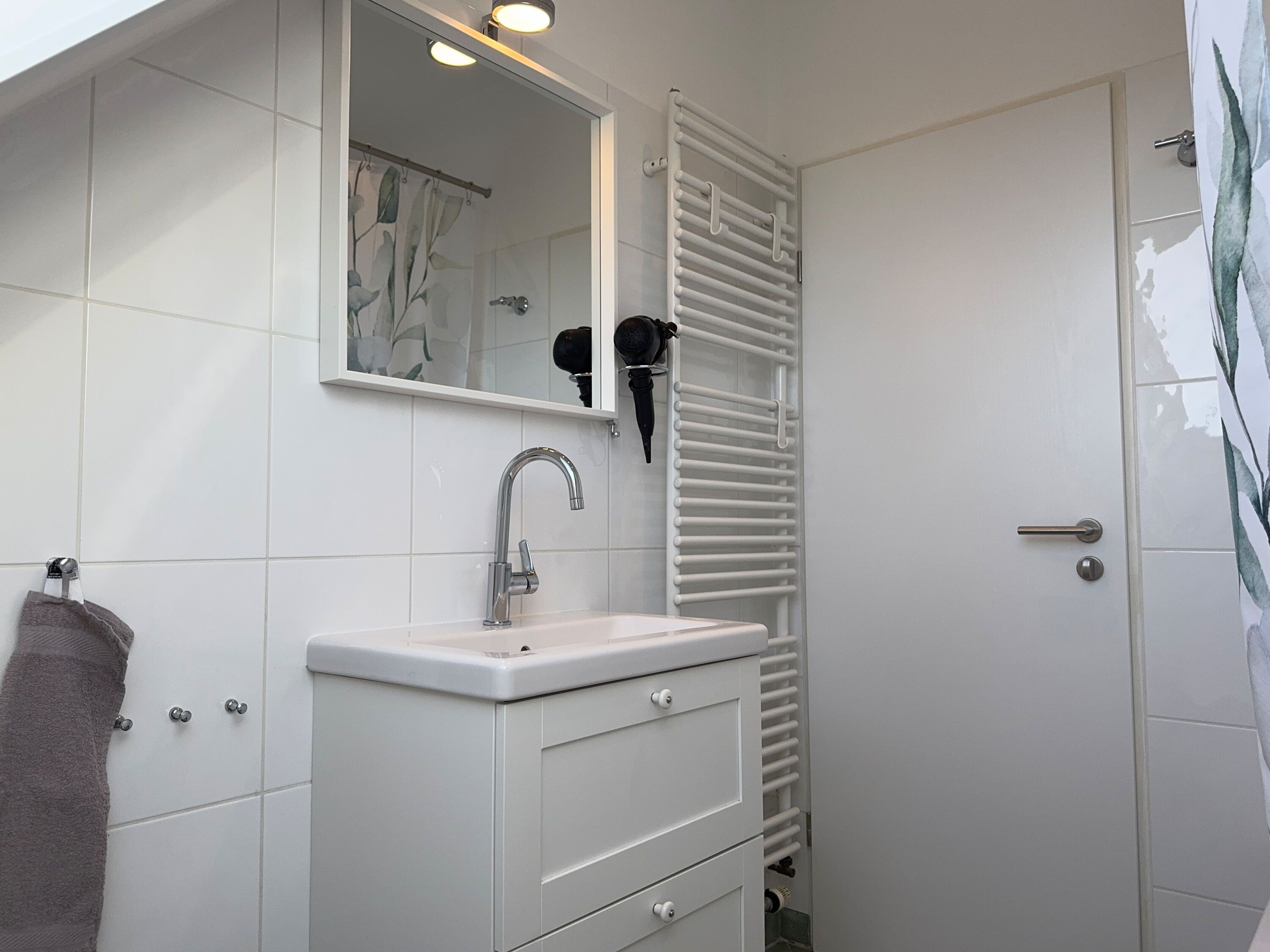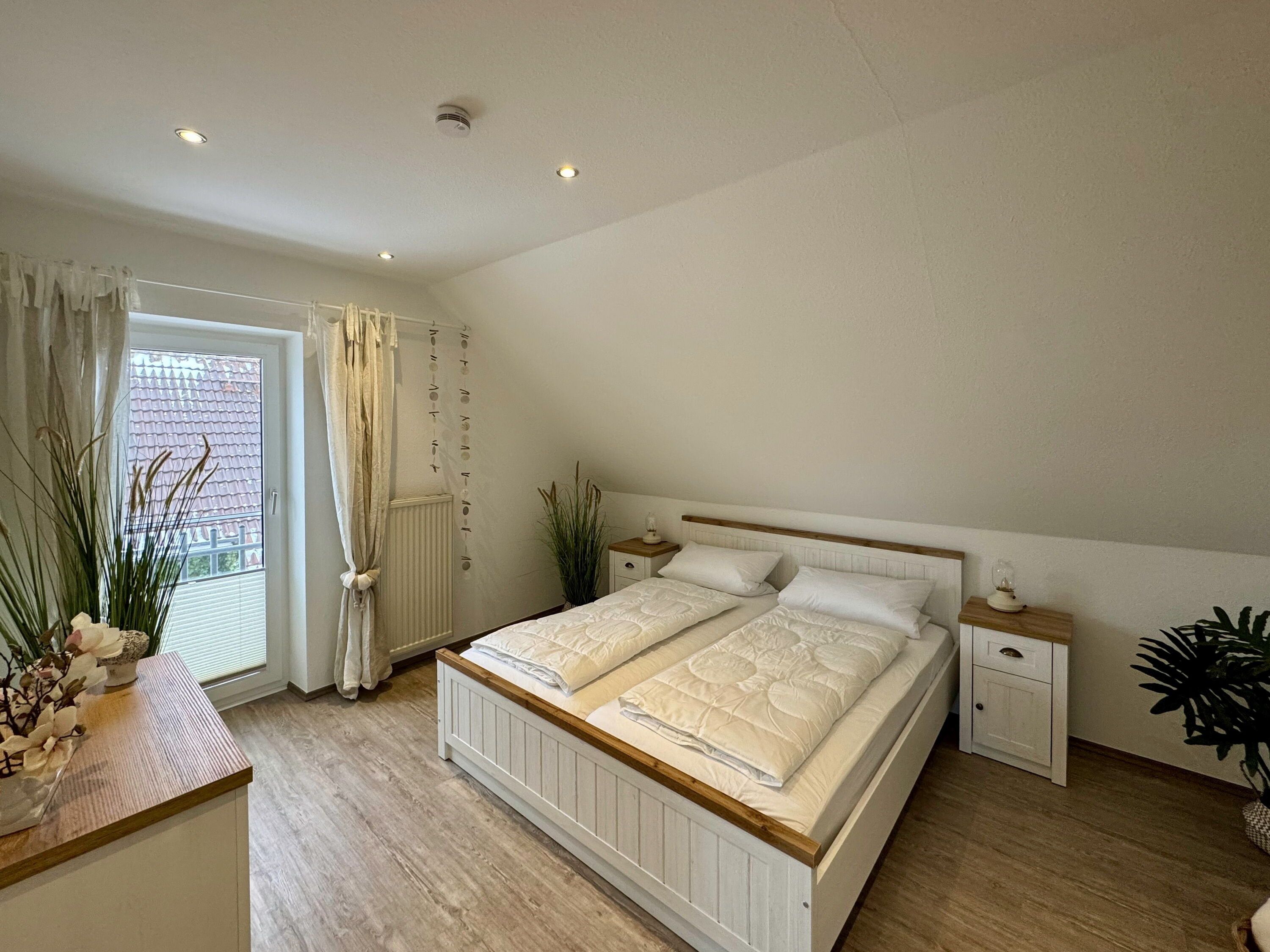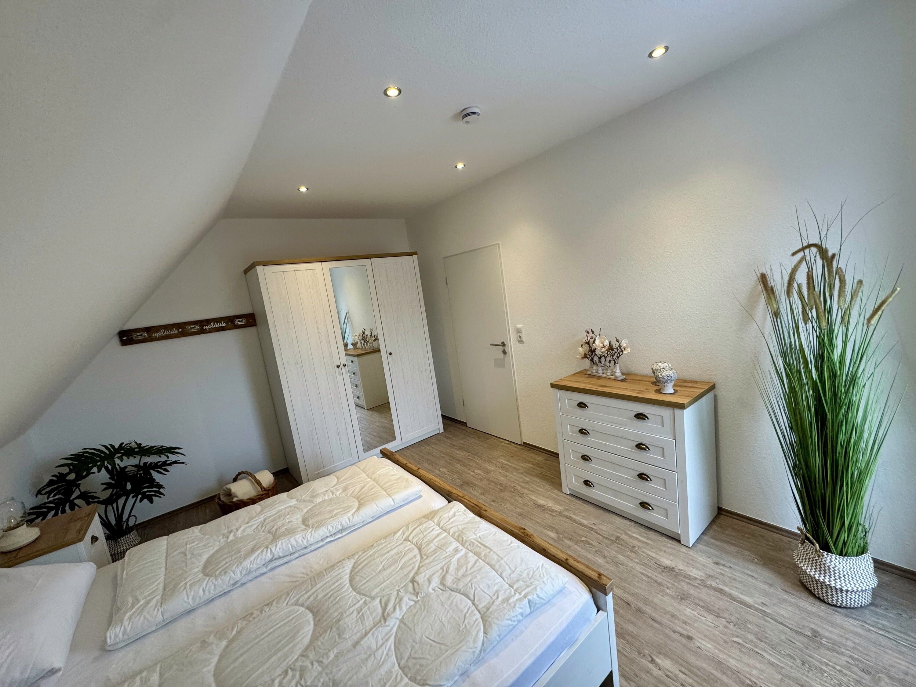 In der Wohnung gibt es zwei Schlafzimmer: eins mit einem Doppelbett, Kommode sowie Kleiderschrank und eins mit einem Einzelbett mit Lattenrost und Kleiderschrank. Im zweiten Schlafzimmer gibt es außerdem einen 26 Sony LCD-TV. Die Diele und das Badezimmer mit einer tiefgelegten Badewanne, die auch zum Duschen genutzt werden kann, bietet ausreichend Platz und eine behagliche Atmosphäre. Ein Föhn ist vorhanden. Bügelbrett, Bügeleisen und ein Wäscheständer stehen ebenfalls zur Verfügung. An den Fenstern befinden sich Insektenschutzgitter.