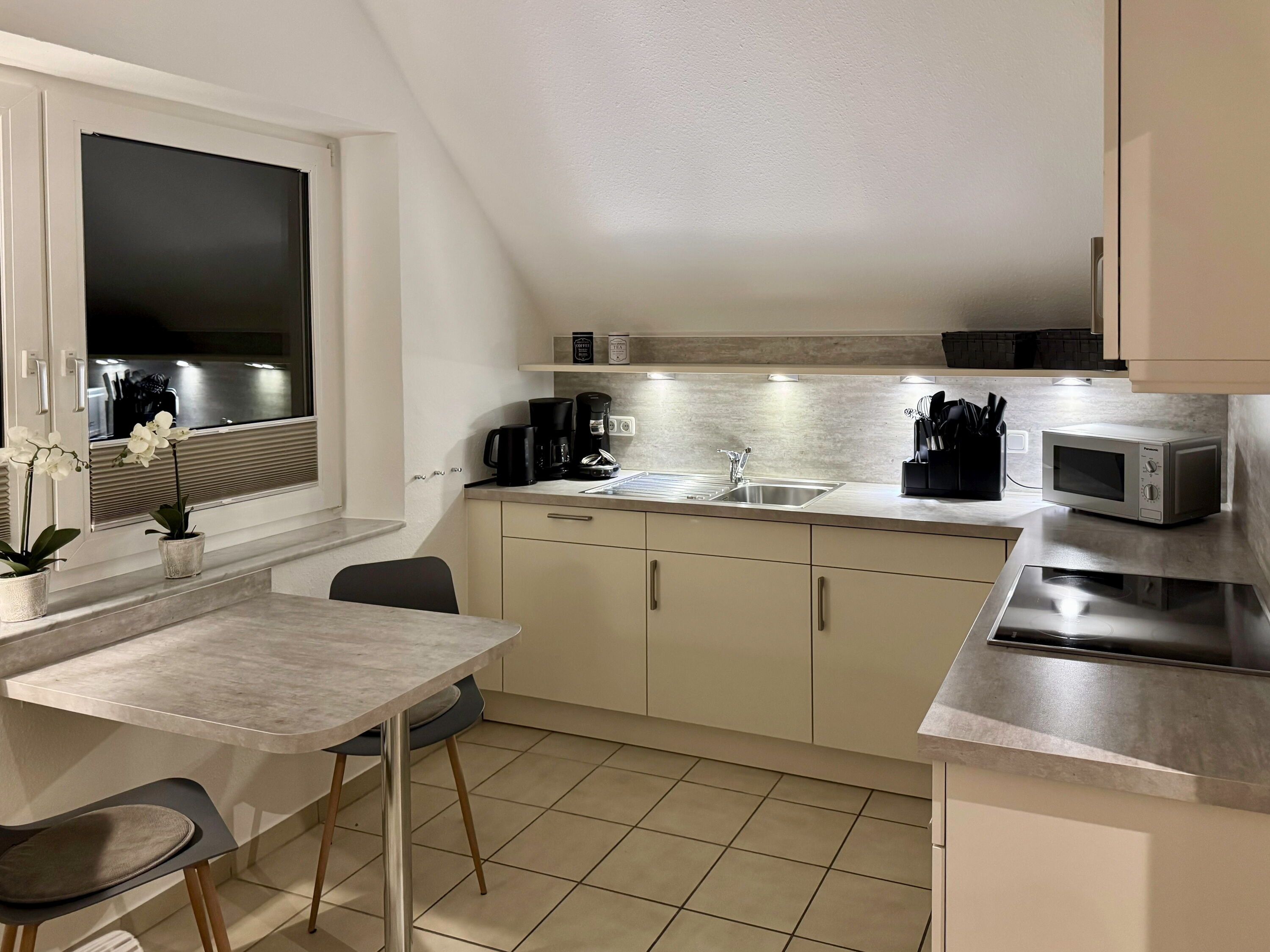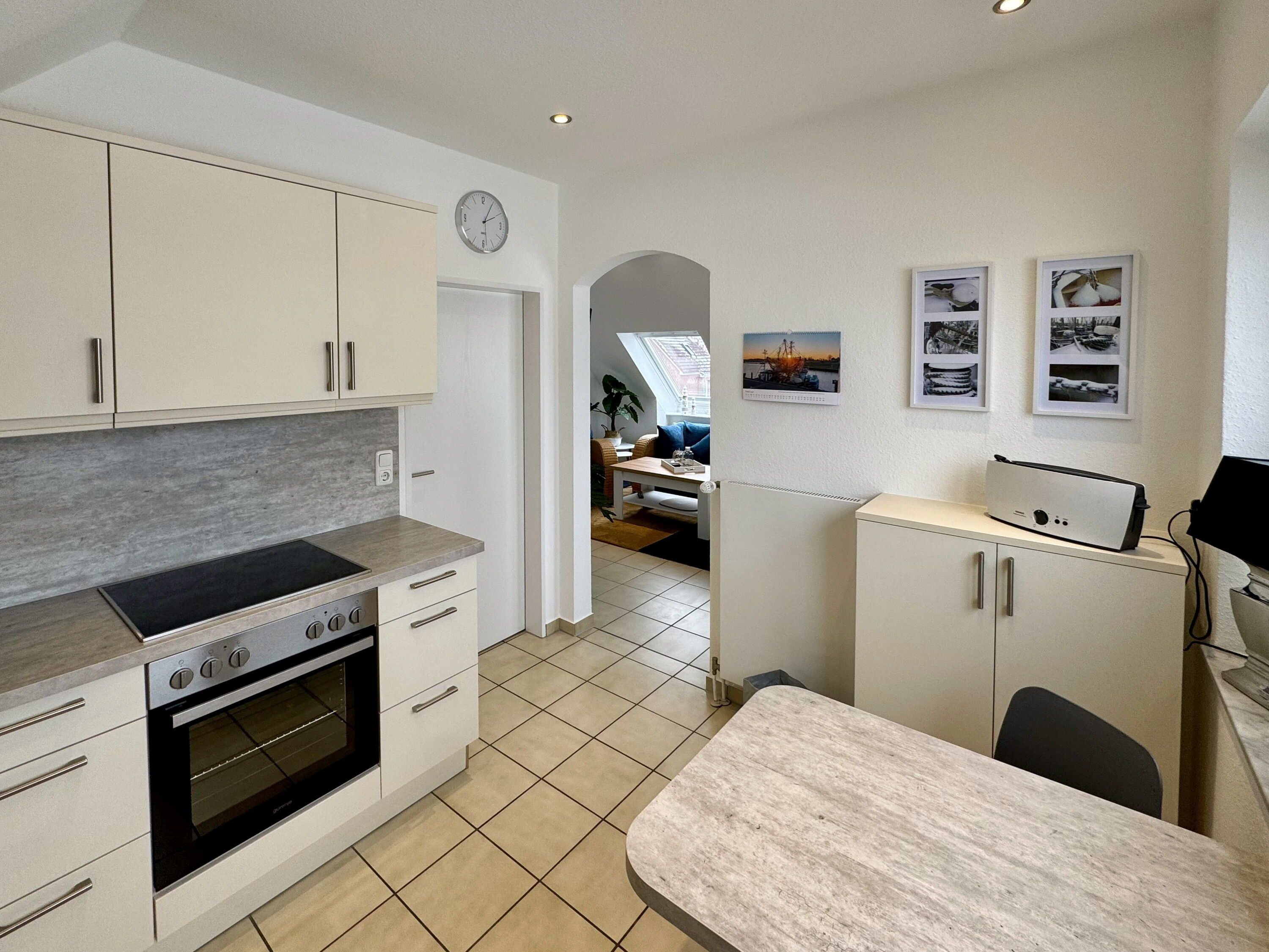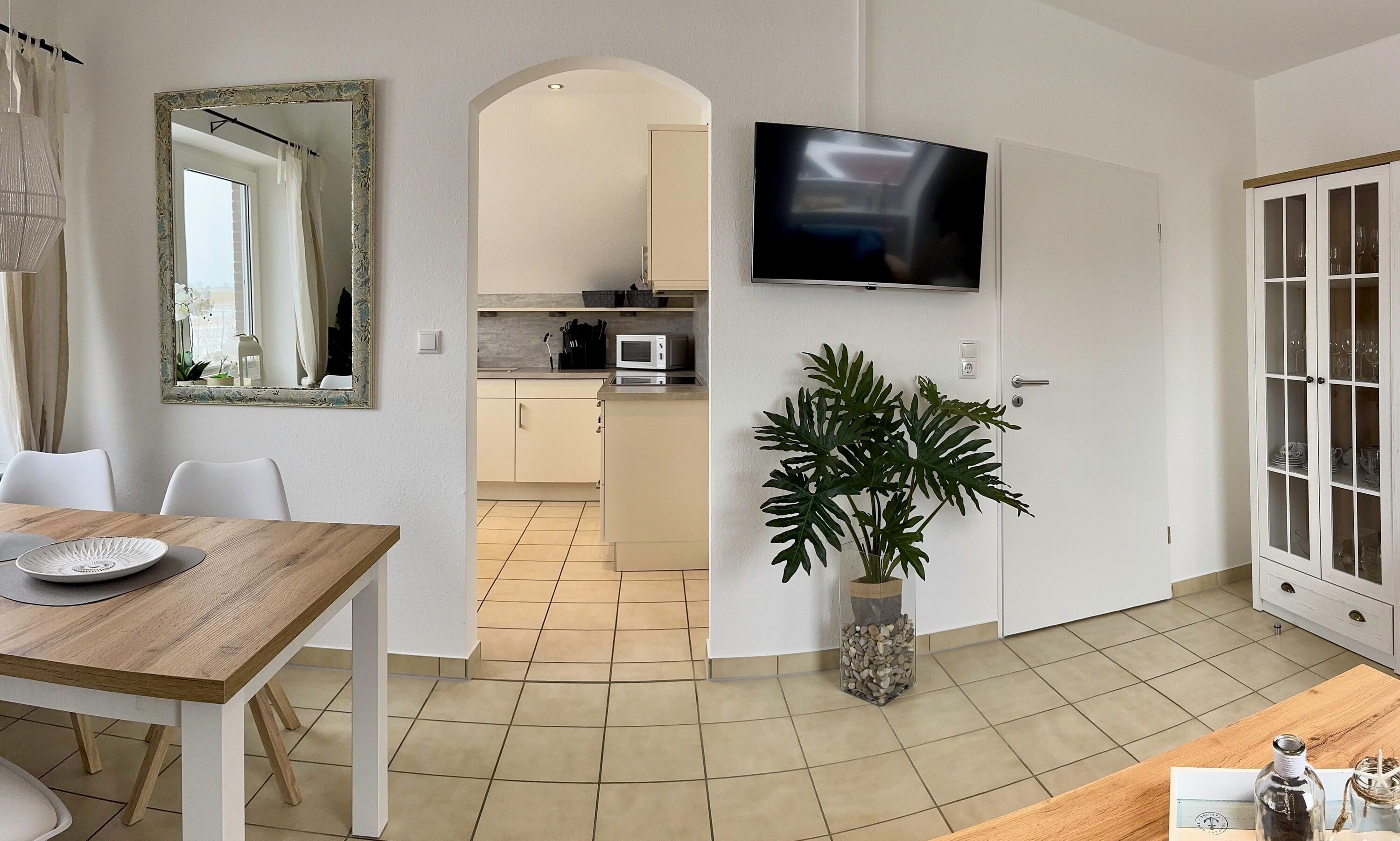 Der großzügige Wohnraum verfügt über eine Polstersitzgruppe mit einem 32 Panasonic Full HD LCD-TV, Internetradio und einem Essplatz für 4 Personen. Die Einbauküche ist komplett ausgestattet mit einem Herd inklusive Cerankochfeld, Mikrowelle, Geschirrspüler, Kühlschrank mit Gefrierfach, Filterkaffeemaschine, Senseo Pad-Maschine, Wasserkocher, Toaster, Eierkocher und vielem mehr. Wer Lust hat im Urlaub zu Backen findet hier Backutensilien.