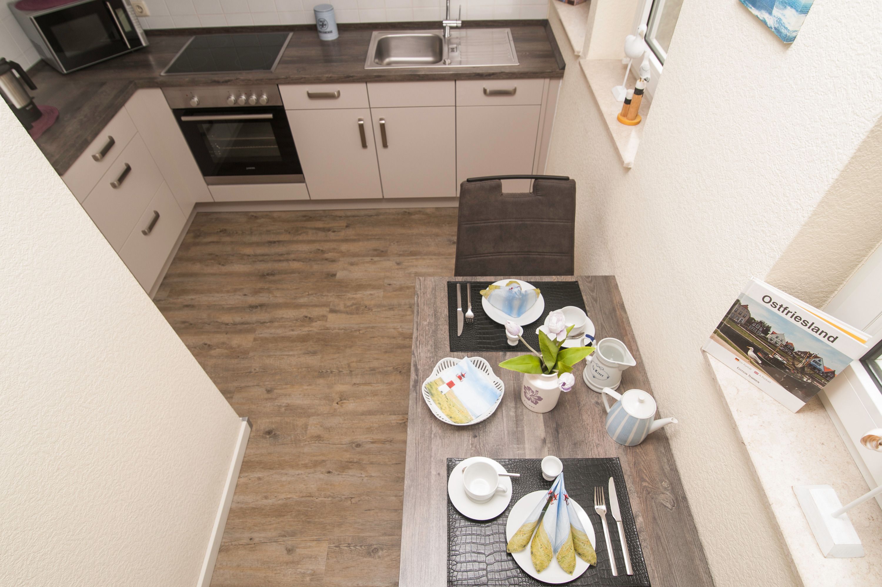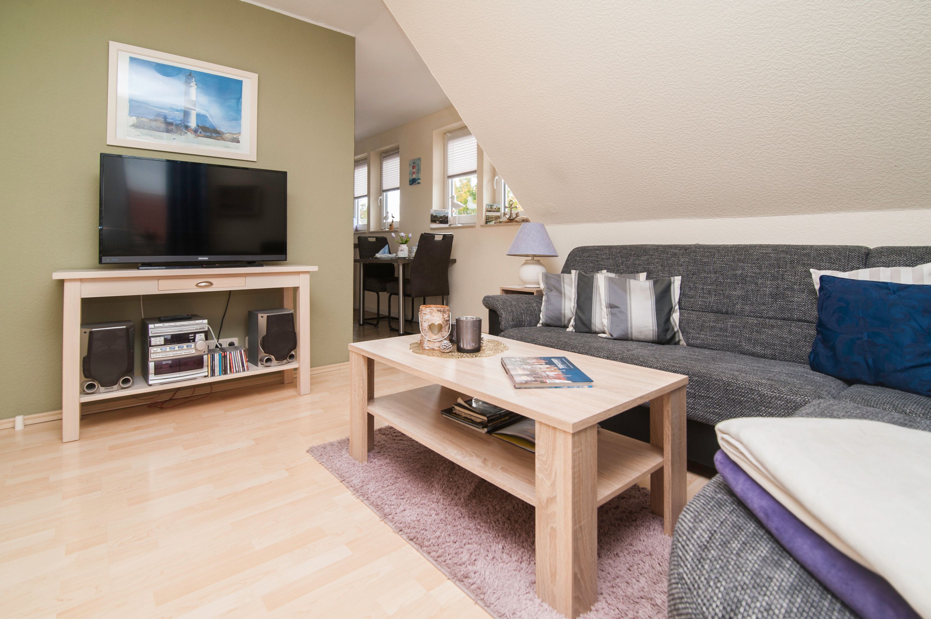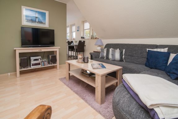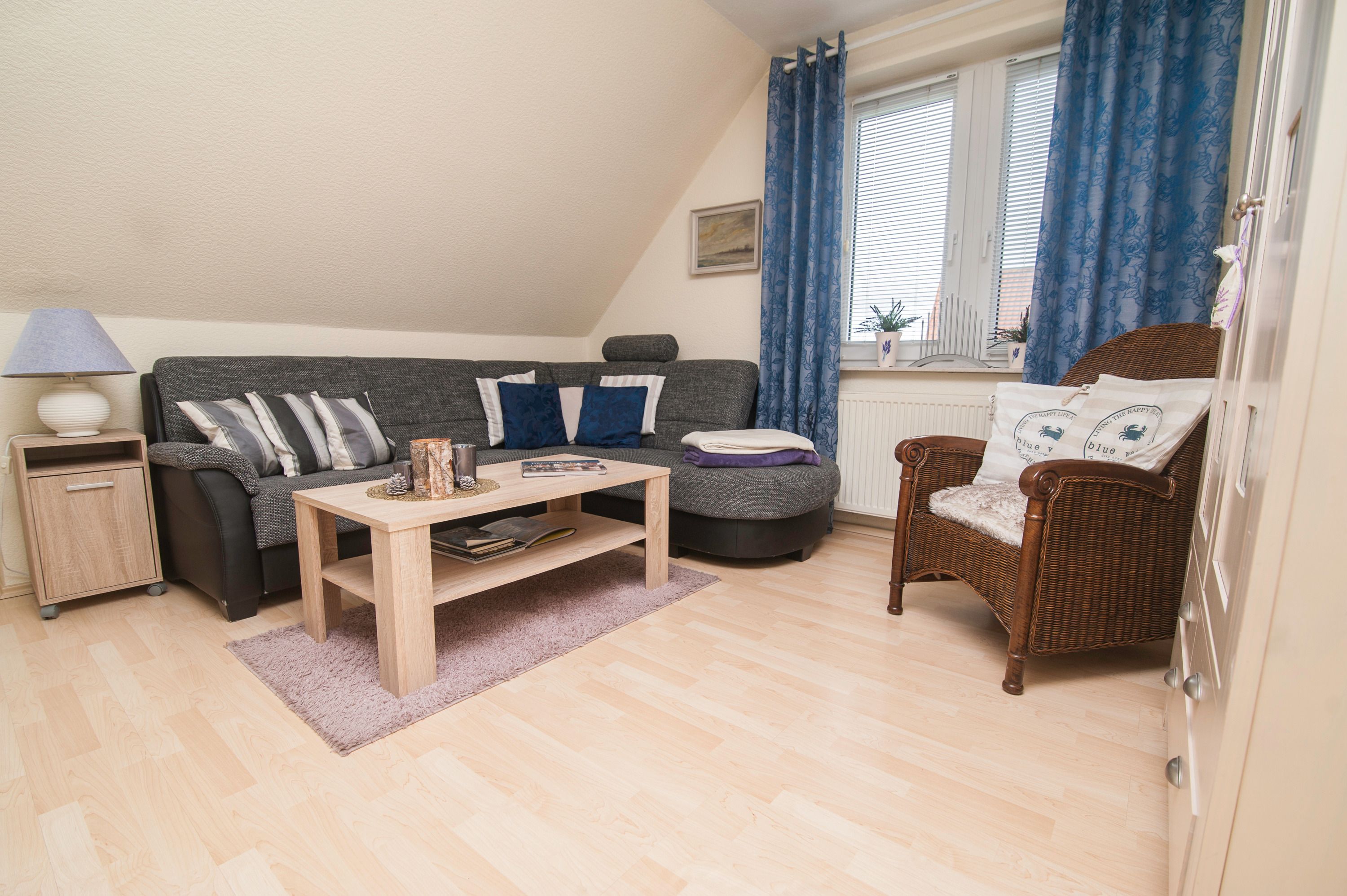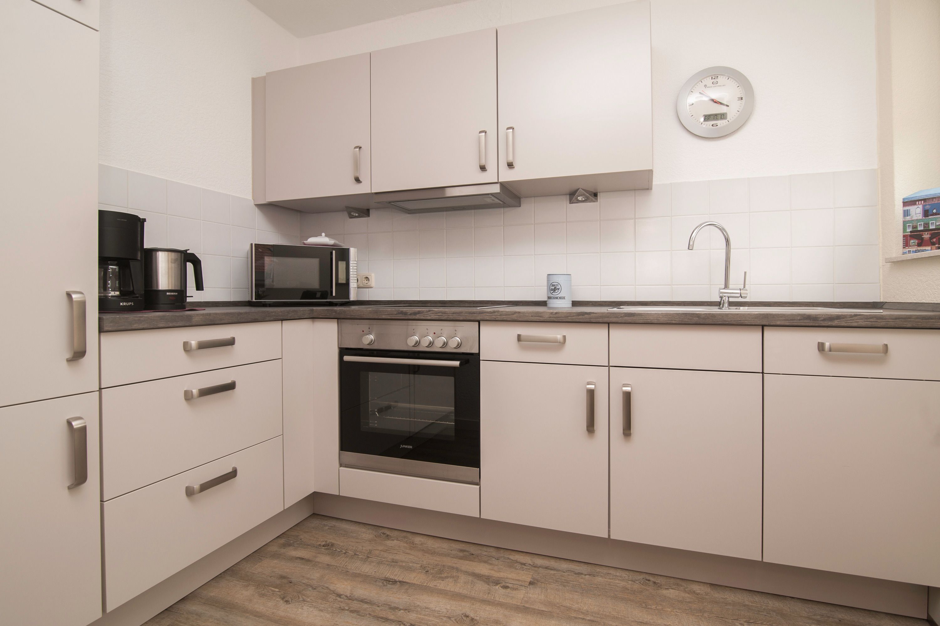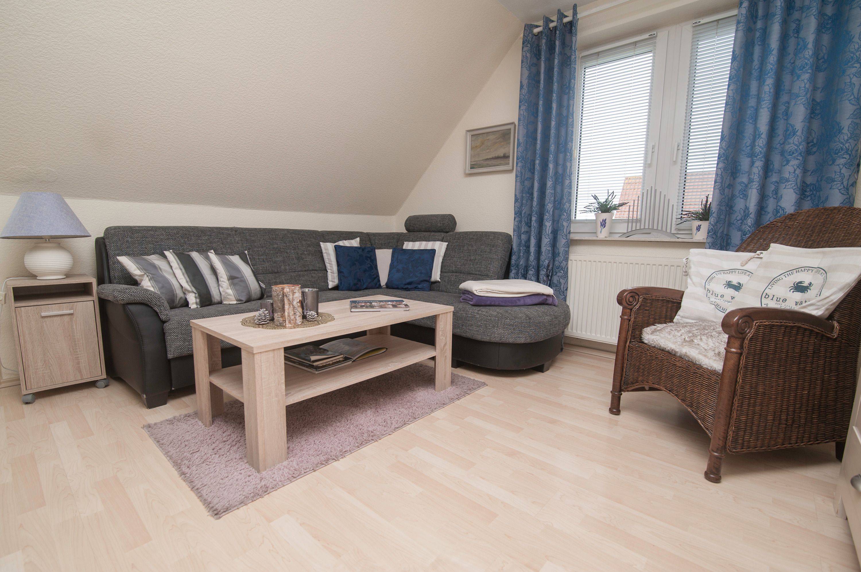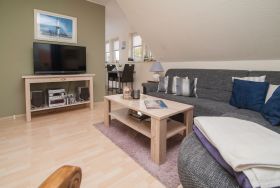 Im Wohnzimmer mit Ecksofa und 40 Grundig Full HD LCD-TV lassen sich gemütliche Fernsehabende verbringen. Eine Mini Stereoanlage mit CD-Spieler und ein DSL WLAN-Gastzugang stehen ebenfalls zur Verfügung. Ein einladender Essplatz für 2 Personen ist direkt neben der Einbauküche. Die Einbauküche ist komplett eingerichtet mit Herd und Cerankochfeld, Mikrowelle, Dunstabzugshaube, 45er Geschirrspüler, Filterkaffeemaschine, Eierkocher, Wasserkocher, Kühlschrank ohne Gefrierfach (bei Bedarf kann ein separater Gefrierschrank zur Verfügung gestellt werden). Das Schlafzimmer hat ein Doppelbett mit einer durchgehenden Matratze (1,60 x 2,00 m) und einem Kleiderschrank. Im Tageslichtbad mit Föhn, Dusche und WC befindet sich auch die Waschmaschine (5 kg). Ein kleiner Abstellraum beherbergt Bügelbrett, Bügeleisen sowie den Kondenstrockner. Insektenschutzgitter an den Fenstern sind vorhanden. Fahrräder können in der Garage untergestellt und geladen werden.