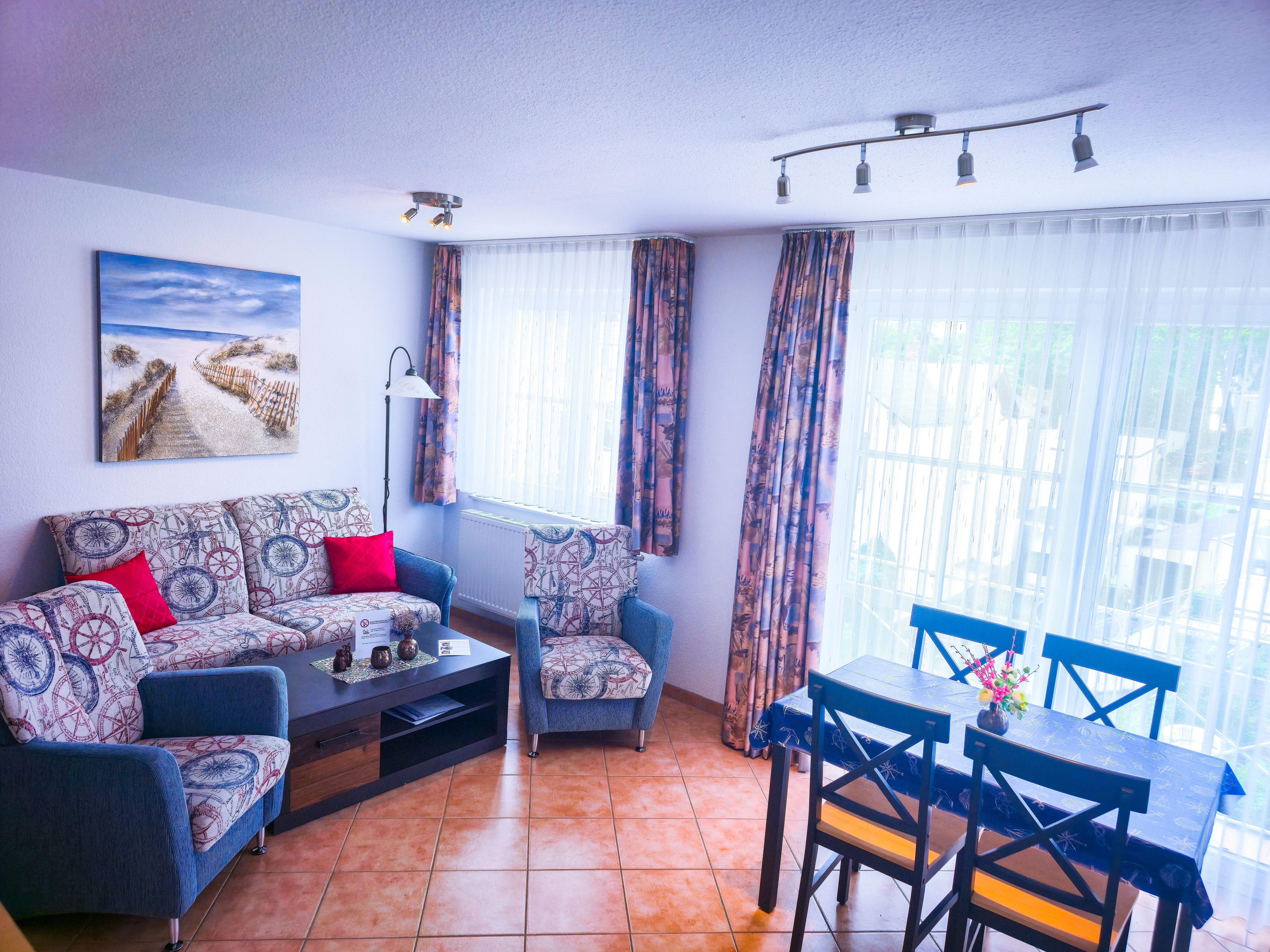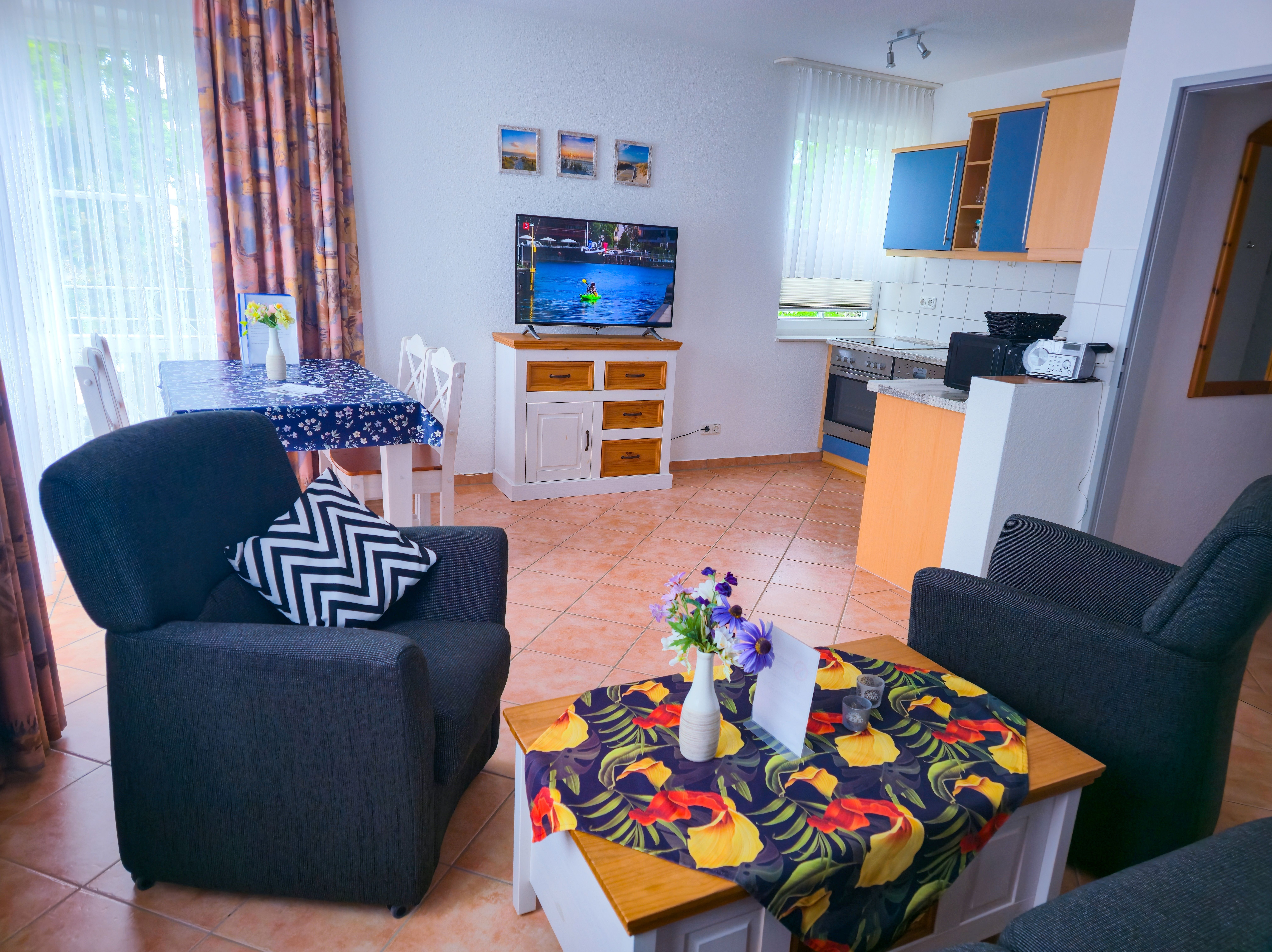 Die 3 Raum Appartements der Kategorie A sind ca. 50 qm groß und befinden sich im 1. und 2. Obergeschoß. Es stehen Ihnen ein Wohnraum mit Küche, ein Badezimmer mit Dusche mit WC sowie zwei Schlafzimmer zur Verfügung. In den Schlafräumen steht jeweils ein Doppelbett mit zwei Matrazen, im Wohnraum können zusätzlich bis zu zwei Personen auf einer kombinierten Wohn- / Schlafcouch übernachten. Für ein Kleinkind bis 2 Jahre stellen wir Ihnen gerne ein Reisebettchen in die Wohnung (einmalig 15 ).